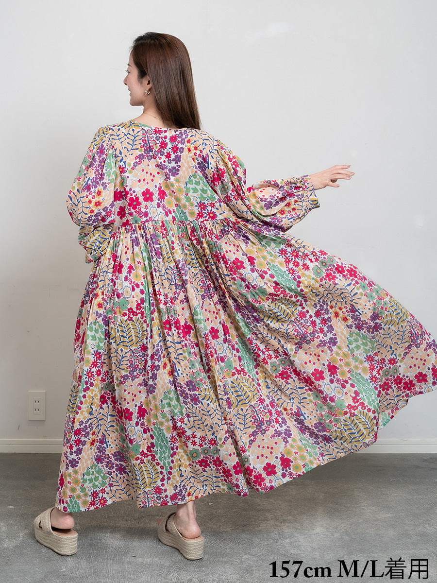 Eighty Seven(エイティセブン)インド綿フレア長袖ワンピース/カラフル花柄