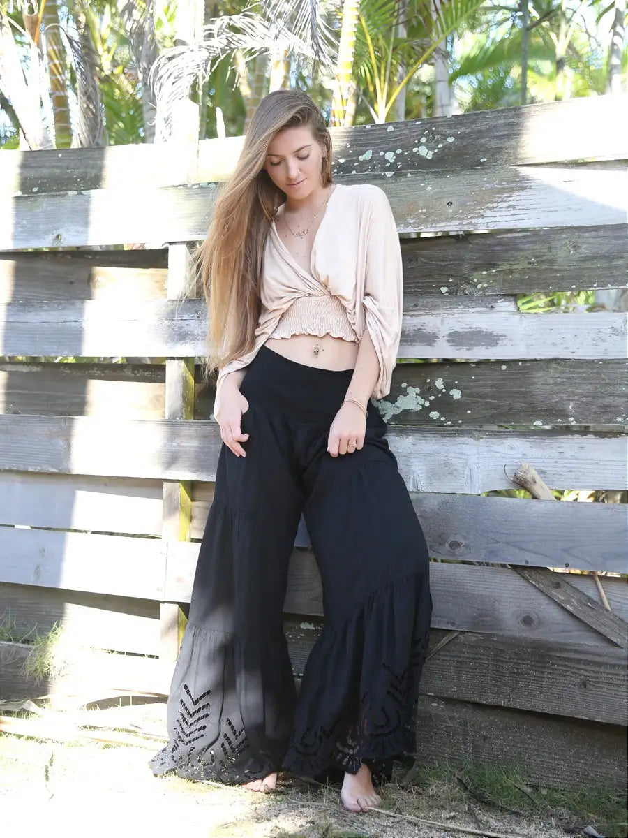 シンプルなブラックパンツですので、オフショルのトップスなどとのコーデでビーチ・リゾートファッションをお楽しみ下さい。