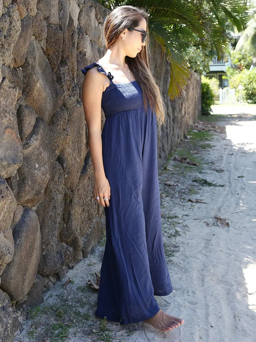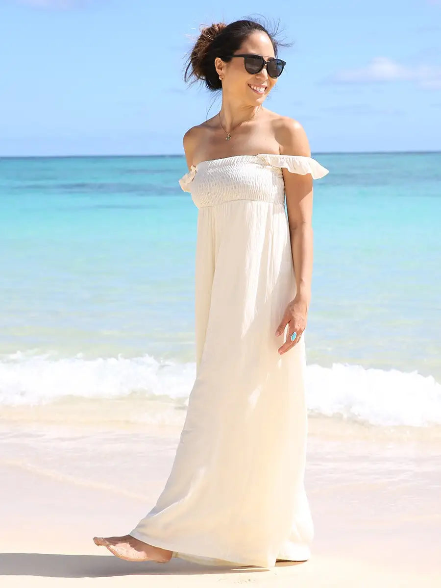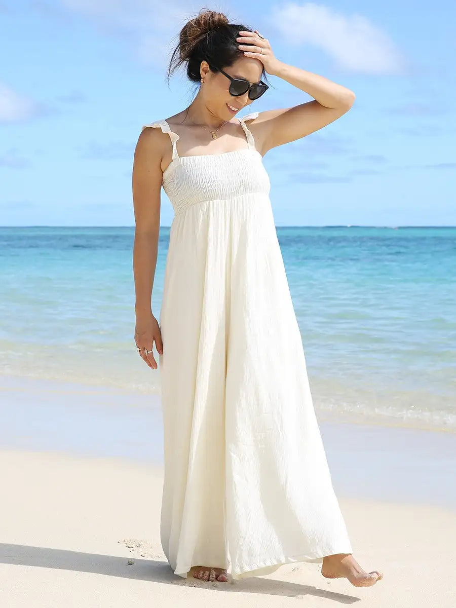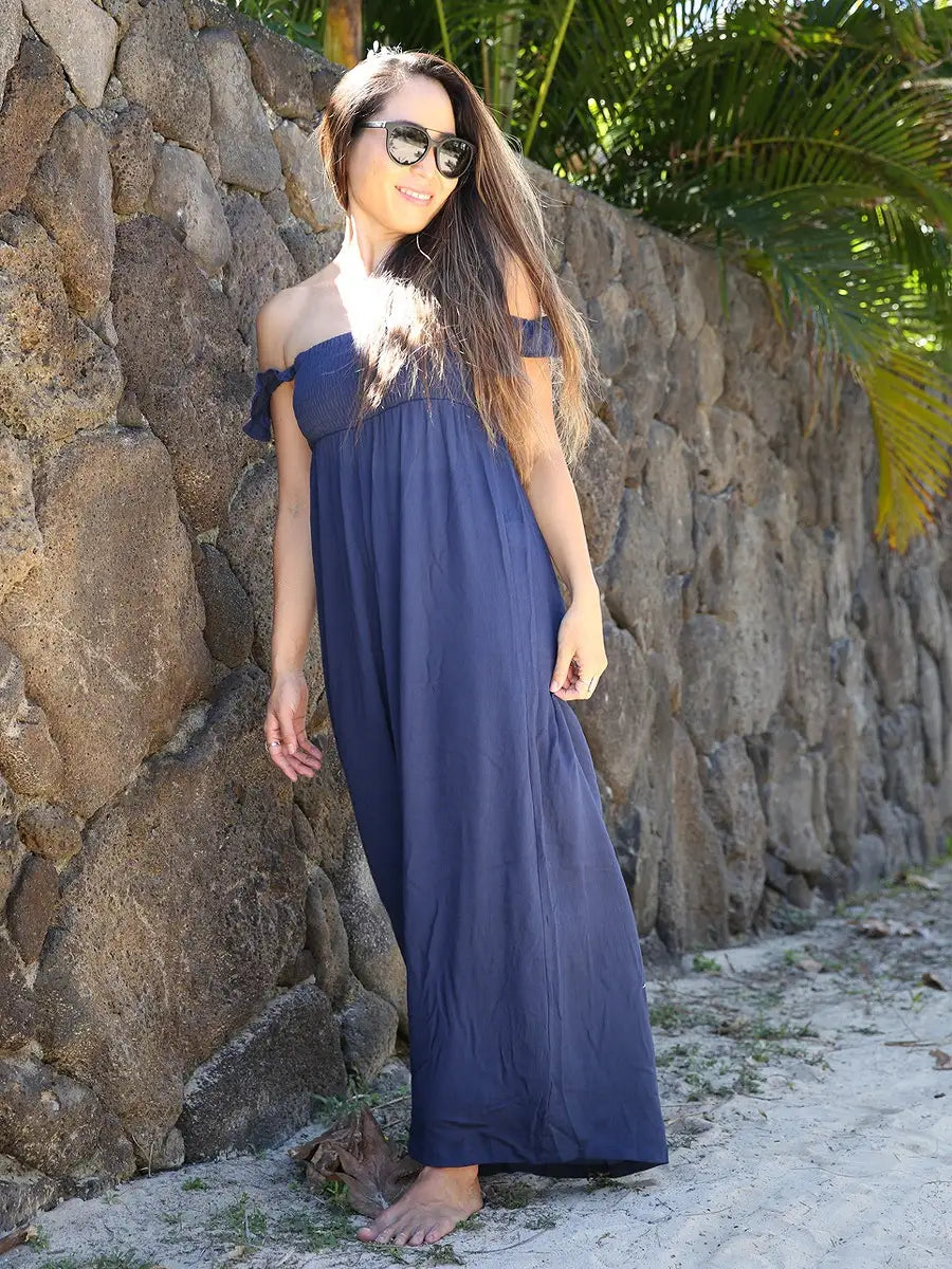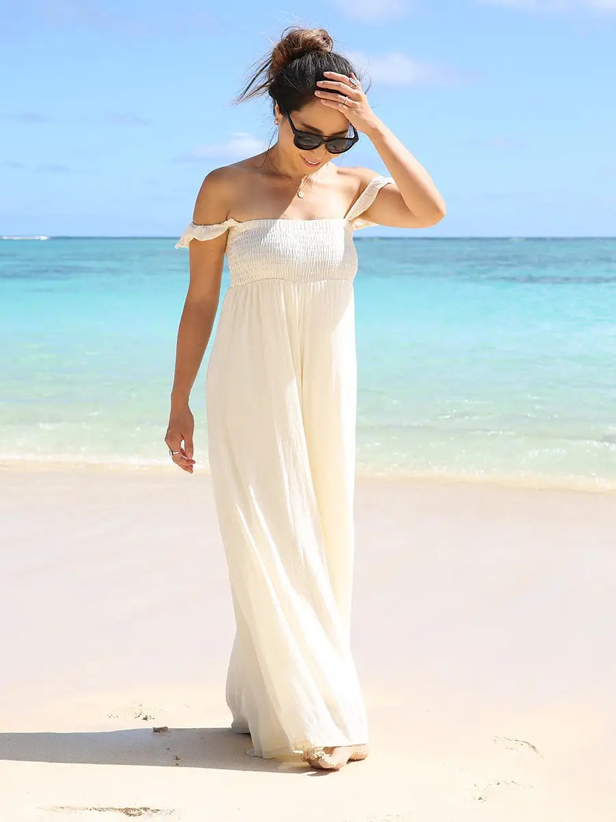 軽くて涼しげな「レーヨン」生地を採用したロング丈ロンパースはオフショルスタイルとショルダースタイルを楽しんで頂けます。