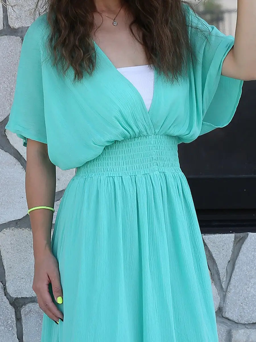 胸元が深いVネックになっていて、デコルテをきれいに演出してくれるマキシワンピです。