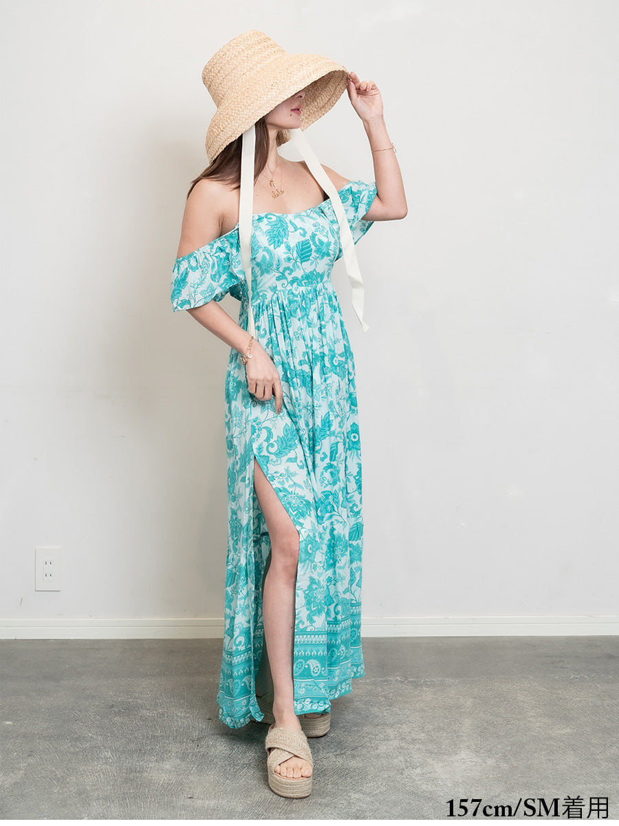 リゾート感溢れる爽やかな花柄ターコイズリゾートワンピース。