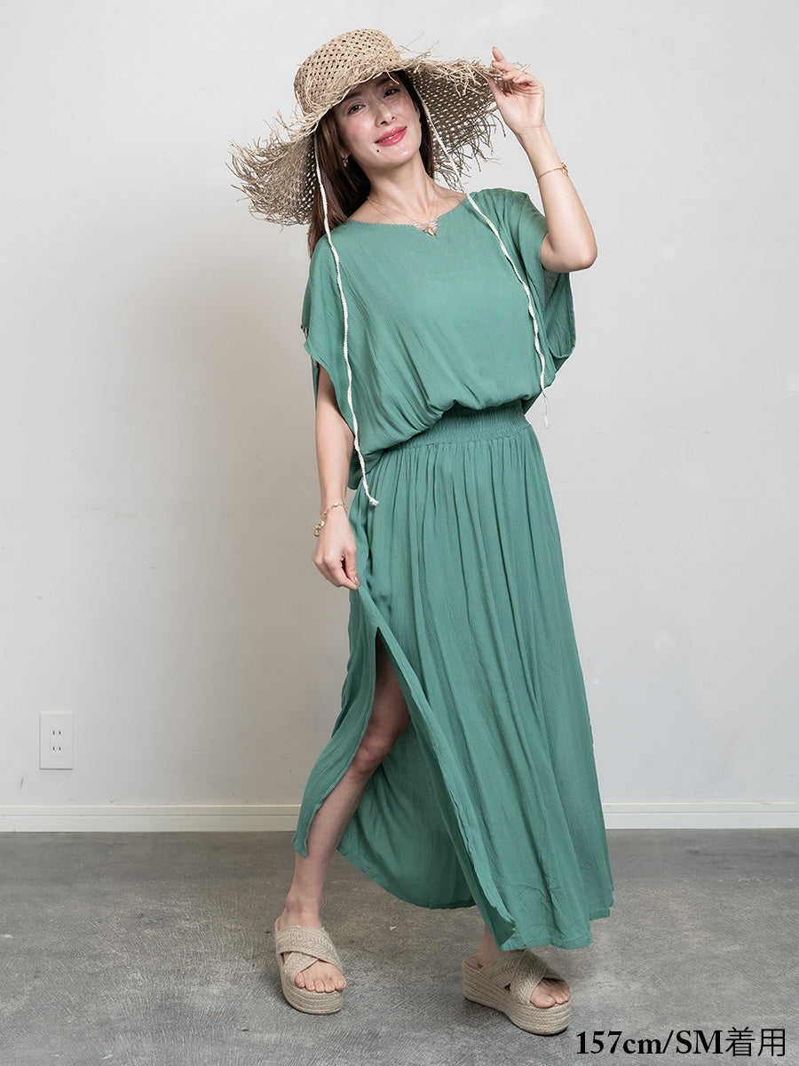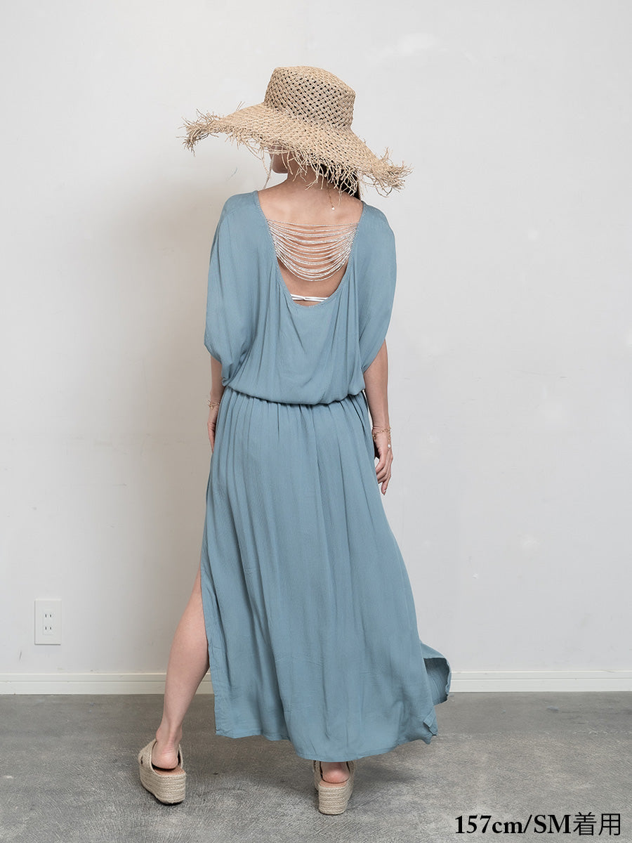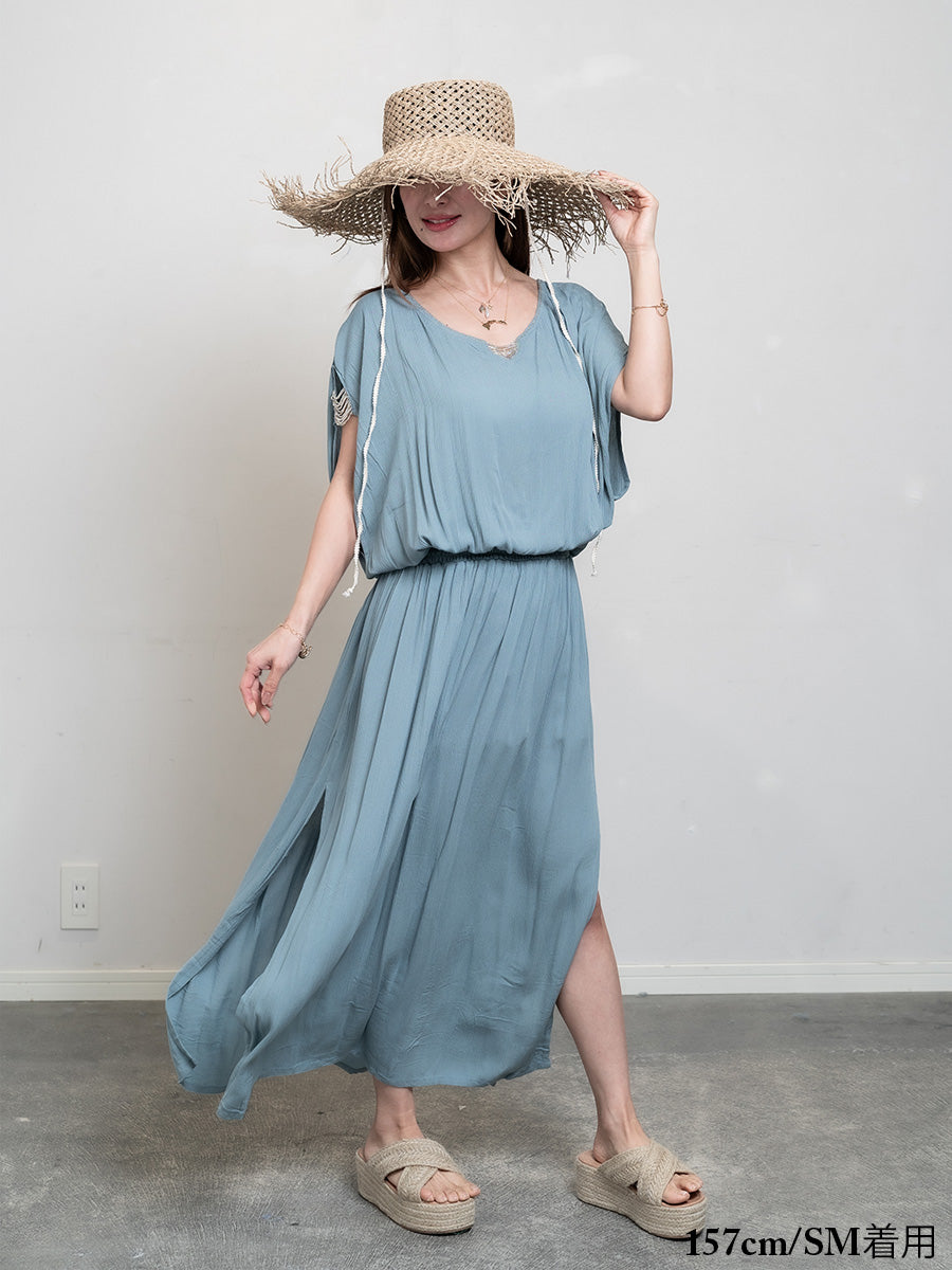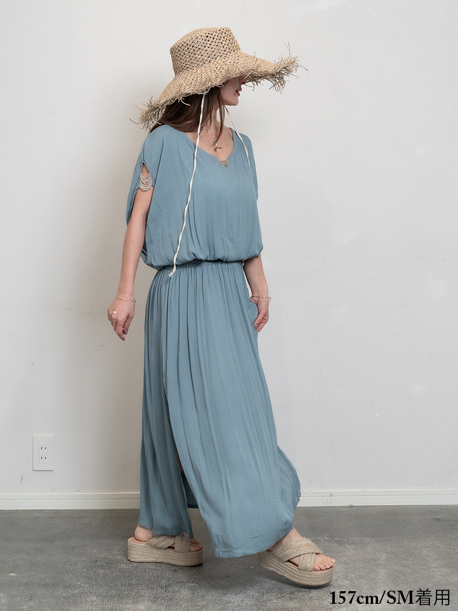 LAUT BLUE(ラウトブルー)クリンクルフレンチスリーブビーズマキシワンピース