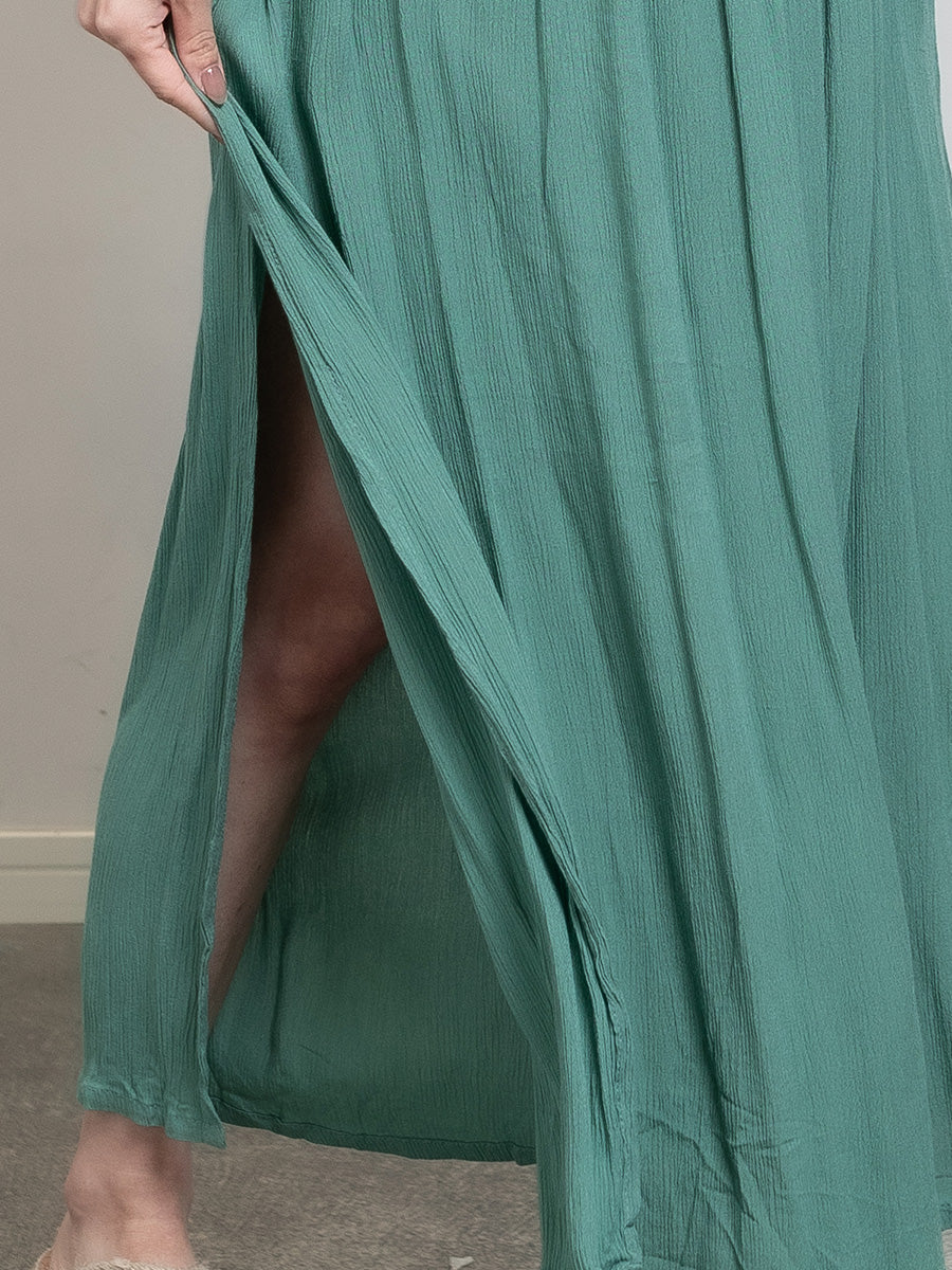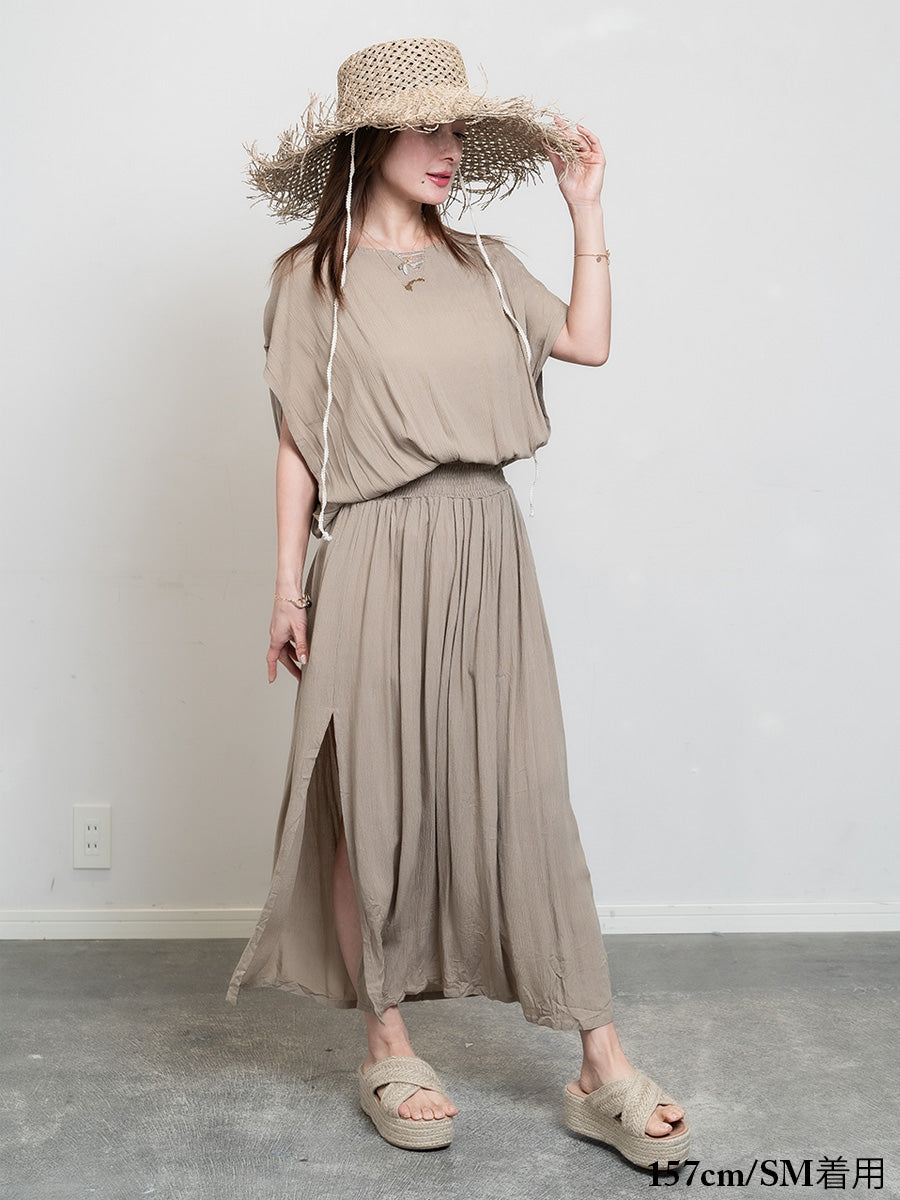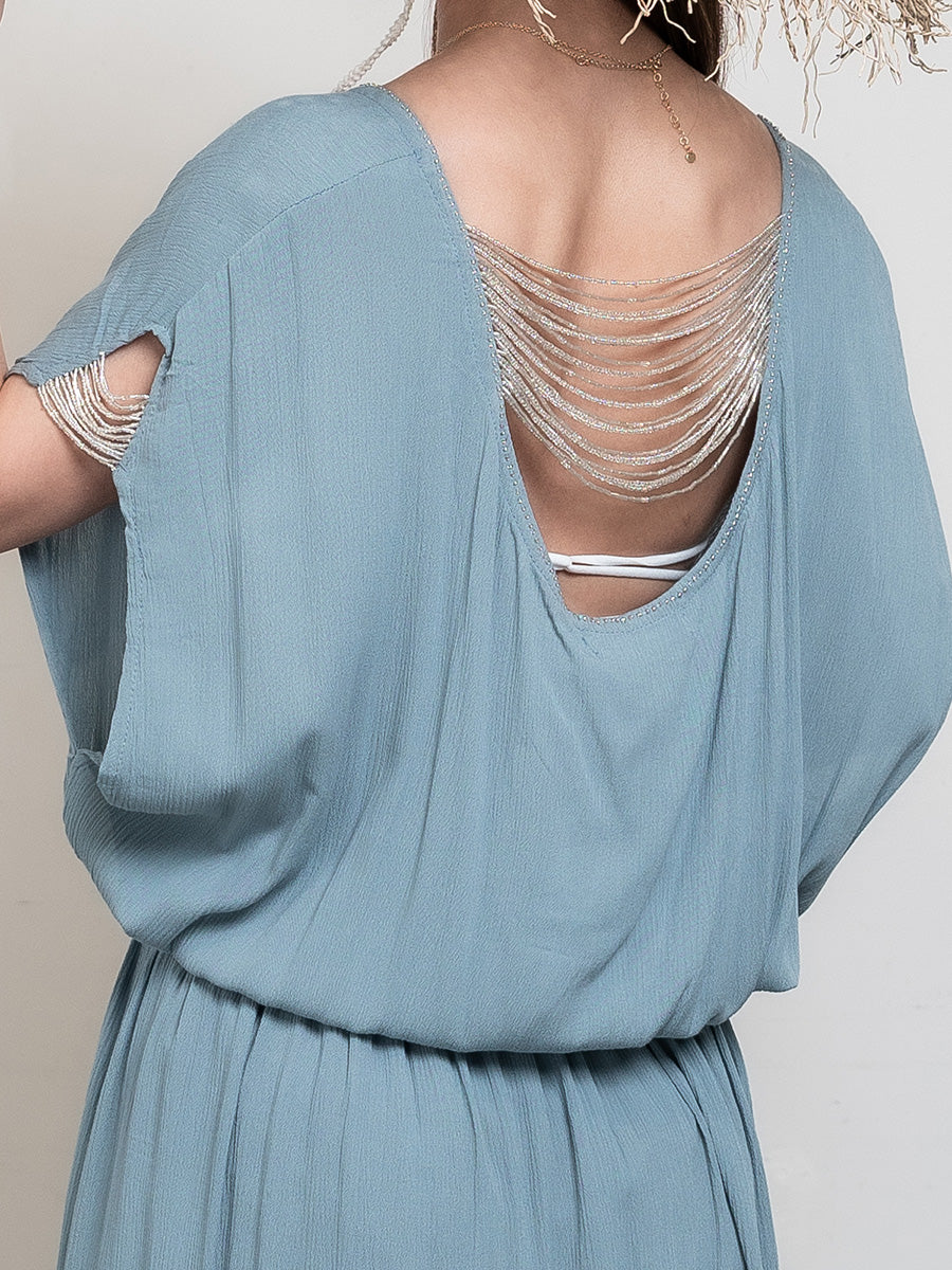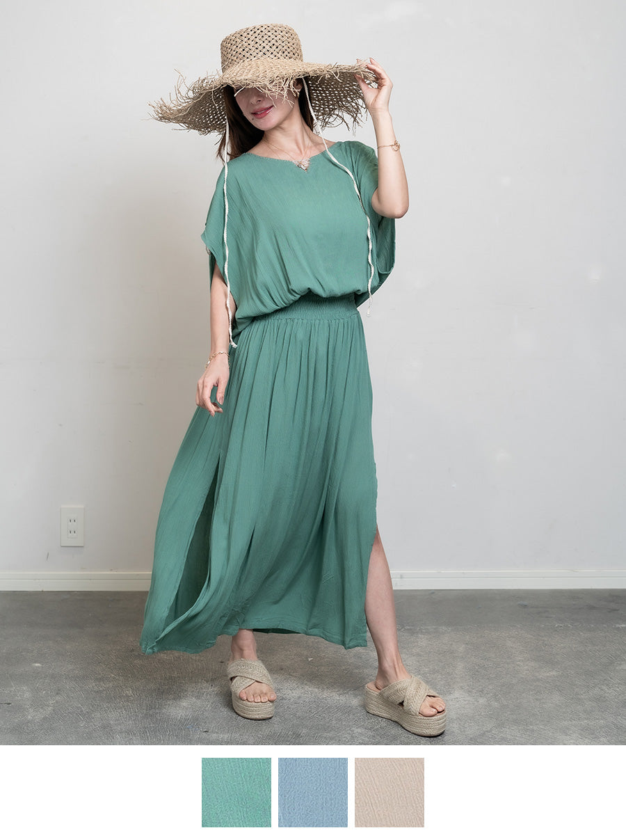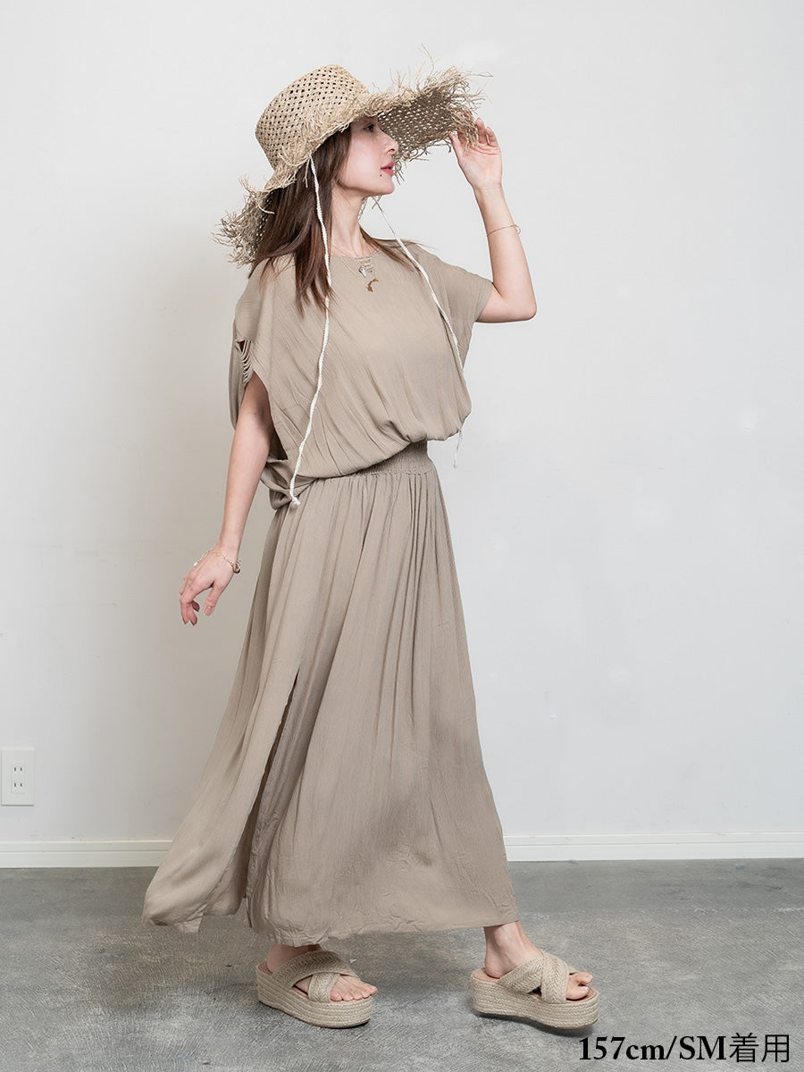 LAUT BLUE(ラウトブルー)クリンクルフレンチスリーブビーズマキシワンピース