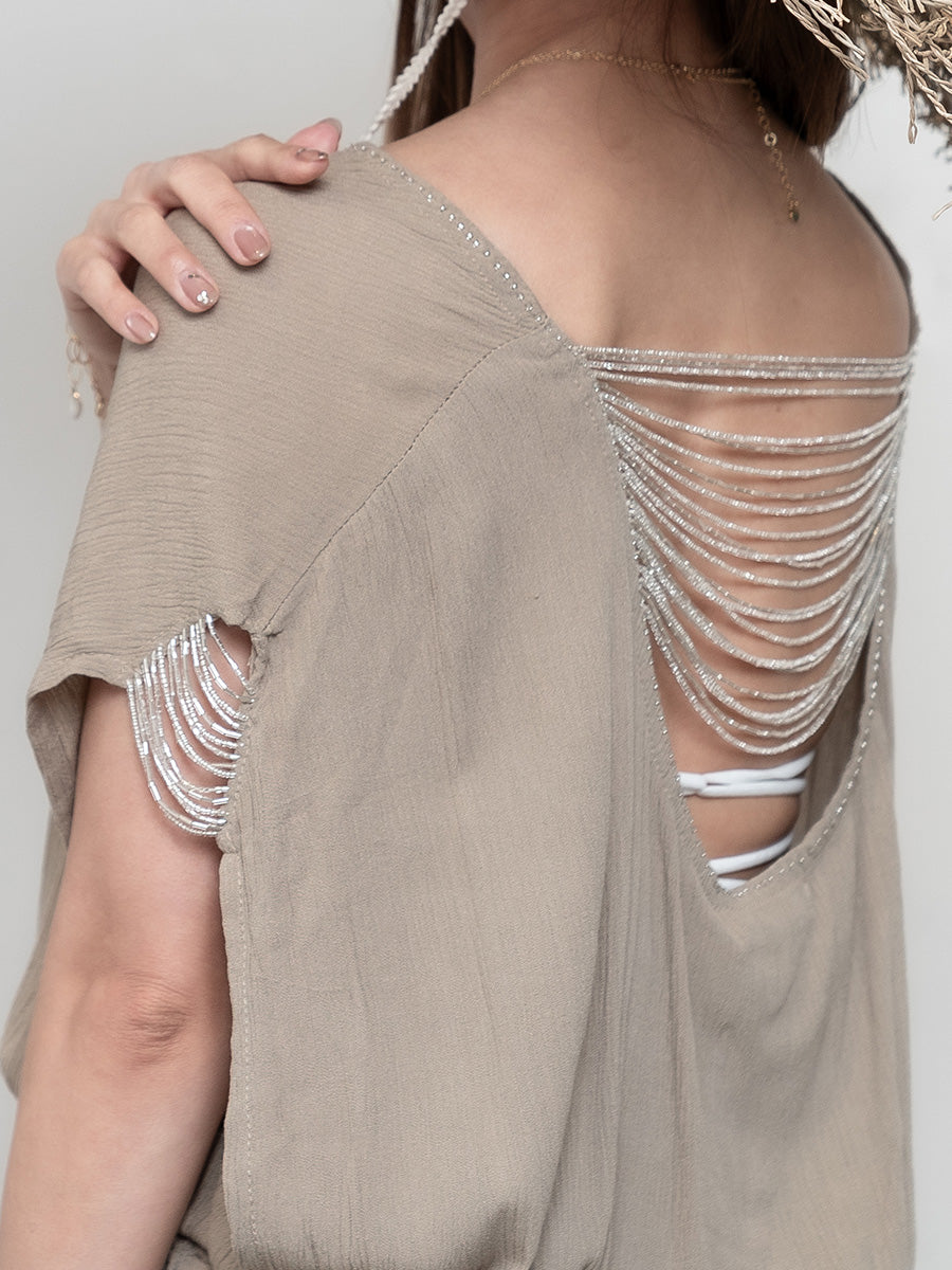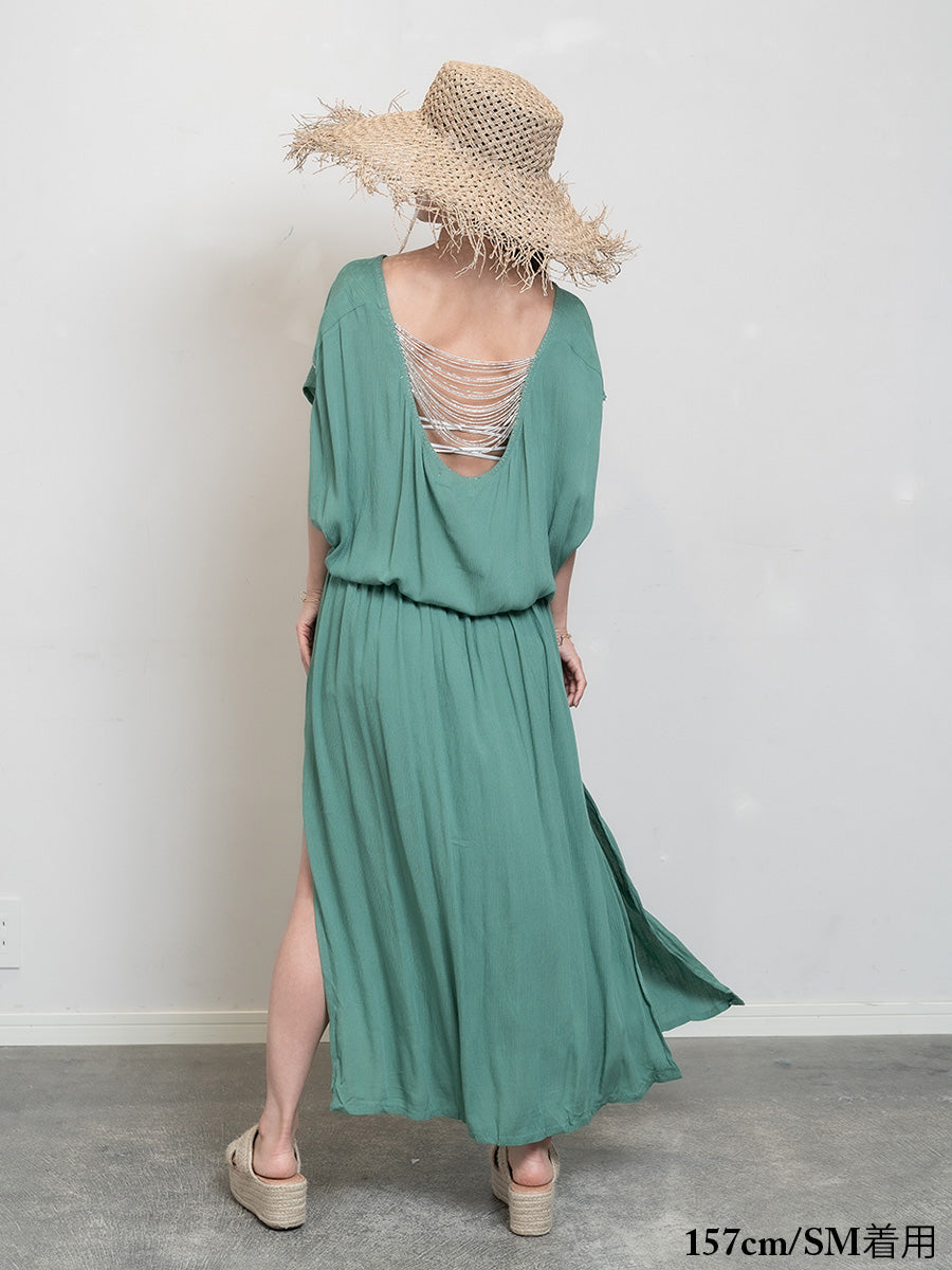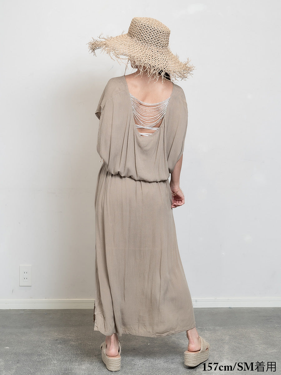 ビージュがあしらわれた豪華なリゾートワンピース。