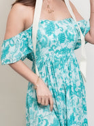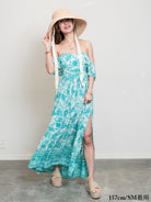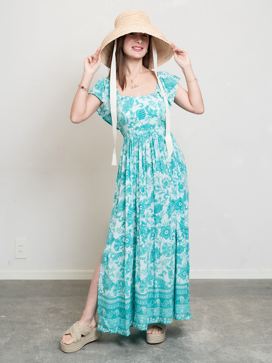 リゾート感溢れる爽やかな花柄ターコイズリゾートワンピース。