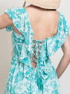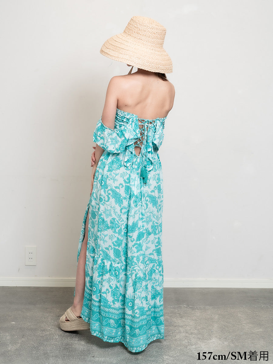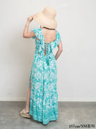 LAUT BLUE(ラウトブルー)フリル背中クロスマキシワンピース/花柄ターコイズ