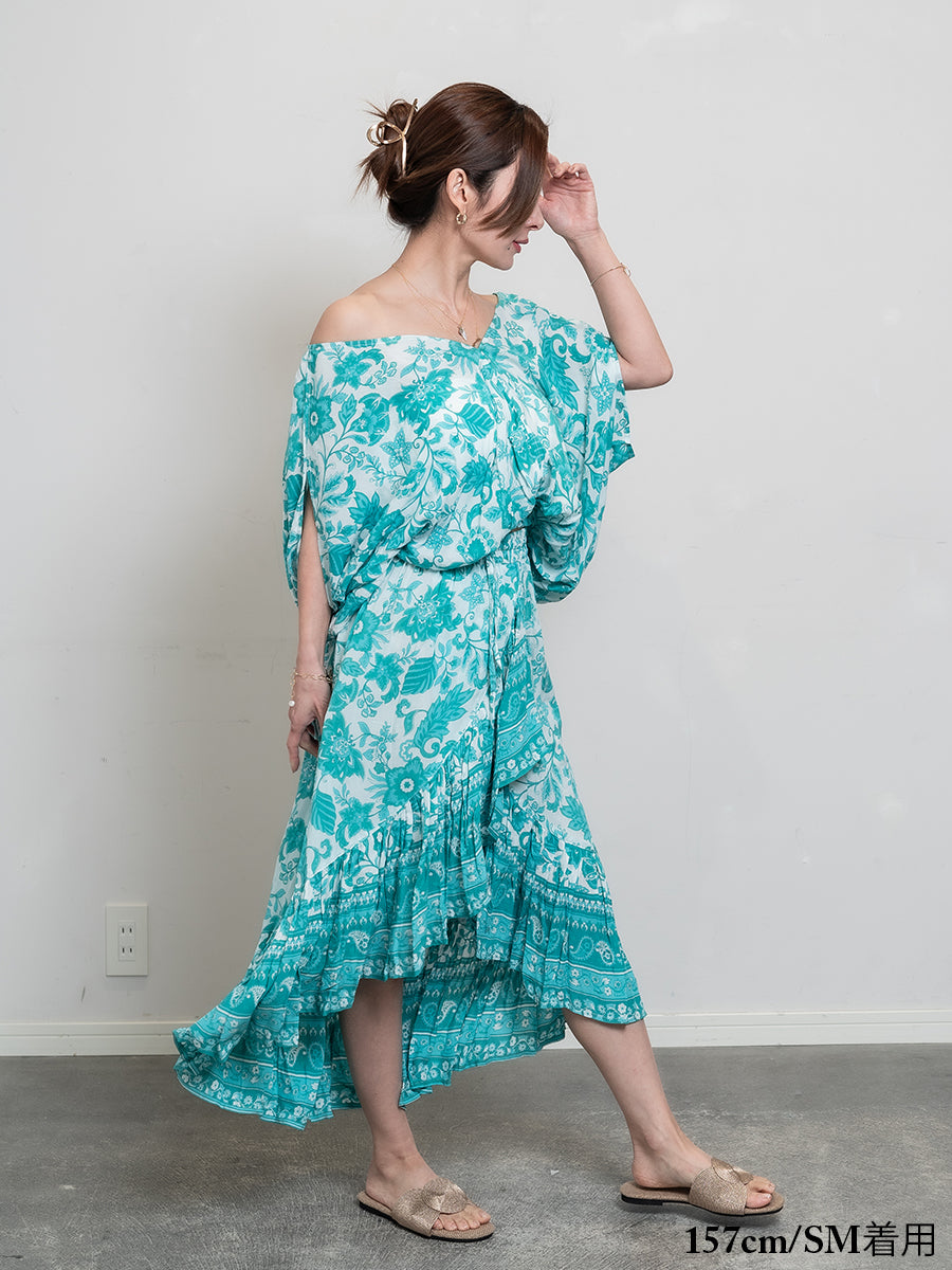LAUT BLUE(ラウトブルー)トライアングルトップス+フレアスカートセットアップ/ターコイズ花柄