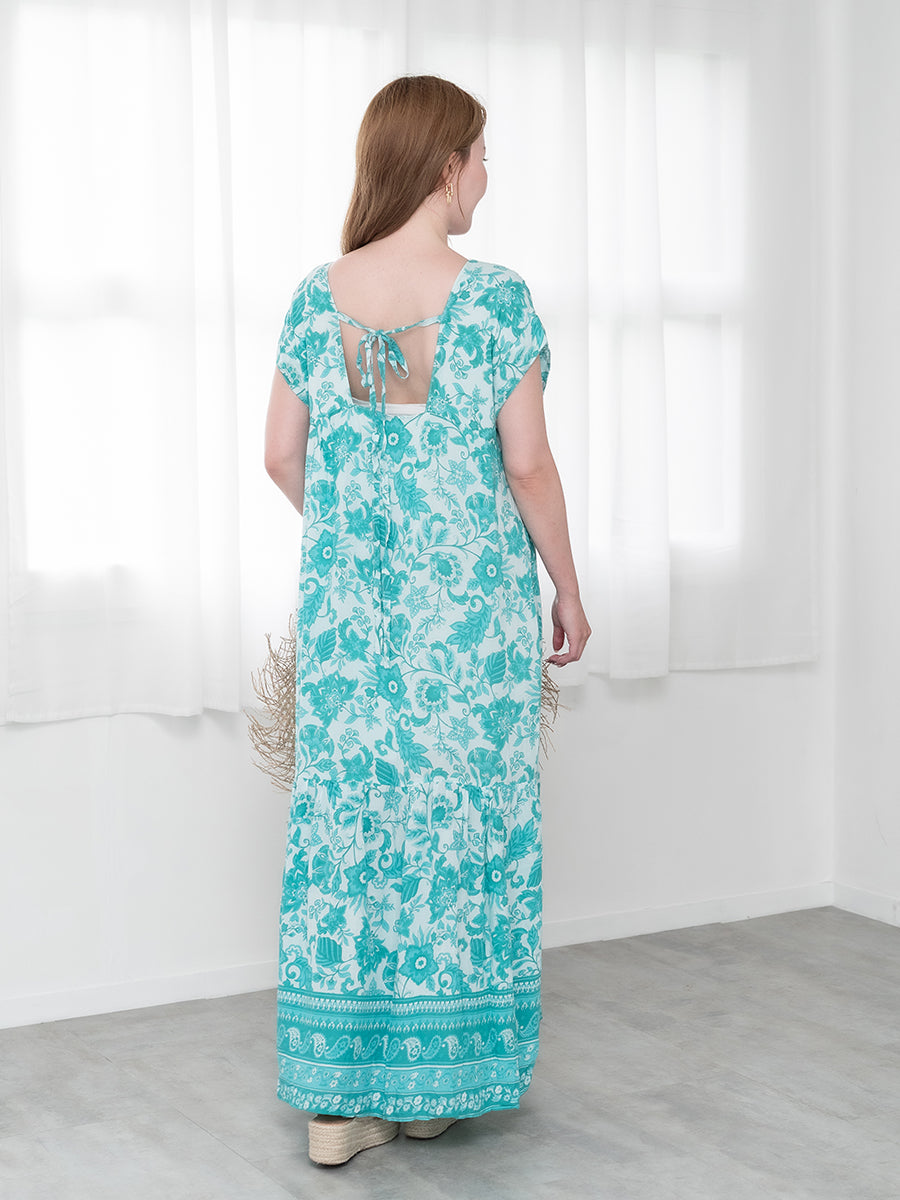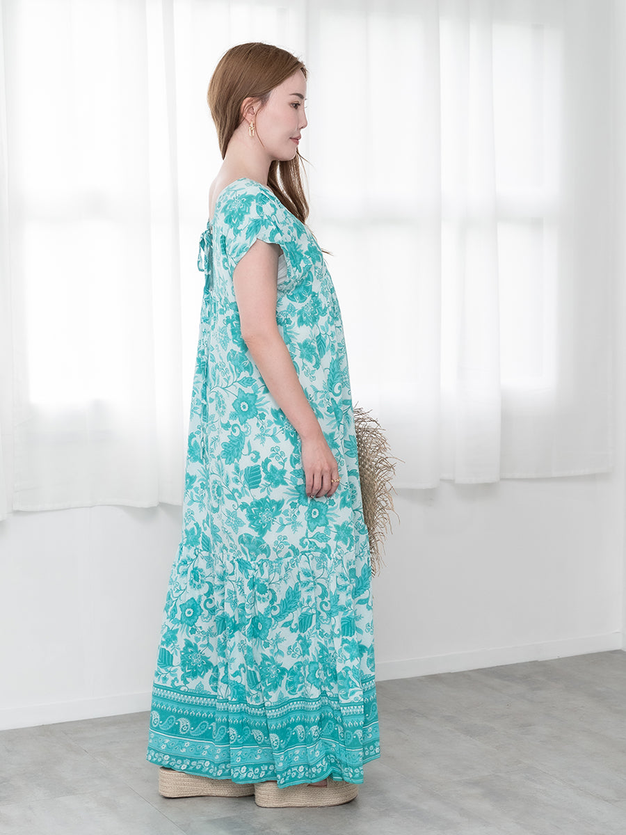 LAUT BLUE(ラウトブルー)フレンチスリーブティアードワンピース/ターコイズ花柄