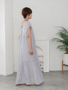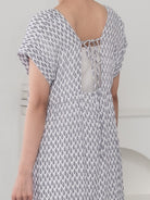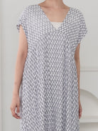 肩をさりげなくカバーするフレンチスリーブと、体を締めつけない優美なシルエット。