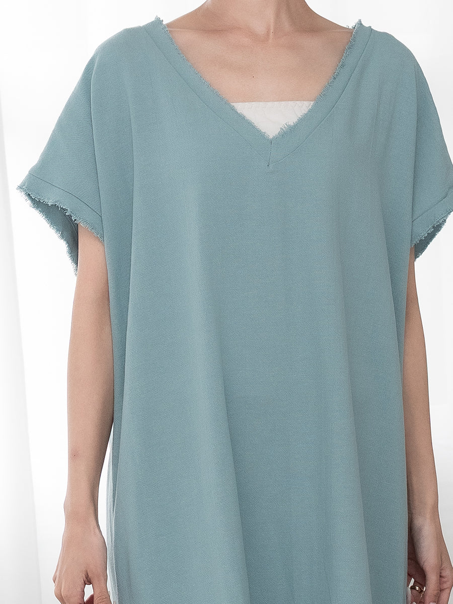 デコルテを美しく見せるVネックと、ゆとりを持たせた直線的なラインが、身体のラインをふんわりカバーしつつ、すっきりとした印象を演出。