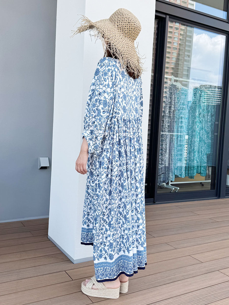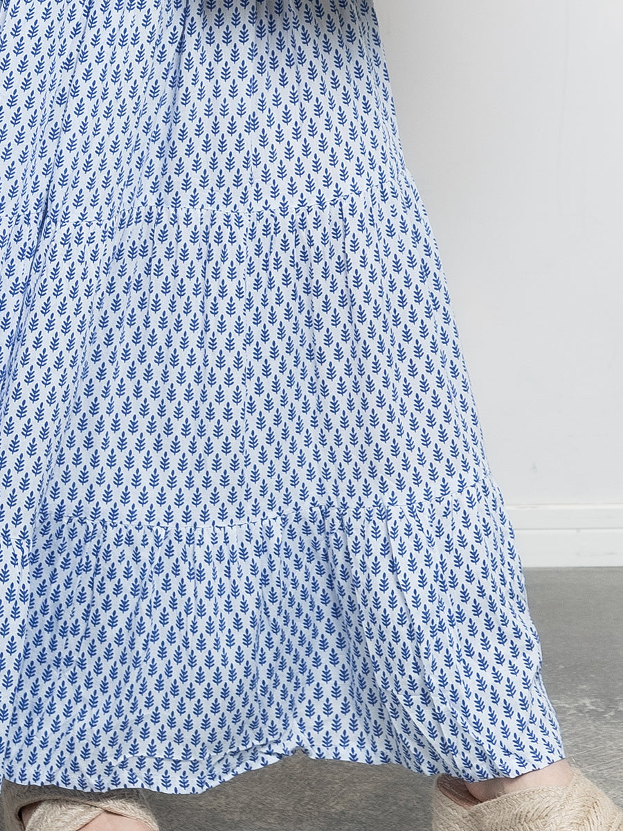 LAUT BLUE(ラウトブルー)ティアード長袖マキシワンピース/リーフ柄