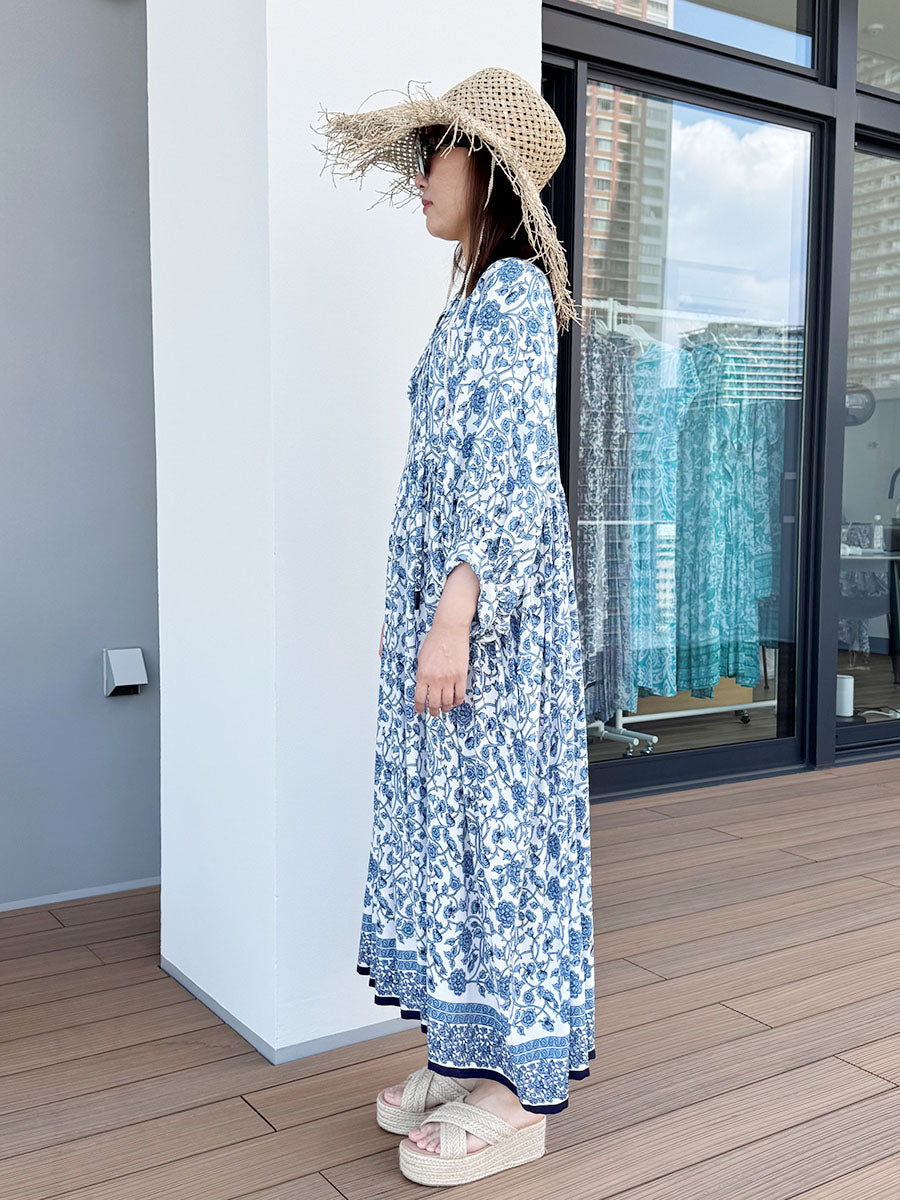LAUT BLUE(ラウトブルー)ティアード長袖ロングワンピース/ターコイズ花柄