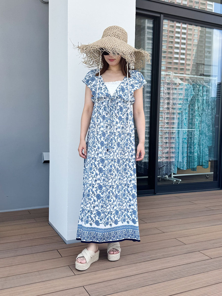 LAUT BLUE(ラウトブルー)フリル背中クロスマキシワンピース/リトルリーフ柄