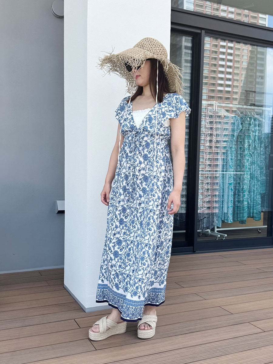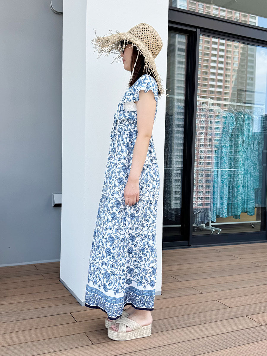 LAUT BLUE(ラウトブルー)フレンチスリーブマキシワンピース/ブルー花柄