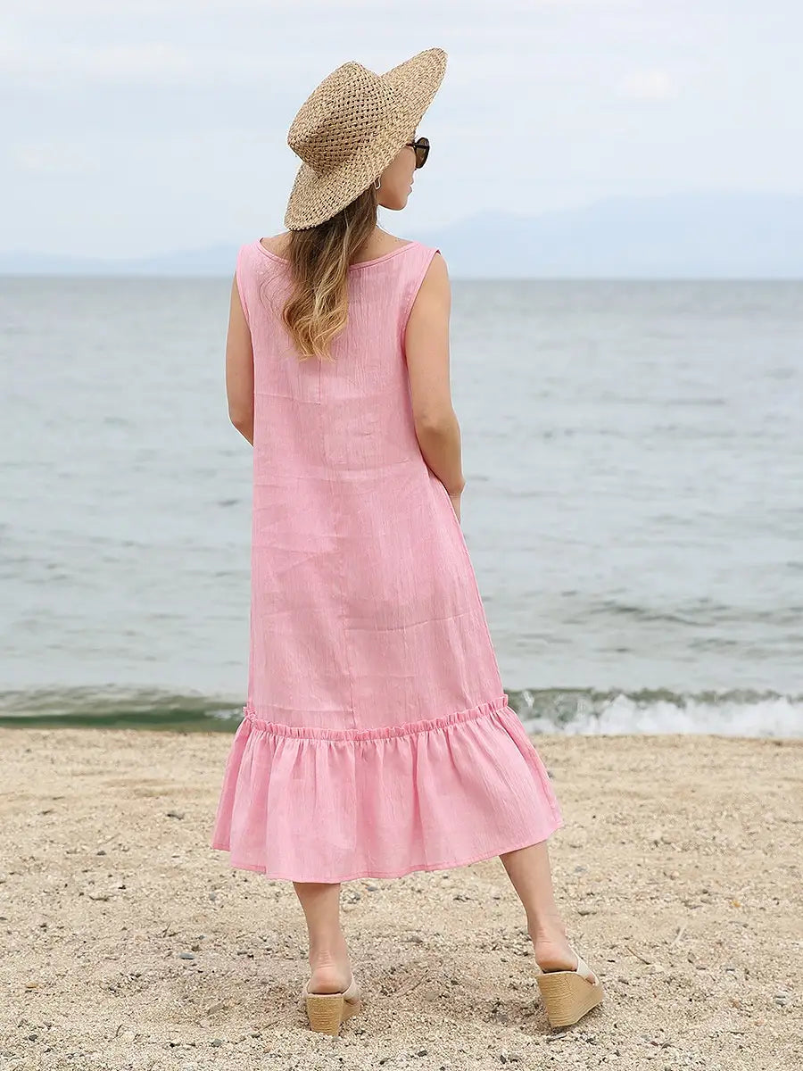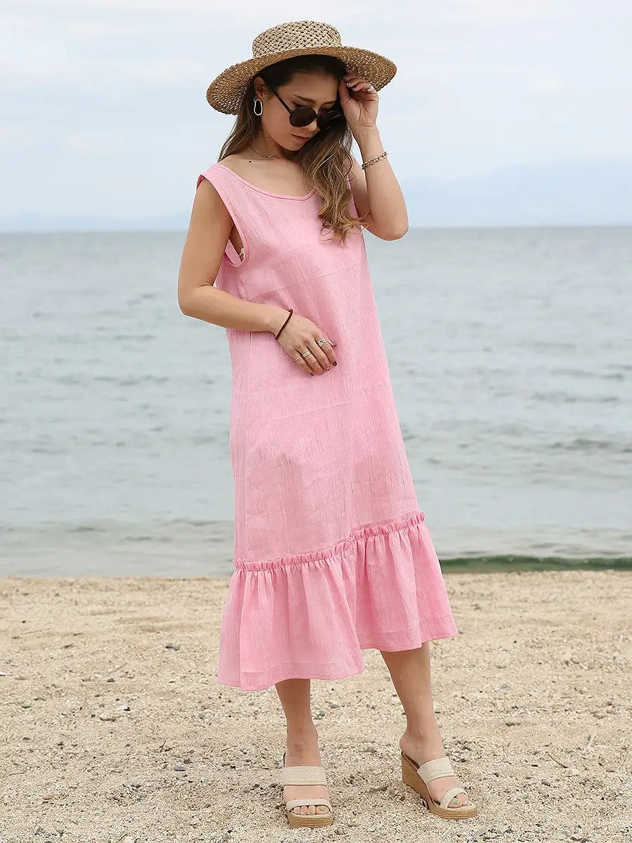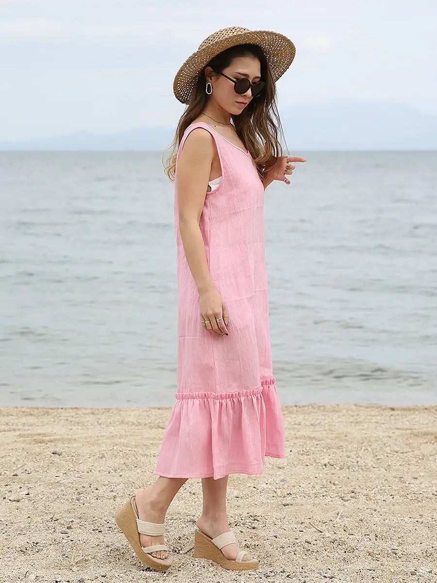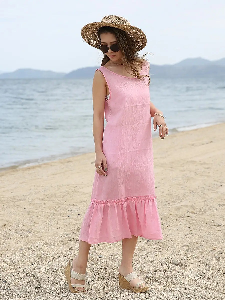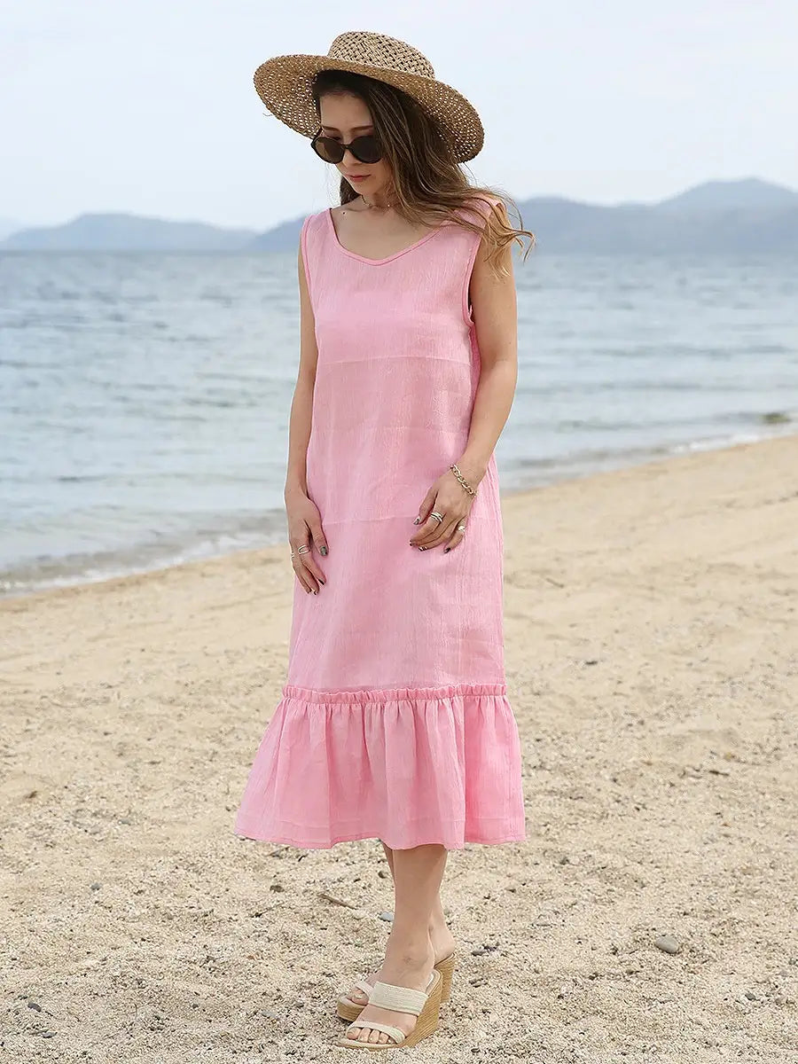 ノースリーブデザインで、裾のフリルが可愛いリネンワンピース
