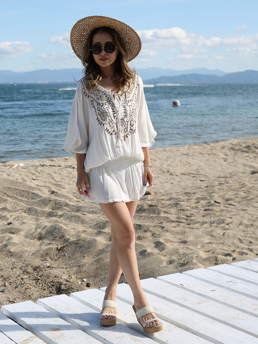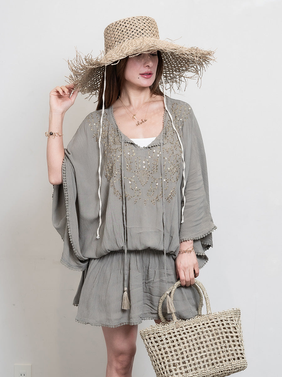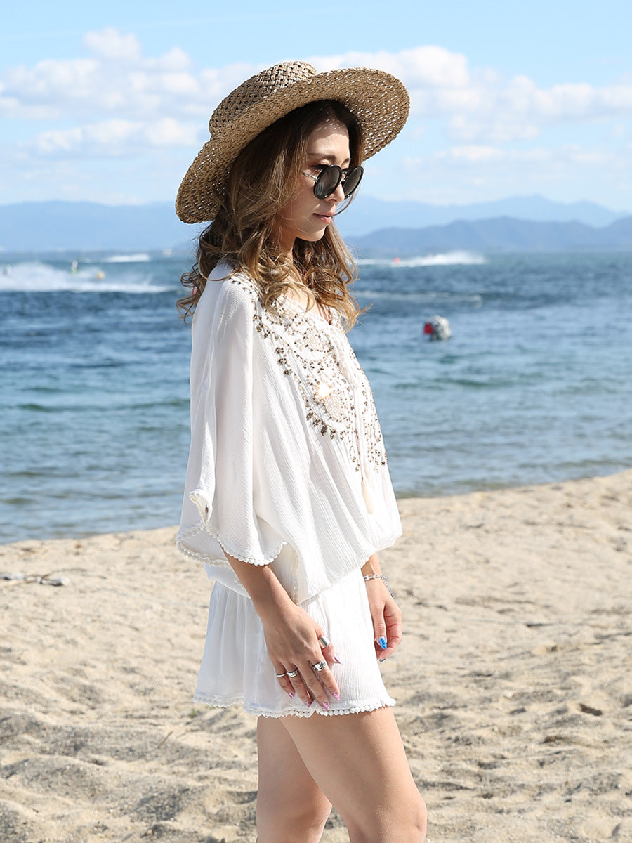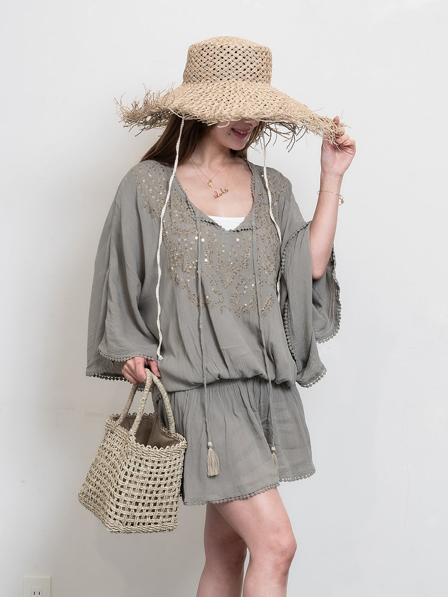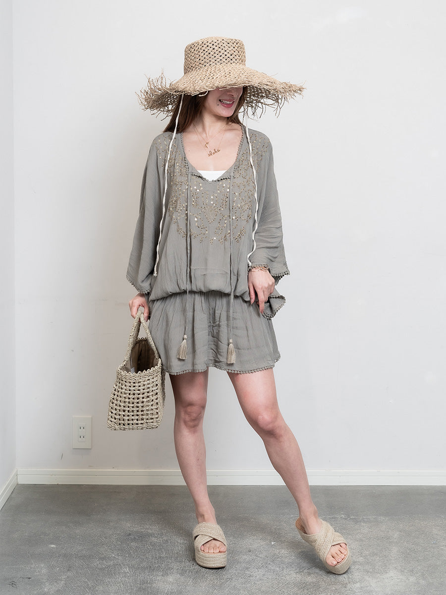 ビーチ・リゾートシーンはもちろん、シティでも着用して頂ける大人のチュニックワンピース。 シボと呼ばれるシワや縮みをほどこした、クリンクル素材生地で、胸元にデザインされたスパンコールが特徴的な1枚です。 ウェスト部分がゴムになっているので丈の調整、シルエット調整が可能です。 上品なデザインですが、程よく露出もしますので女性らしいセクシーさもこの1着で演出してくれます。 体系カバーしてくれるチュニックはカバーアップとしても大活躍、着痩せコーデも楽しんで頂けます。 水着、ビキニの上にさらっと着るスタイルがおすすめです。 ストローハットとサンダルとコーデしてビーチ・リゾートスタイルに! ウールハットとブーツと合わせればウェスタンスタイルのボヘミアンなフェスコーデが完成! |