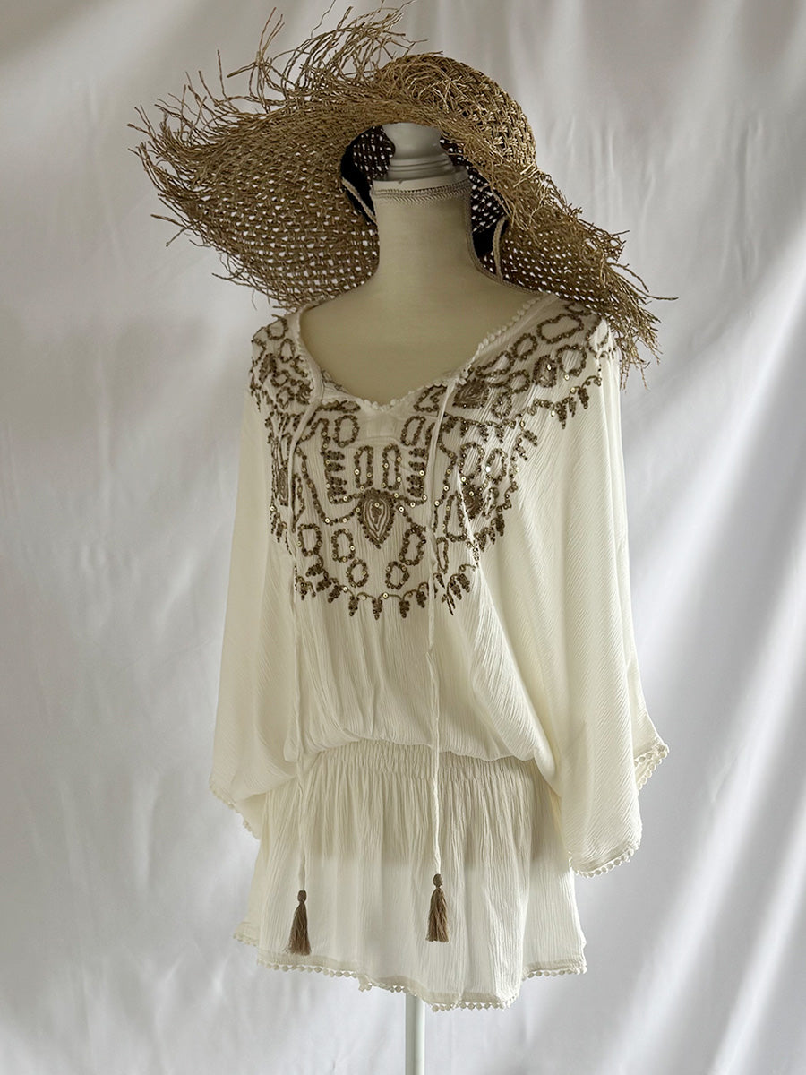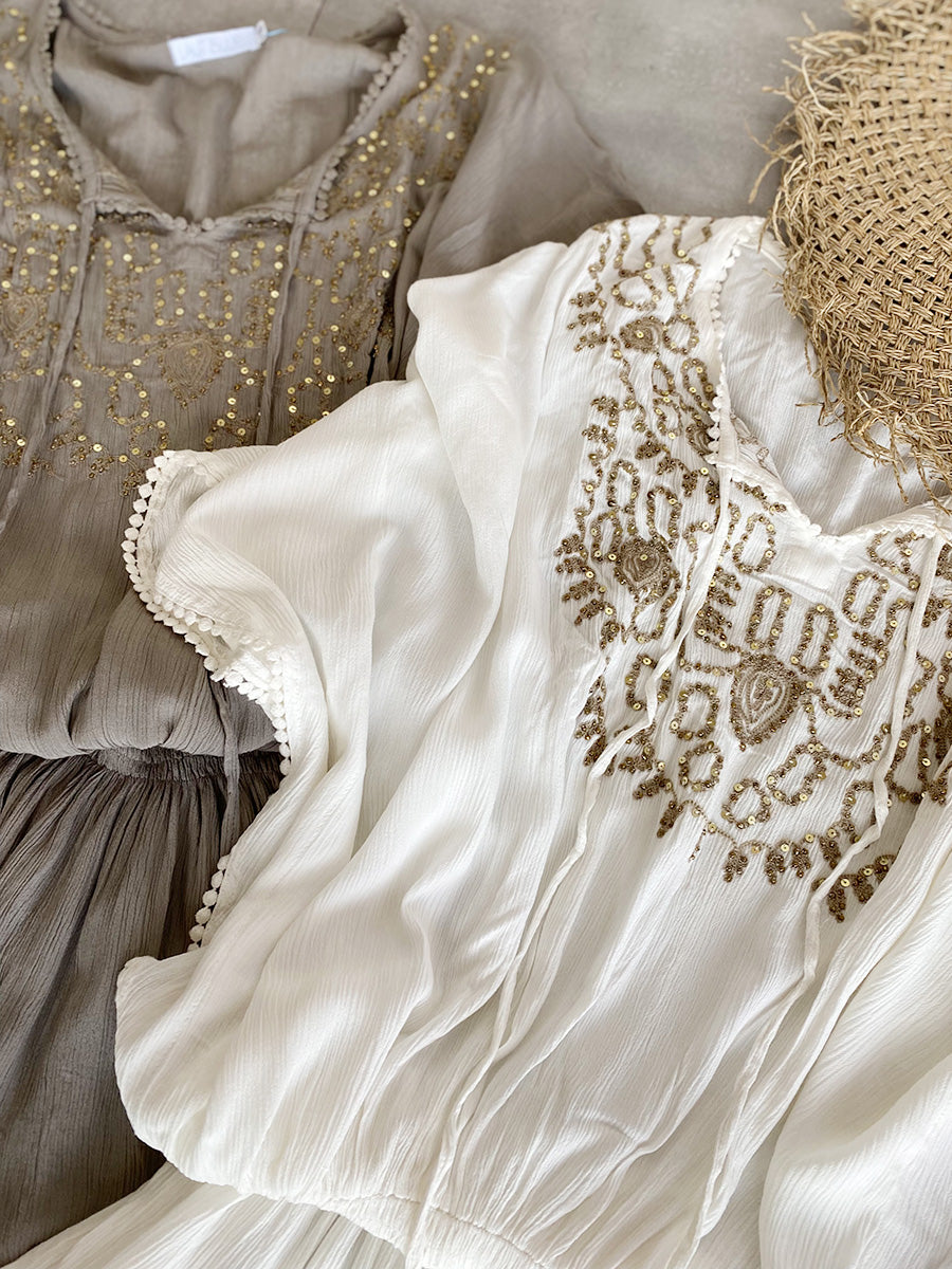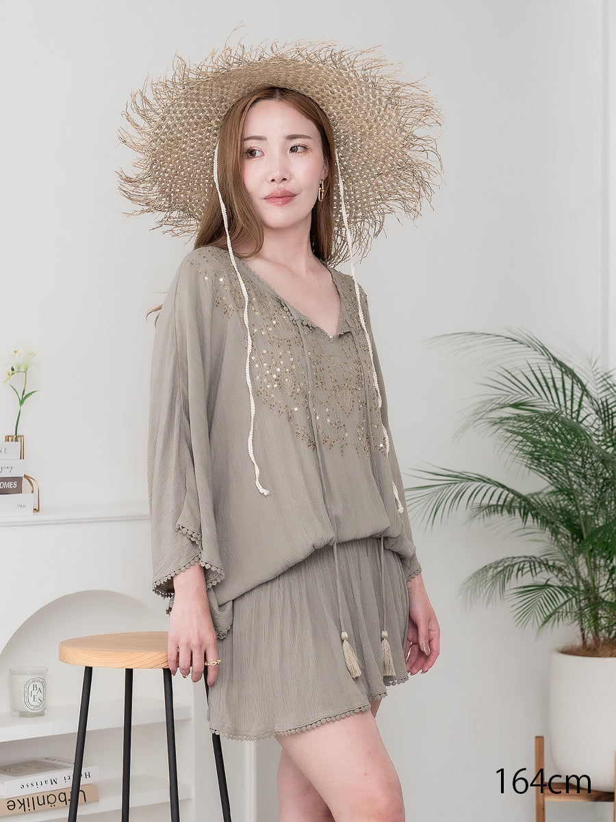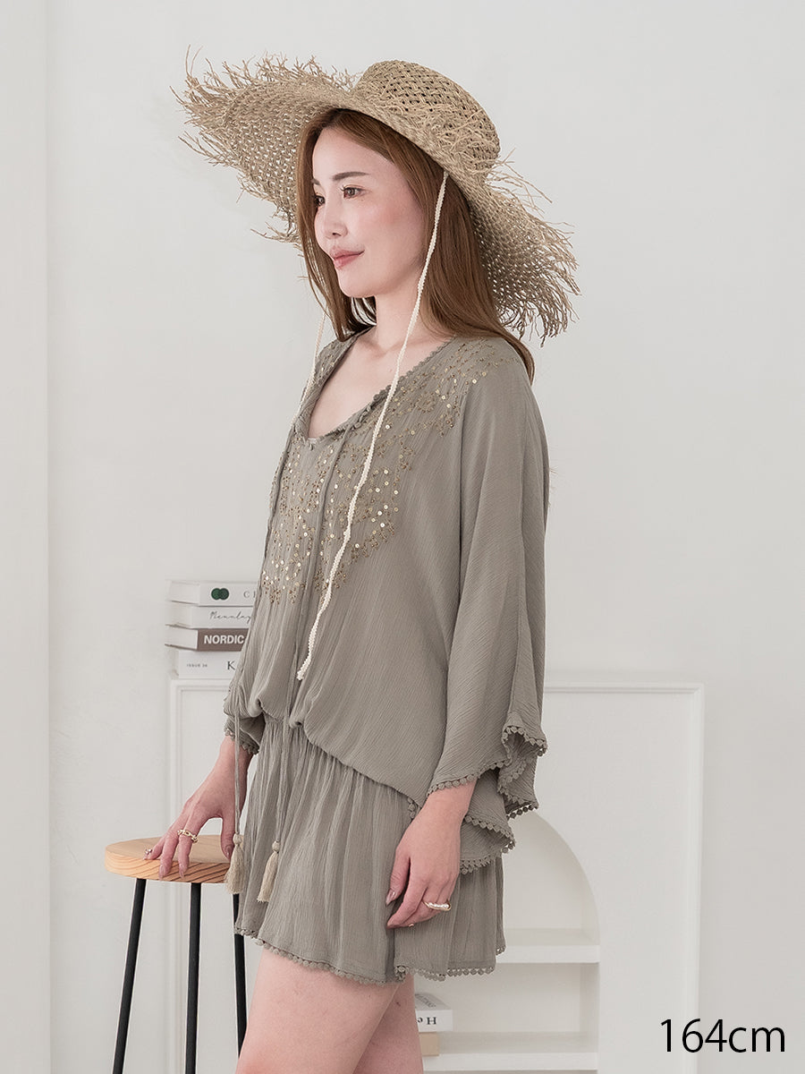 ビーチ・リゾートシーンはもちろん、シティでも着用して頂ける大人のチュニックワンピース。 シボと呼ばれるシワや縮みをほどこした、クリンクル素材生地で、胸元にデザインされたスパンコールが特徴的な1枚です。 ウェスト部分がゴムになっているので丈の調整、シルエット調整が可能です。 上品なデザインですが、程よく露出もしますので女性らしいセクシーさもこの1着で演出してくれます。 体系カバーしてくれるチュニックはカバーアップとしても大活躍、着痩せコーデも楽しんで頂けます。 水着、ビキニの上にさらっと着るスタイルがおすすめです。 ストローハットとサンダルとコーデしてビーチ・リゾートスタイルに! ウールハットとブーツと合わせればウェスタンスタイルのボヘミアンなフェスコーデが完成! |