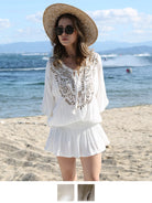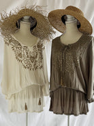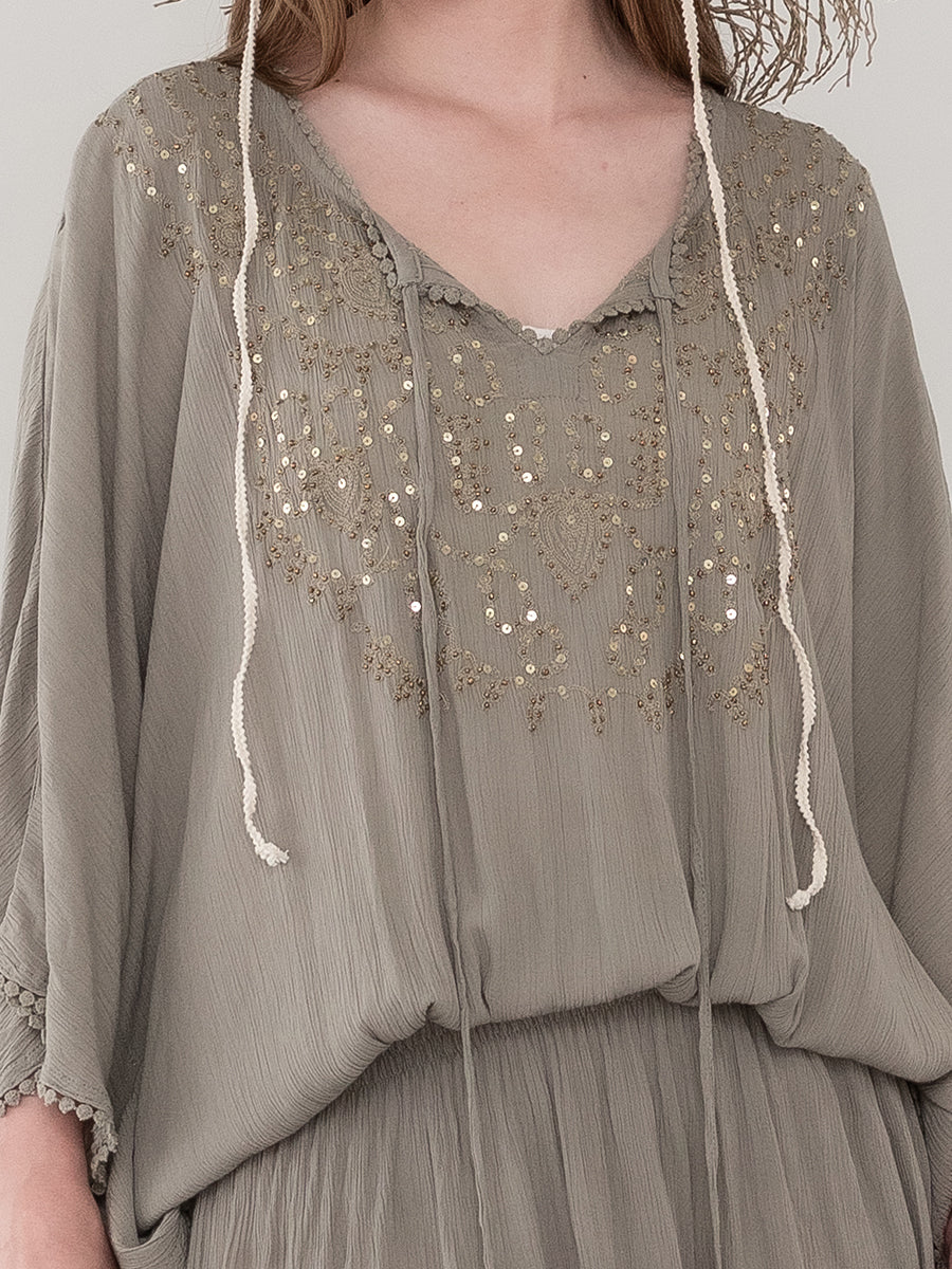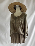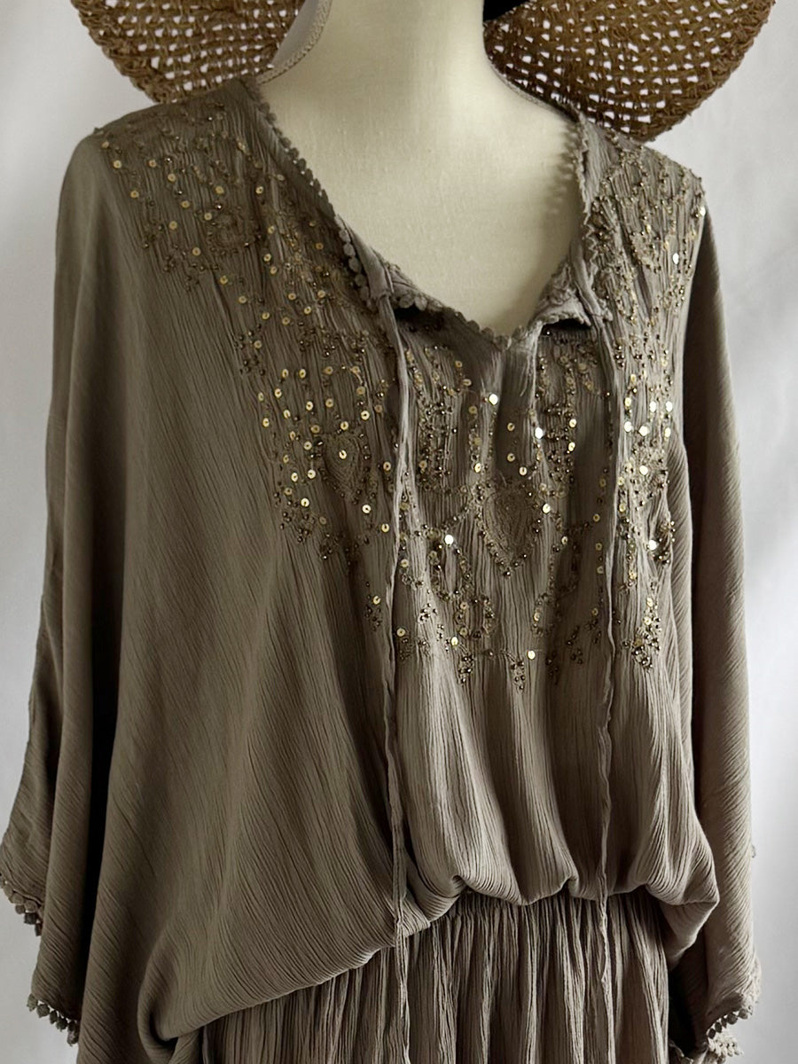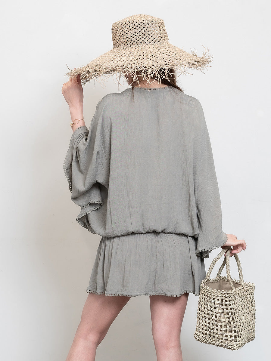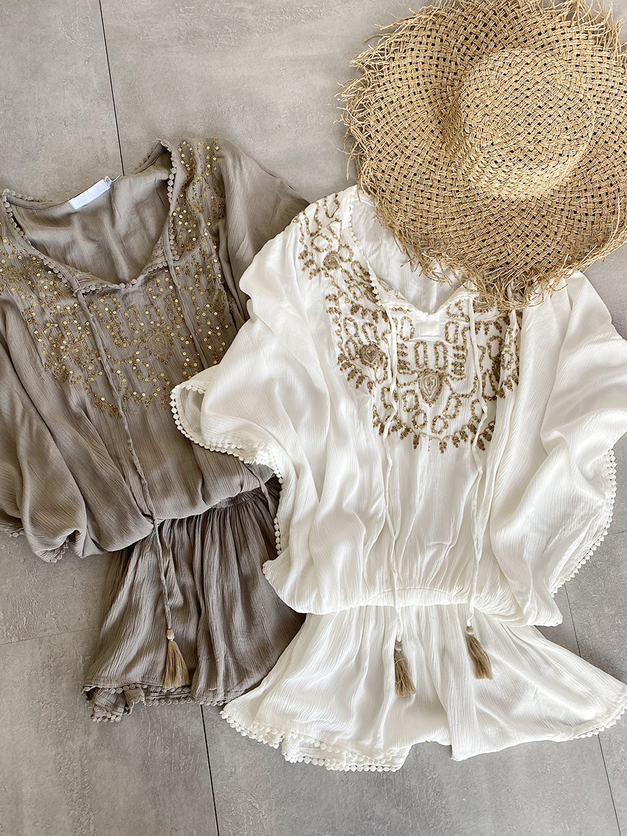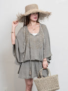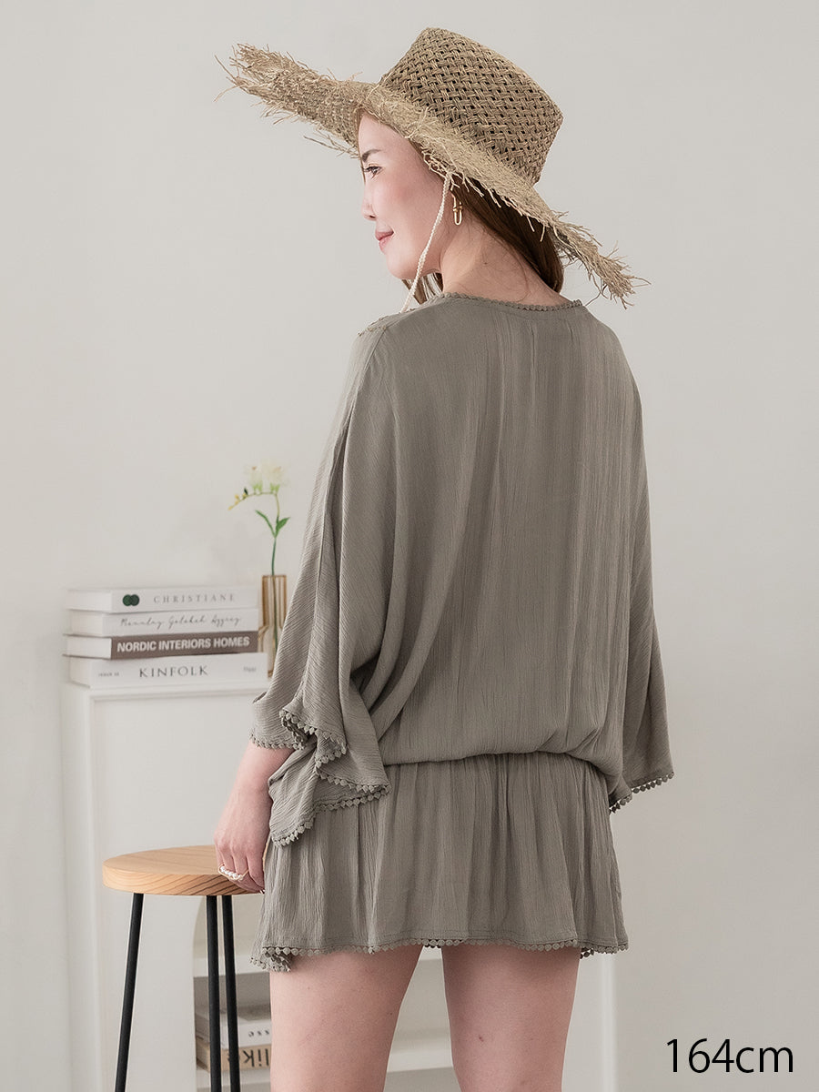 ビーチ・リゾートシーンはもちろん、シティでも着用して頂ける大人のチュニックワンピース。 シボと呼ばれるシワや縮みをほどこした、クリンクル素材生地で、胸元にデザインされたスパンコールが特徴的な1枚です。 ウェスト部分がゴムになっているので丈の調整、シルエット調整が可能です。 上品なデザインですが、程よく露出もしますので女性らしいセクシーさもこの1着で演出してくれます。 体系カバーしてくれるチュニックはカバーアップとしても大活躍、着痩せコーデも楽しんで頂けます。 水着、ビキニの上にさらっと着るスタイルがおすすめです。 ストローハットとサンダルとコーデしてビーチ・リゾートスタイルに! ウールハットとブーツと合わせればウェスタンスタイルのボヘミアンなフェスコーデが完成! |