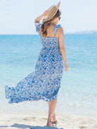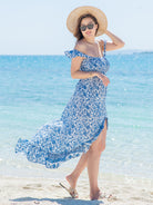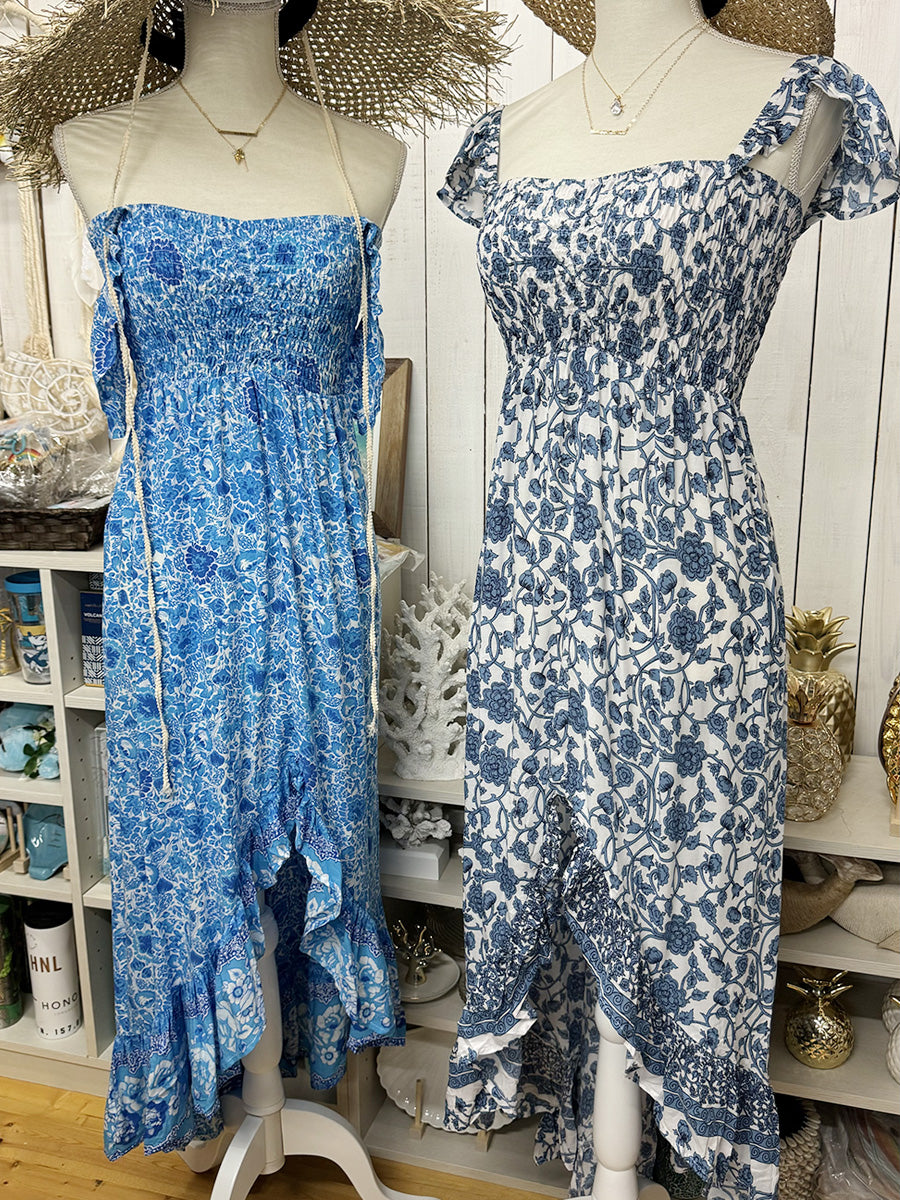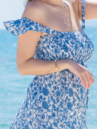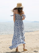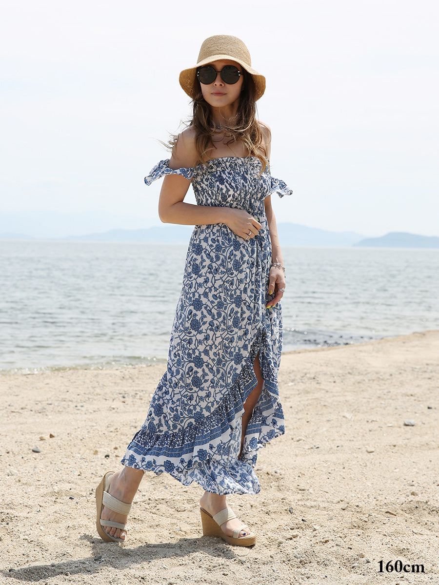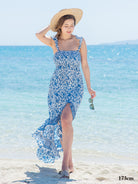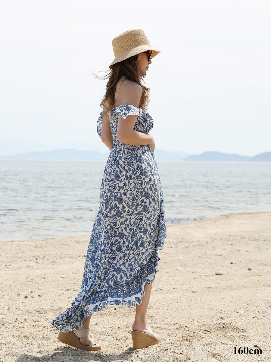 リゾート感溢れる爽やかなブルーの花柄リゾートワンピース。