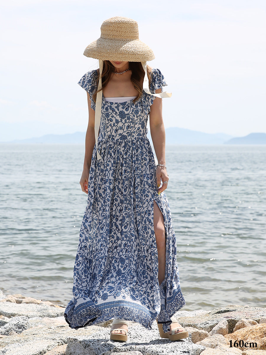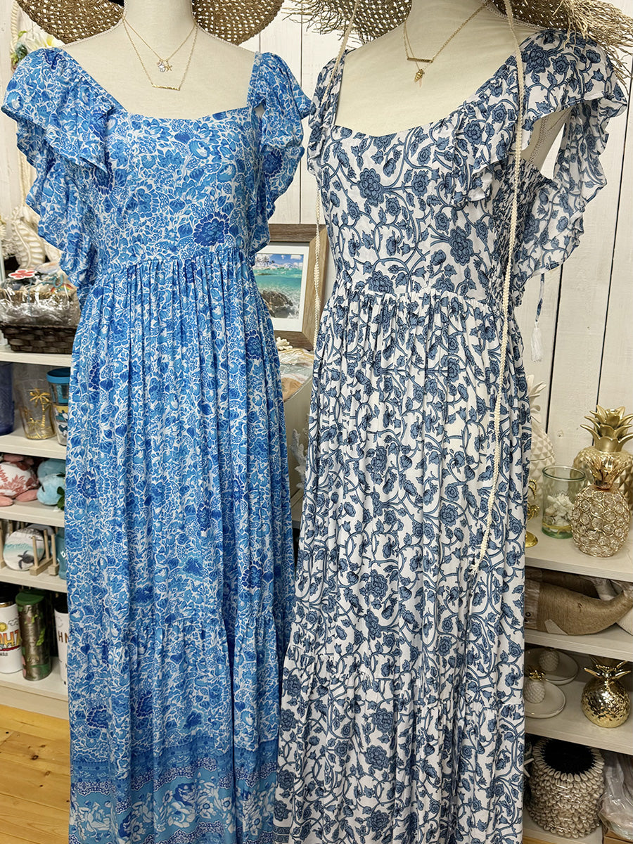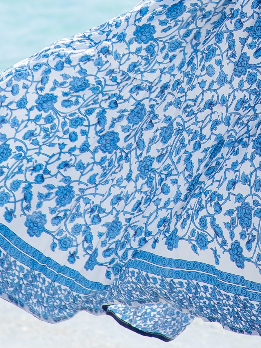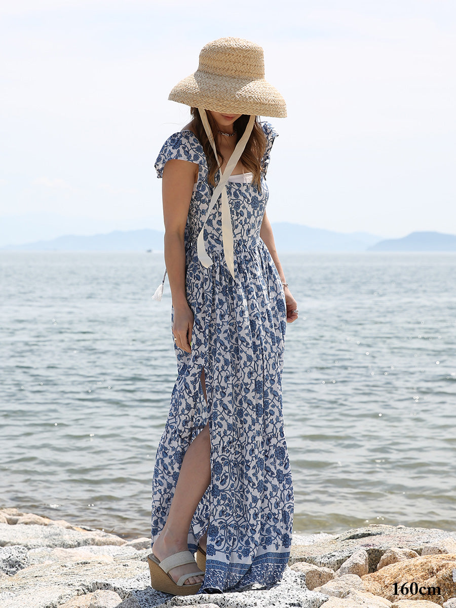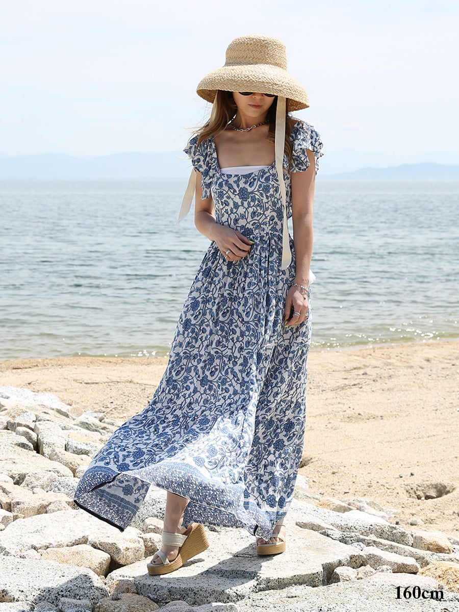リゾート感溢れる爽やかなブルーの花柄リゾートワンピース。