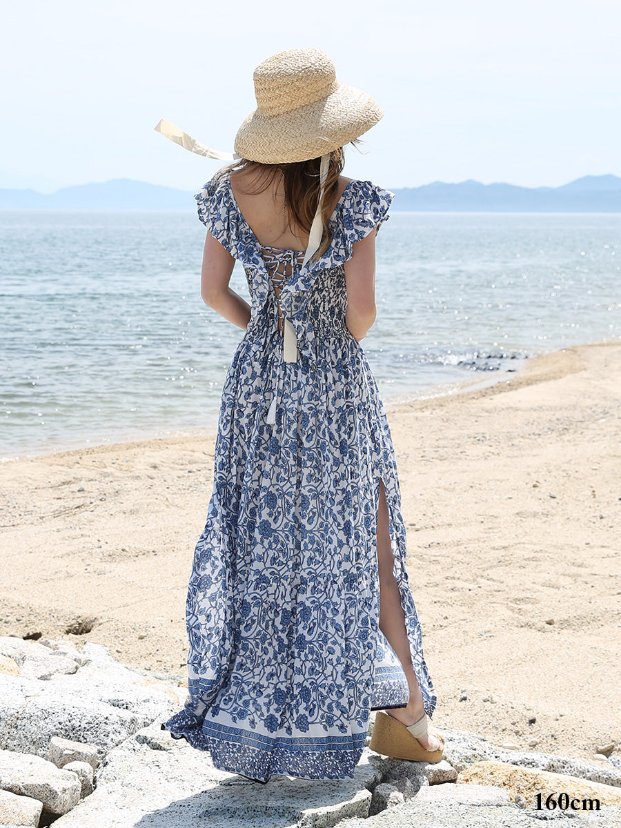 LAUT BLUE(ラウトブルー)フリル背中クロスマキシワンピース/ブルー花柄