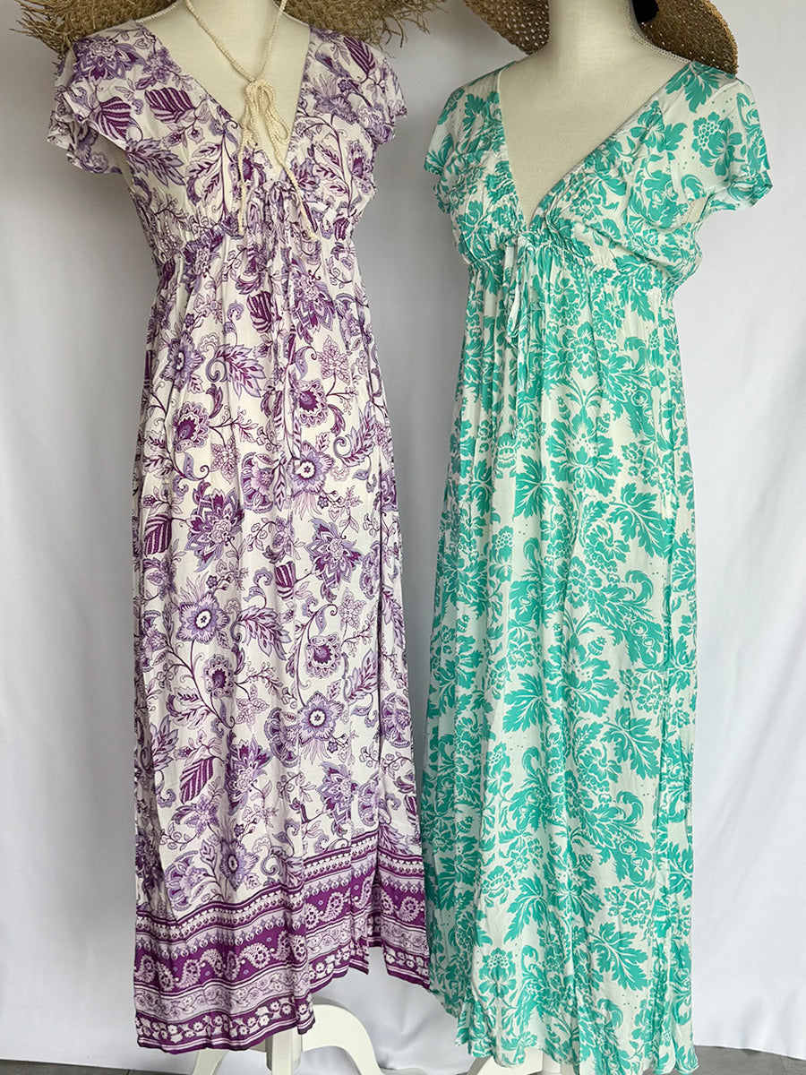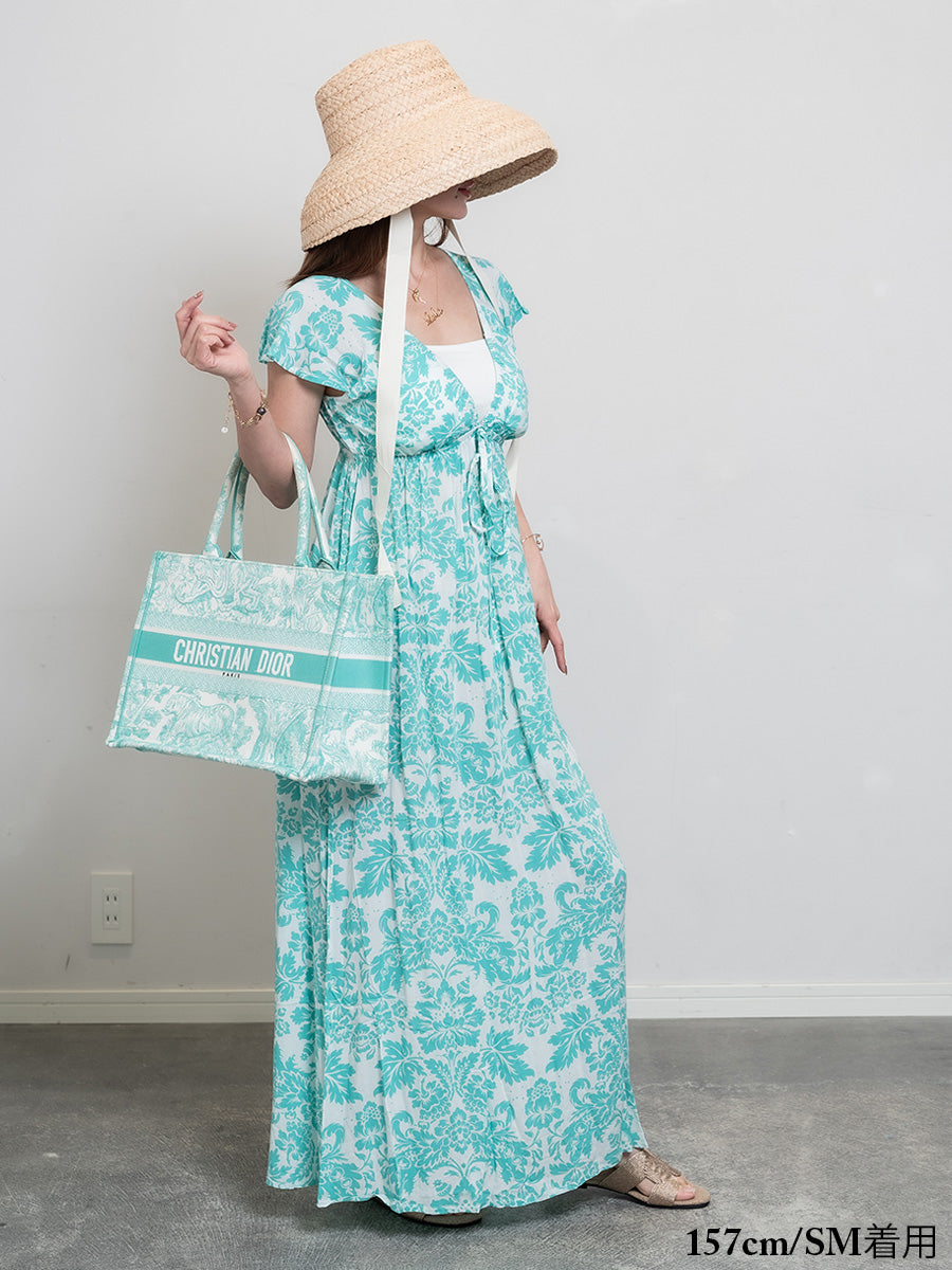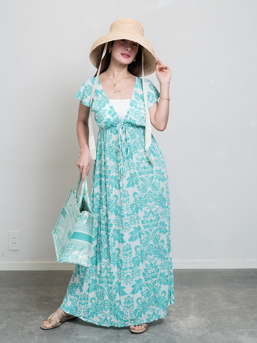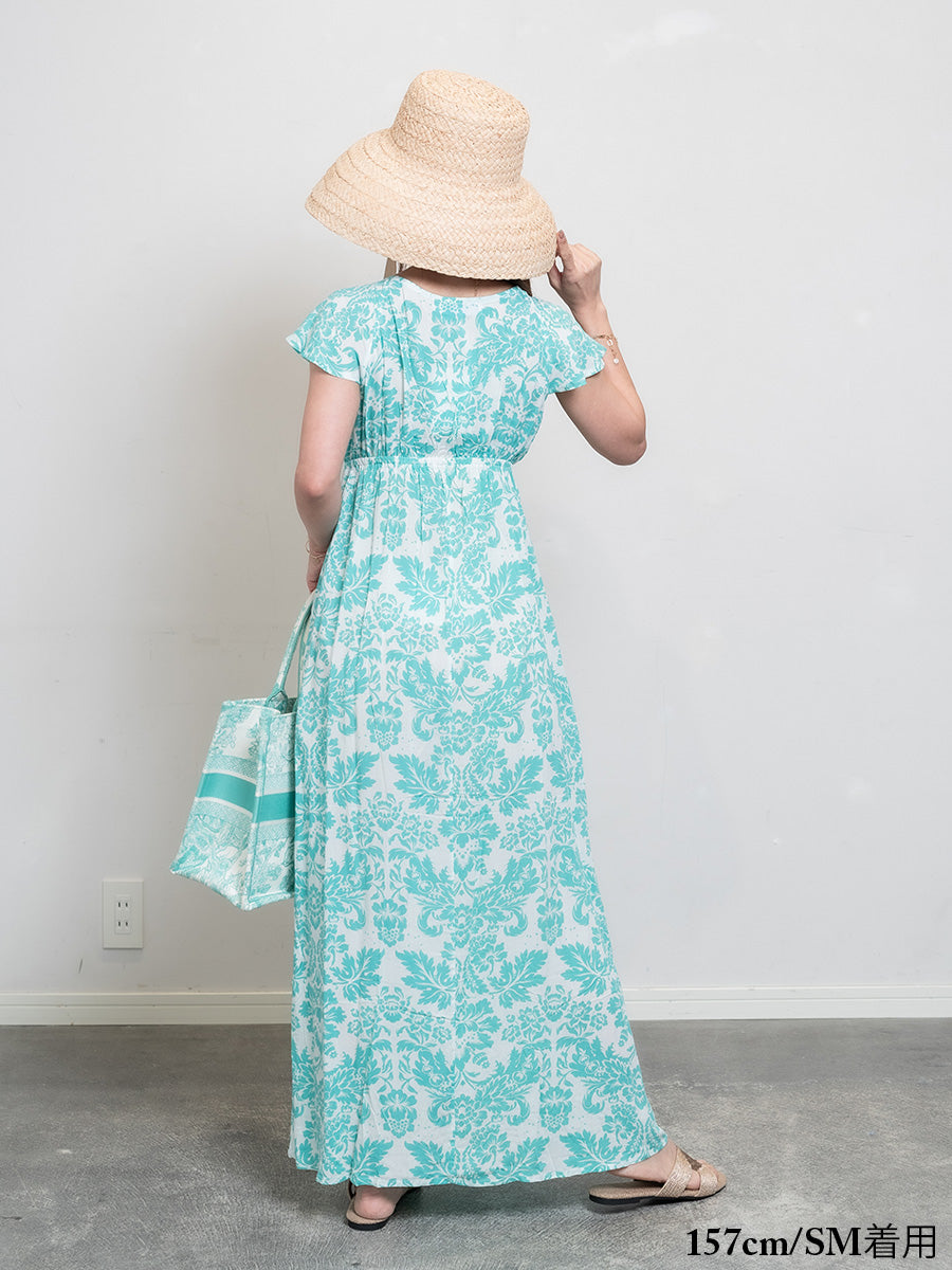 ビーチ・リゾートシーンで映えるダマスク柄リゾートワンピース。