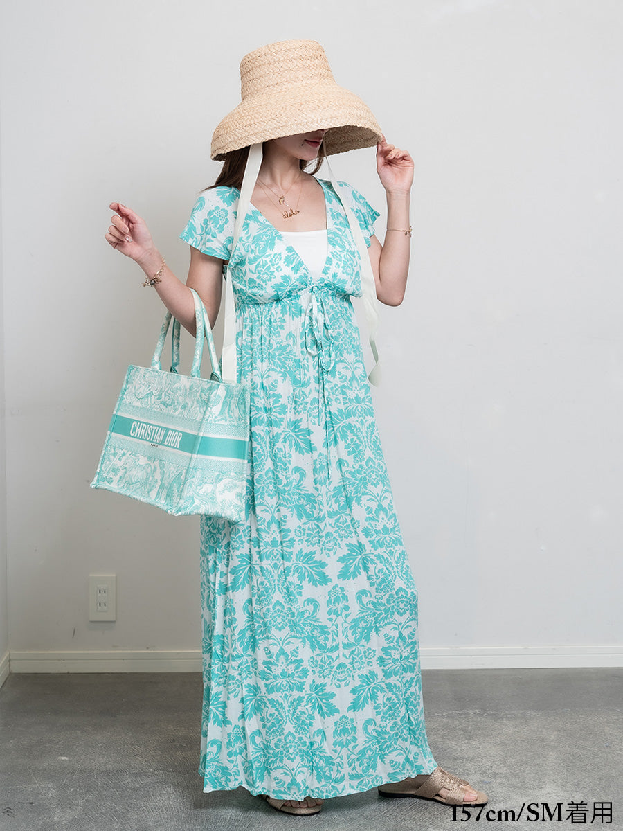 LAUT BLUE(ラウトブルー)フレンチスリーブマキシワンピース/ダマスク柄