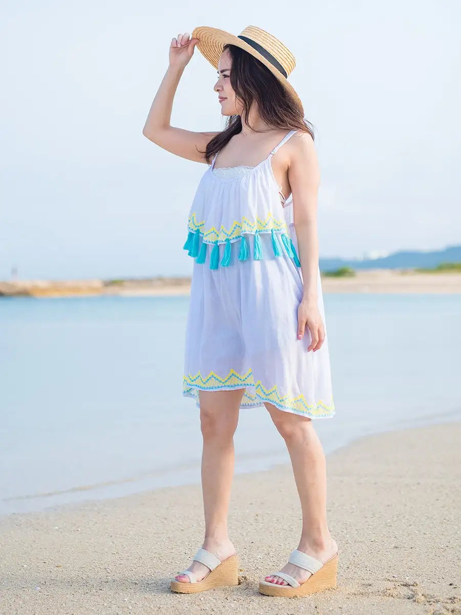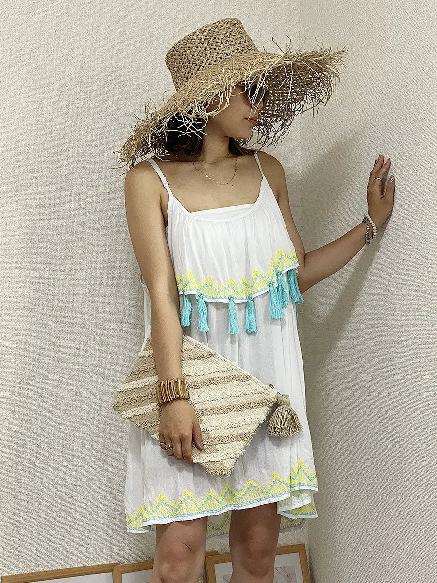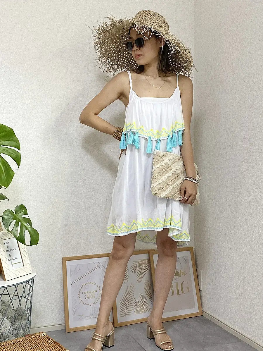 胸元の刺繍とタッセルがアクセントになったリゾートワンピースです。
