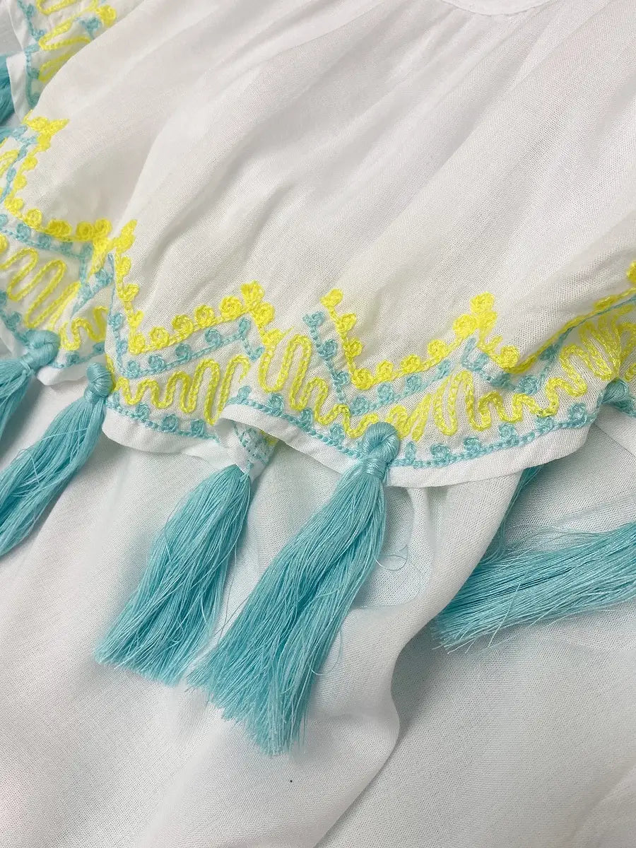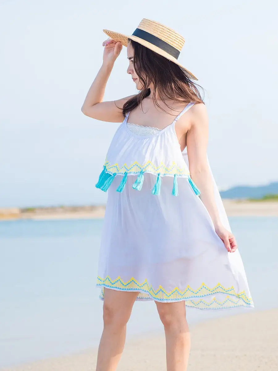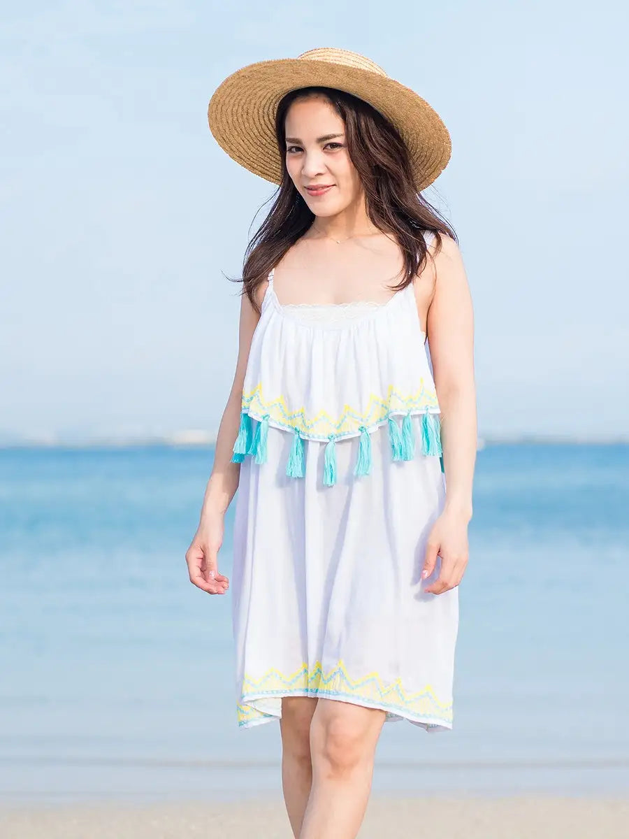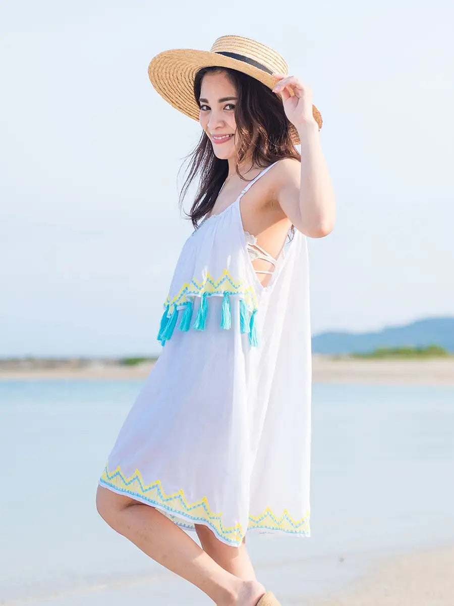 胸元の刺繍とタッセルがアクセントになったリゾートワンピースです。