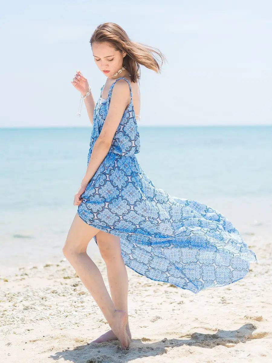 爽やかなビーチ・リゾートシーンとマッチするブルーがベースになったリゾートワンピースです。