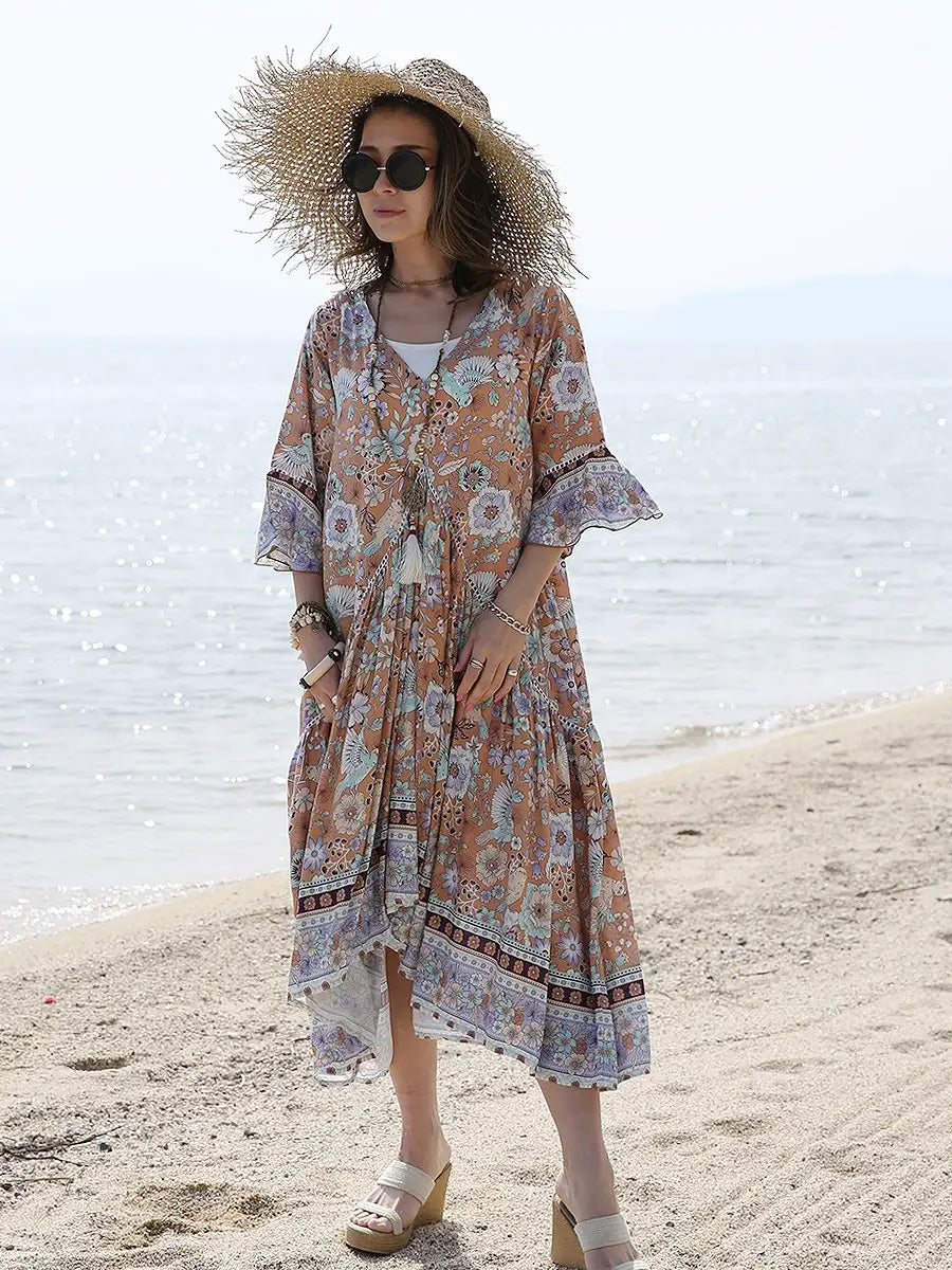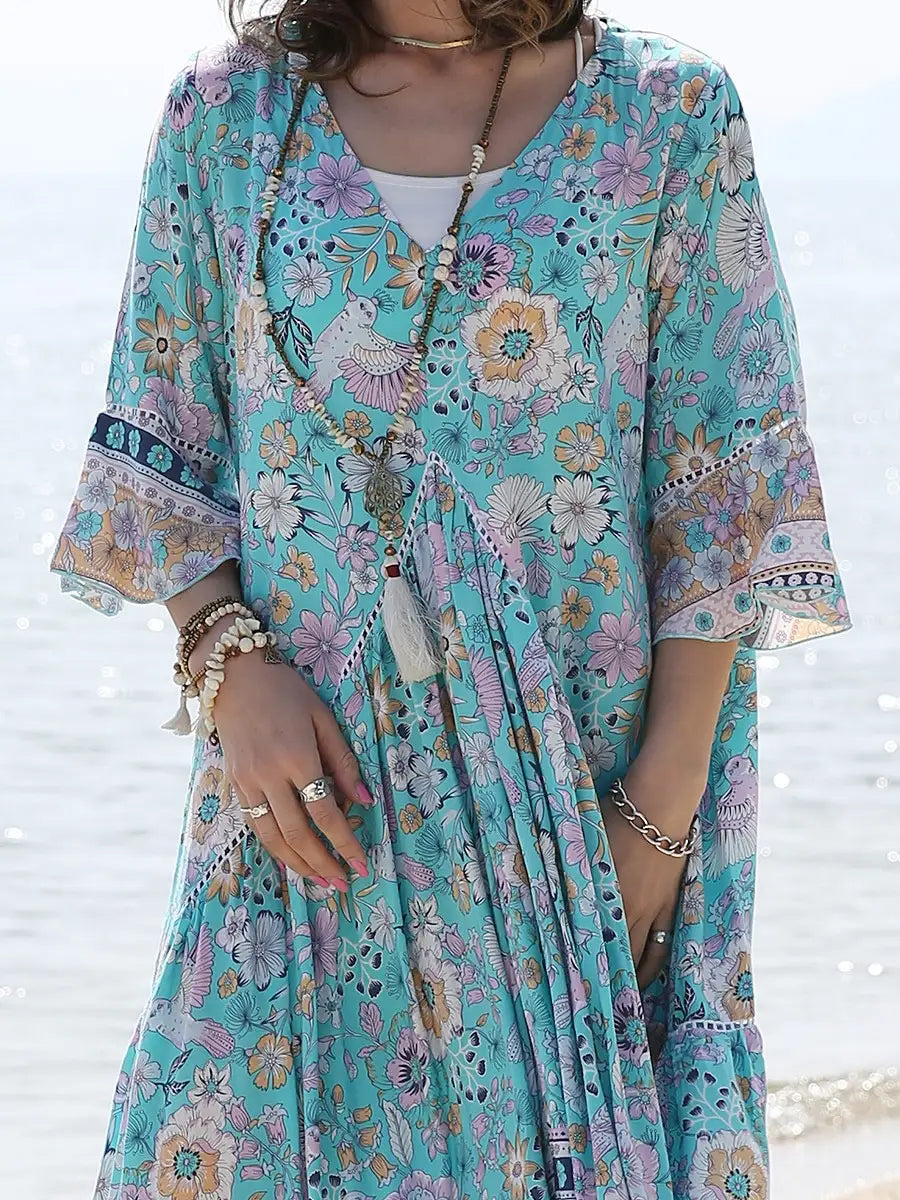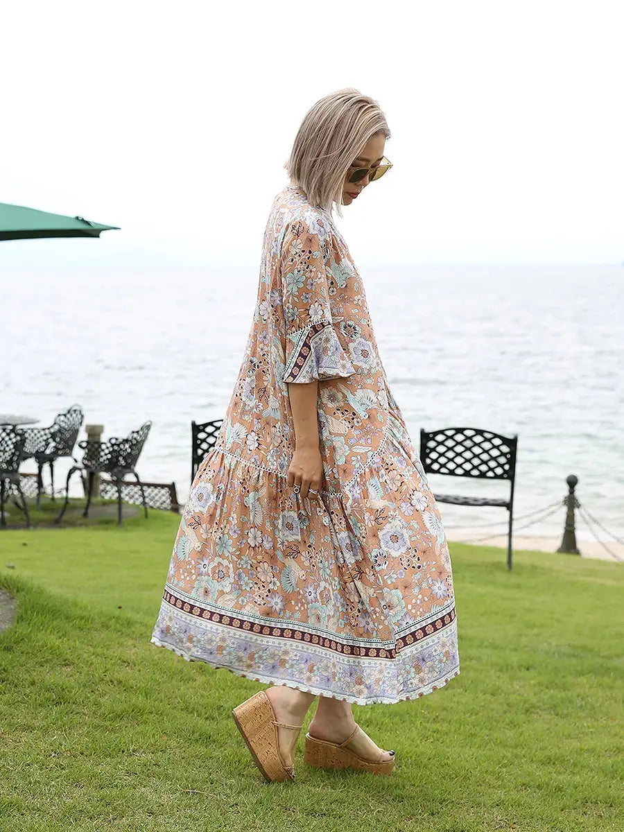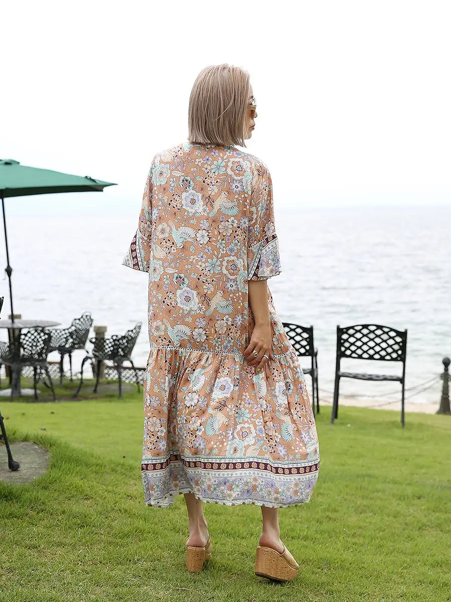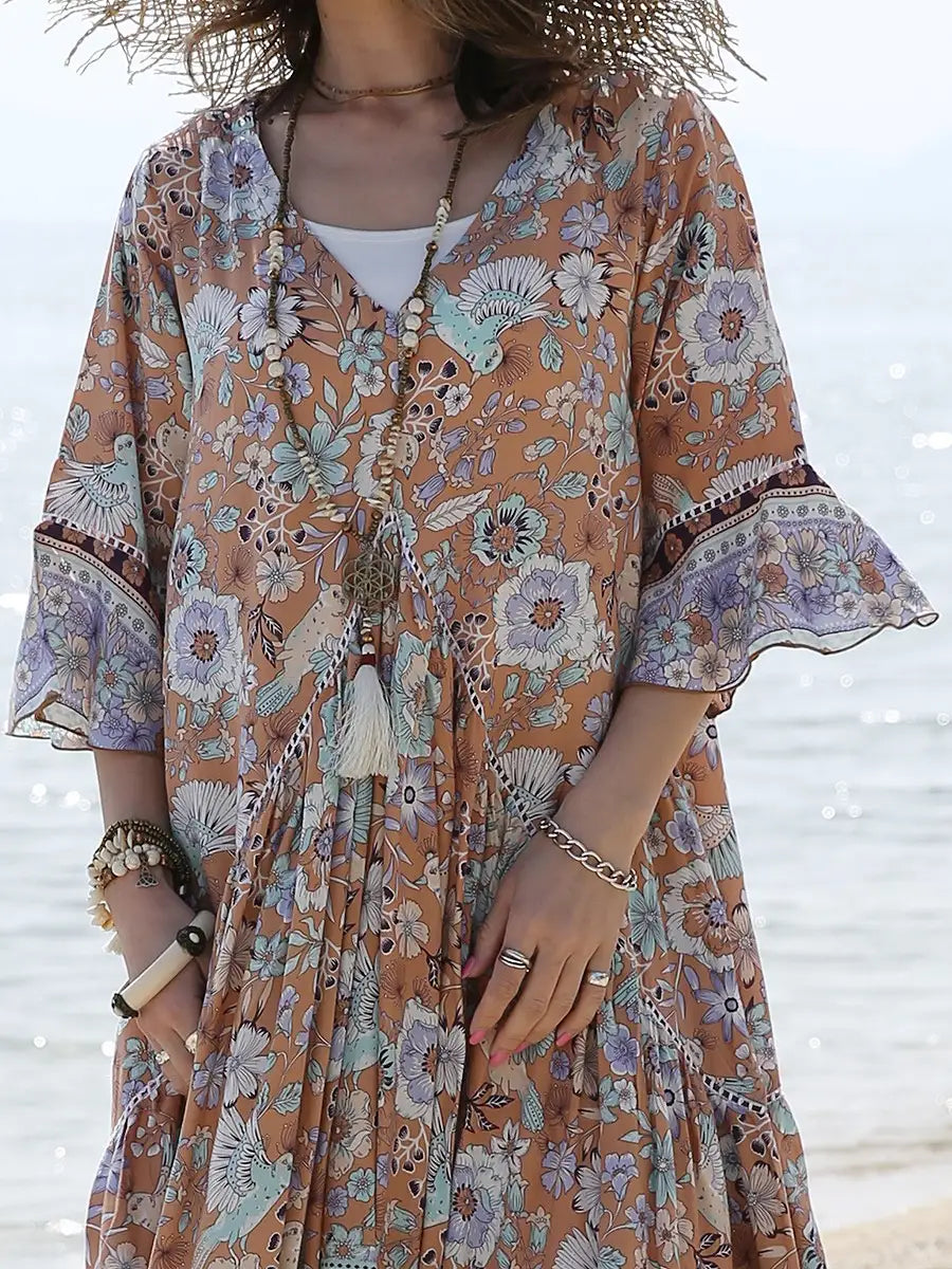 お花とバードが全体にプリントされた大人カワイイリゾートワンピースです。