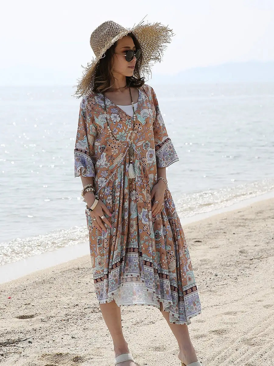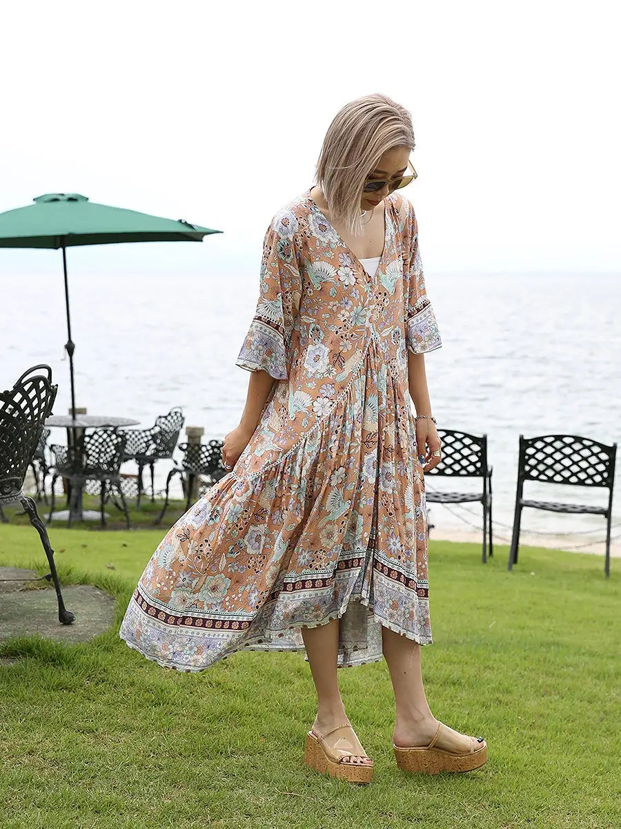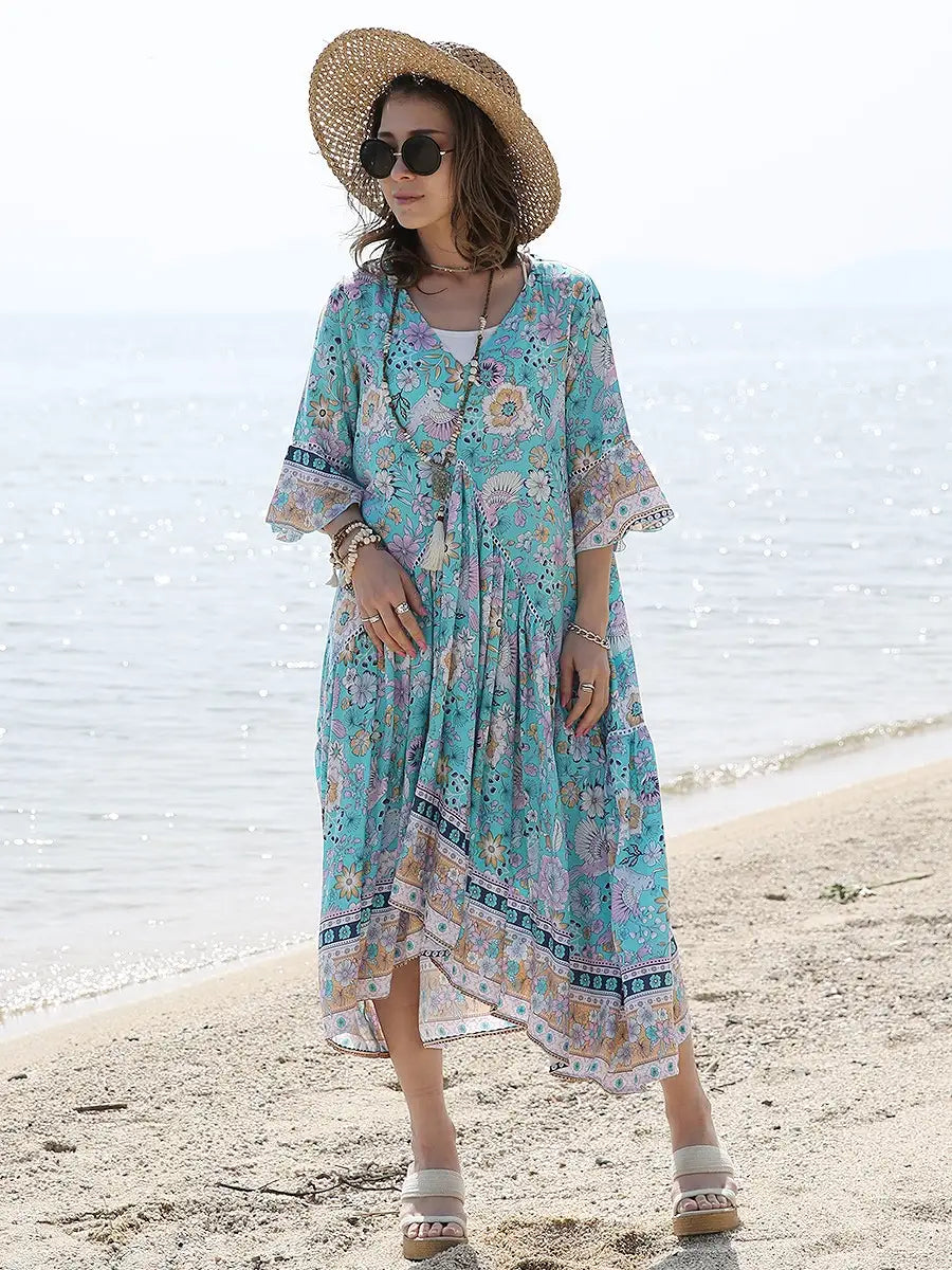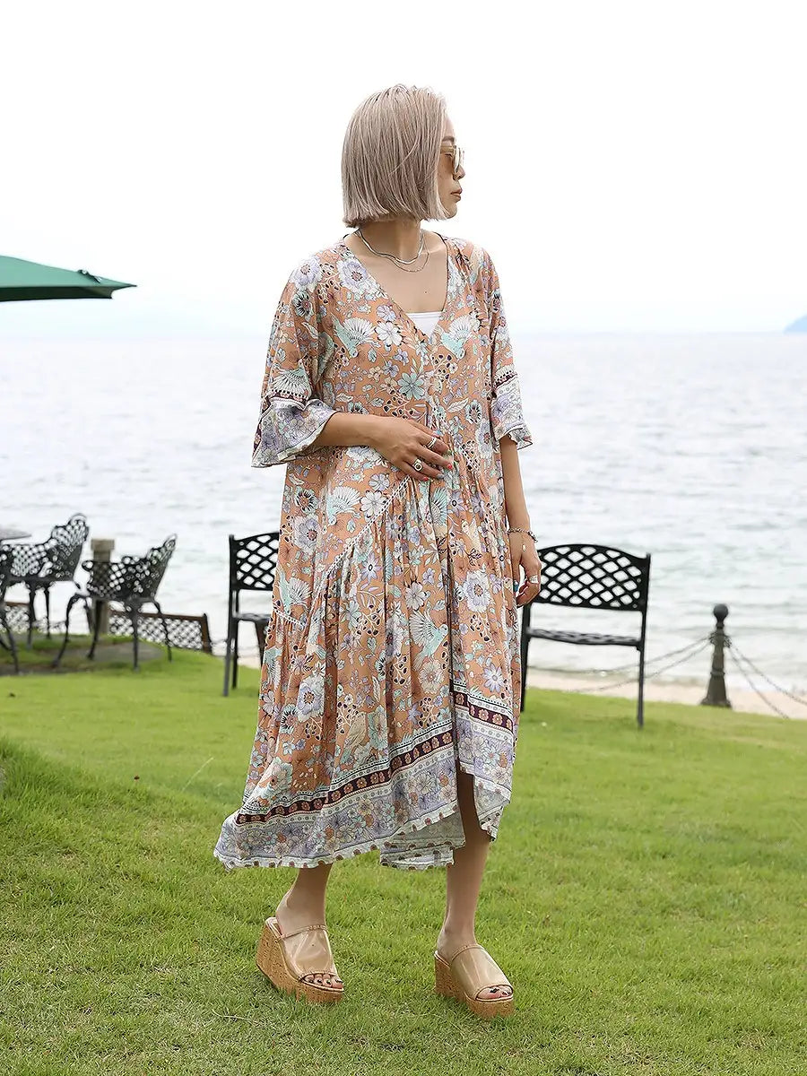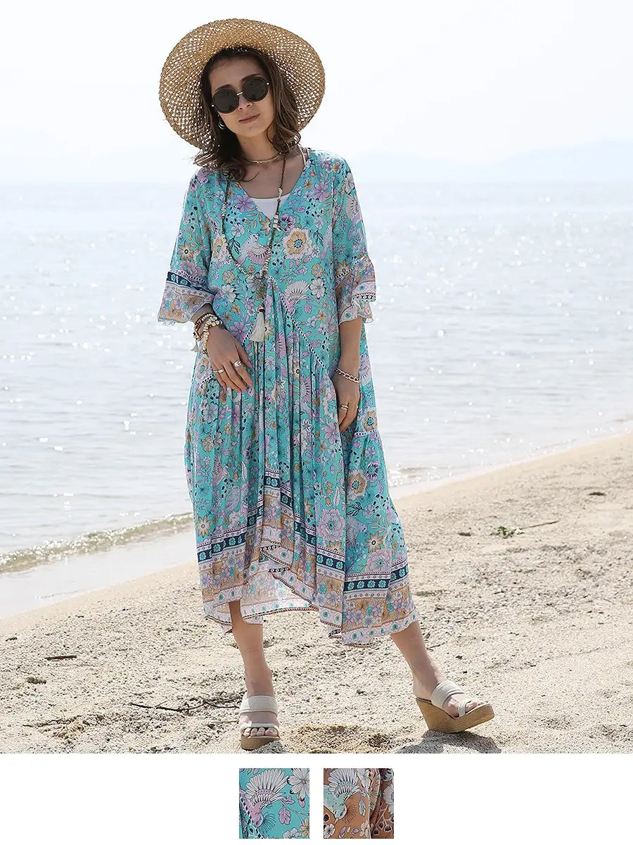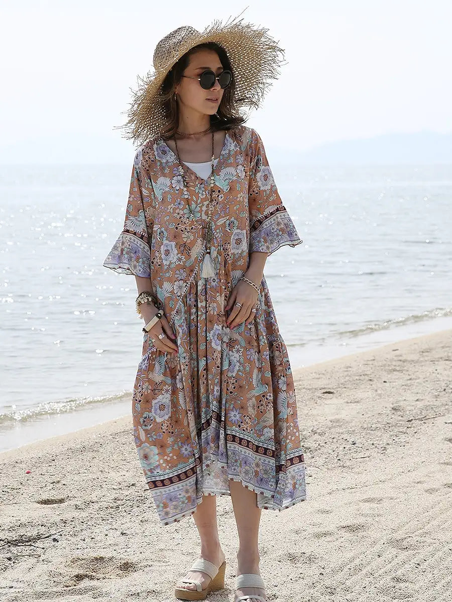 お花とバードが全体にプリントされた大人カワイイリゾートワンピースです。