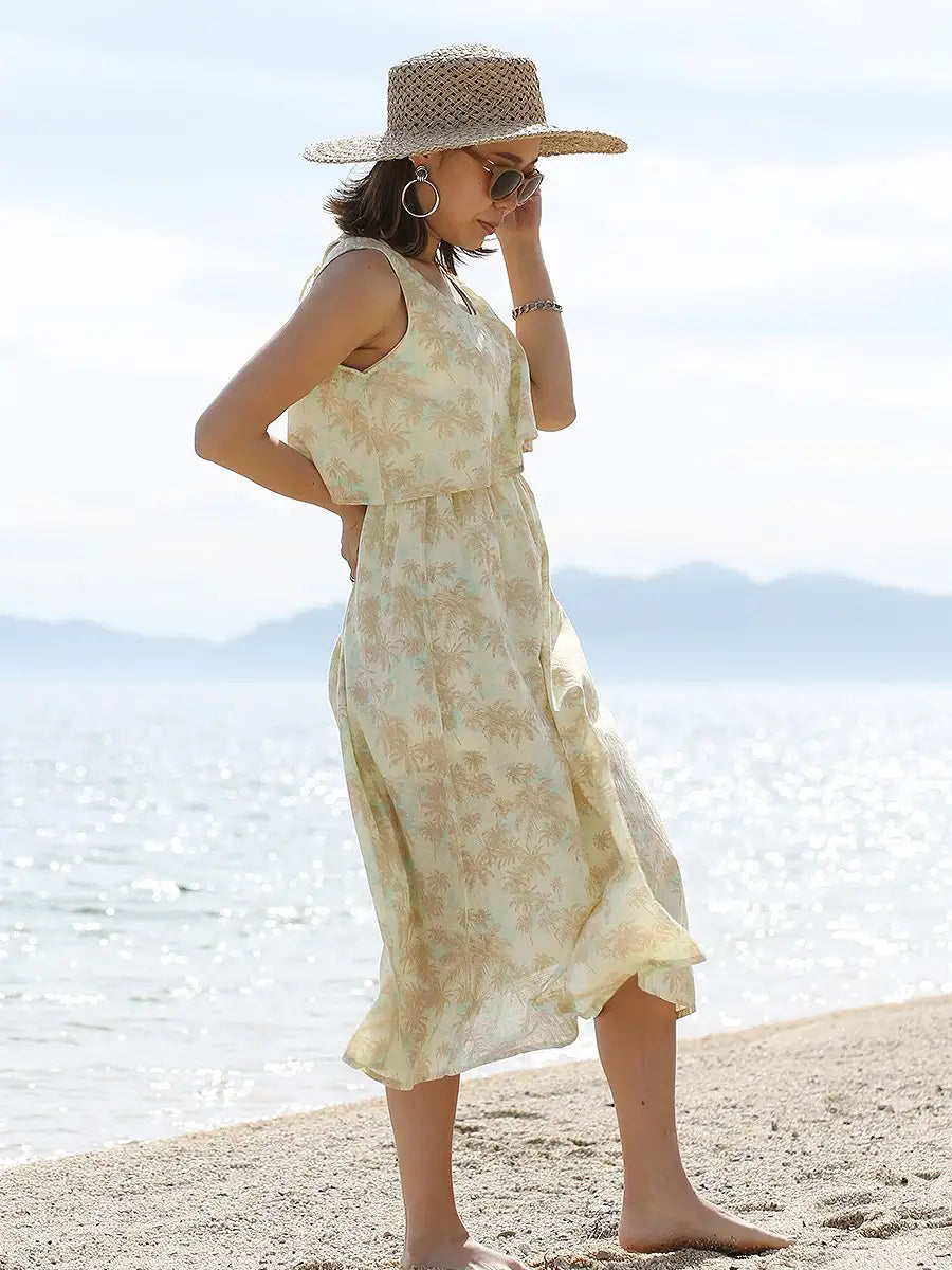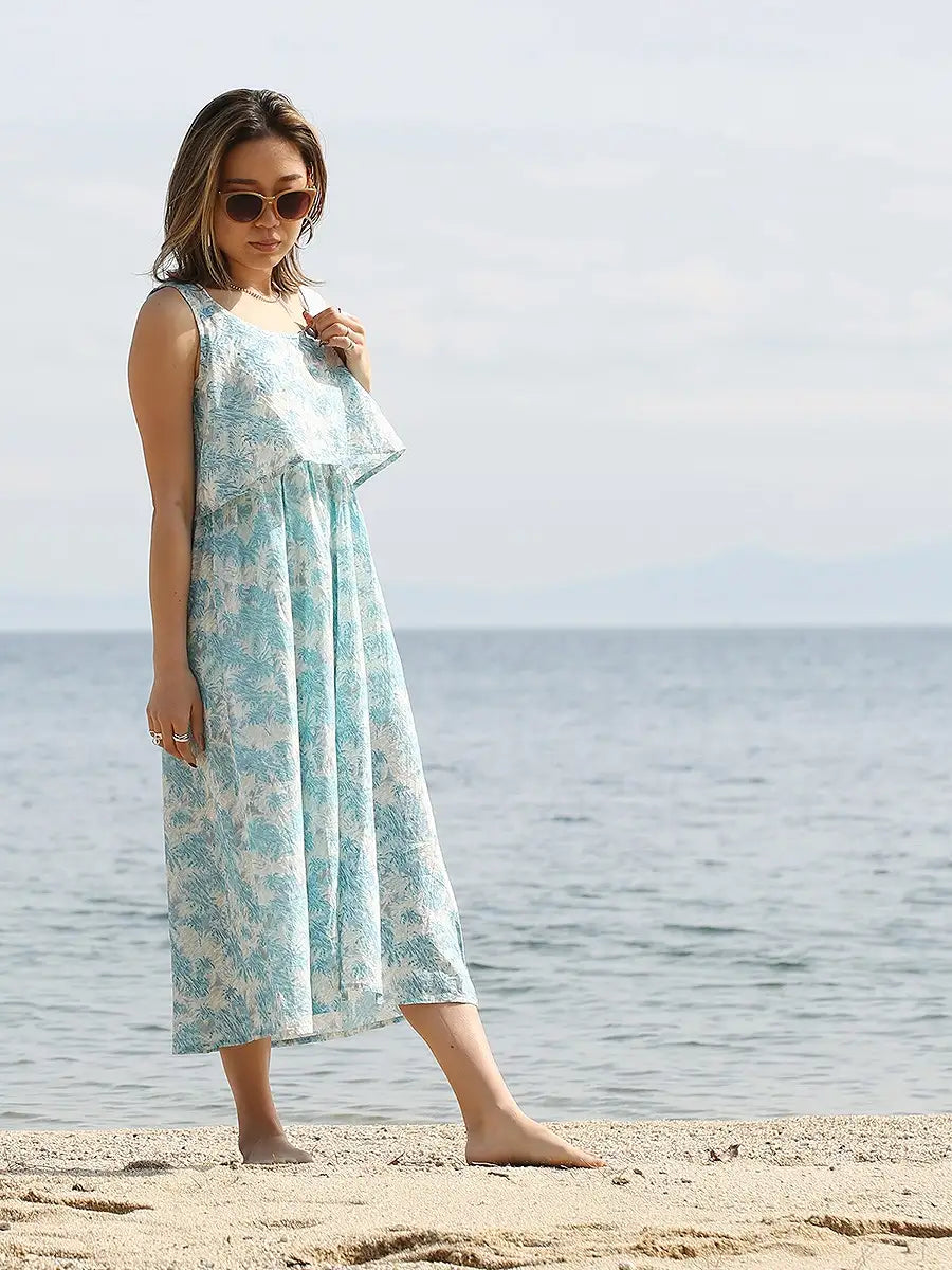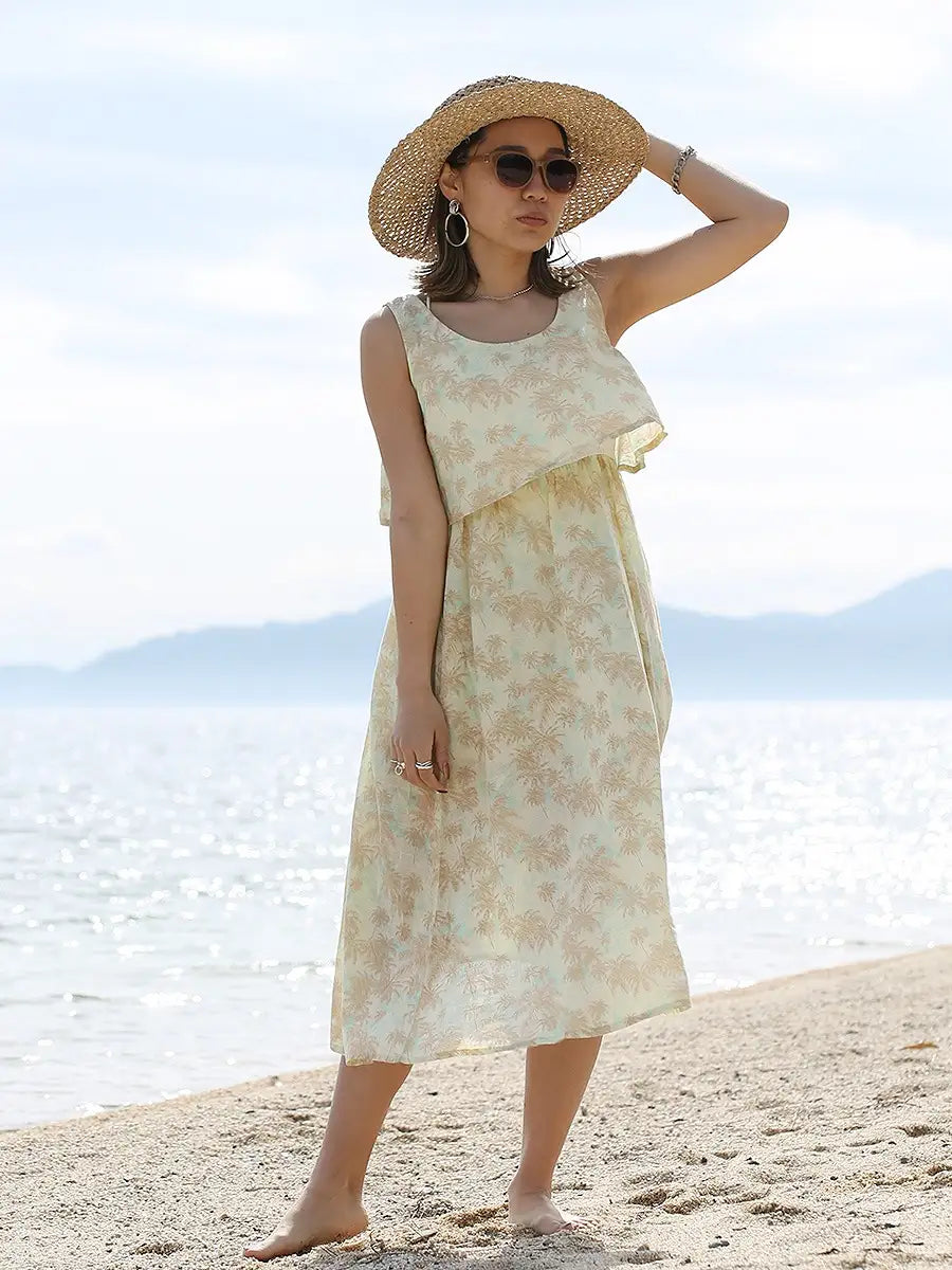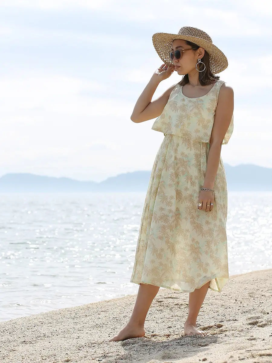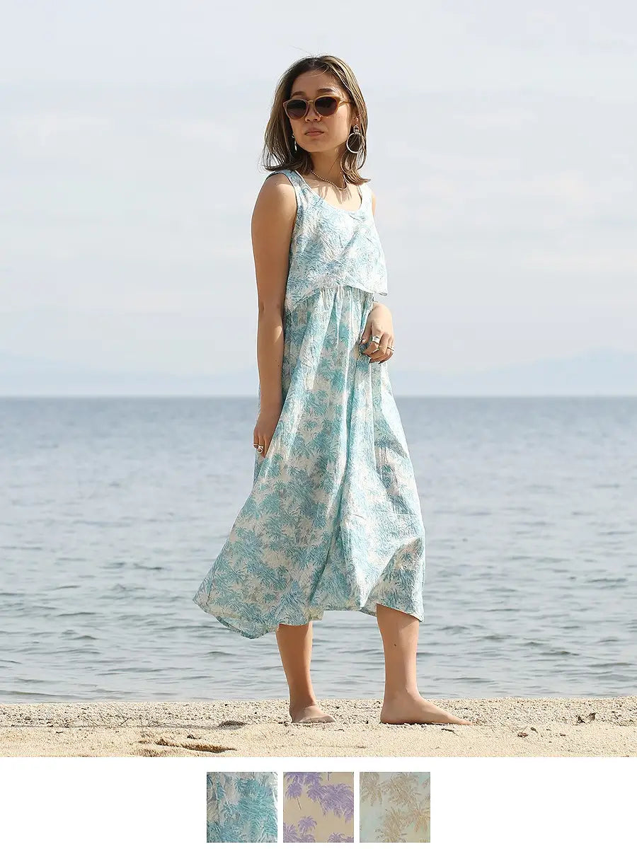 パームツリー柄をモチーフにした総柄デザインのリゾートワンピースです。