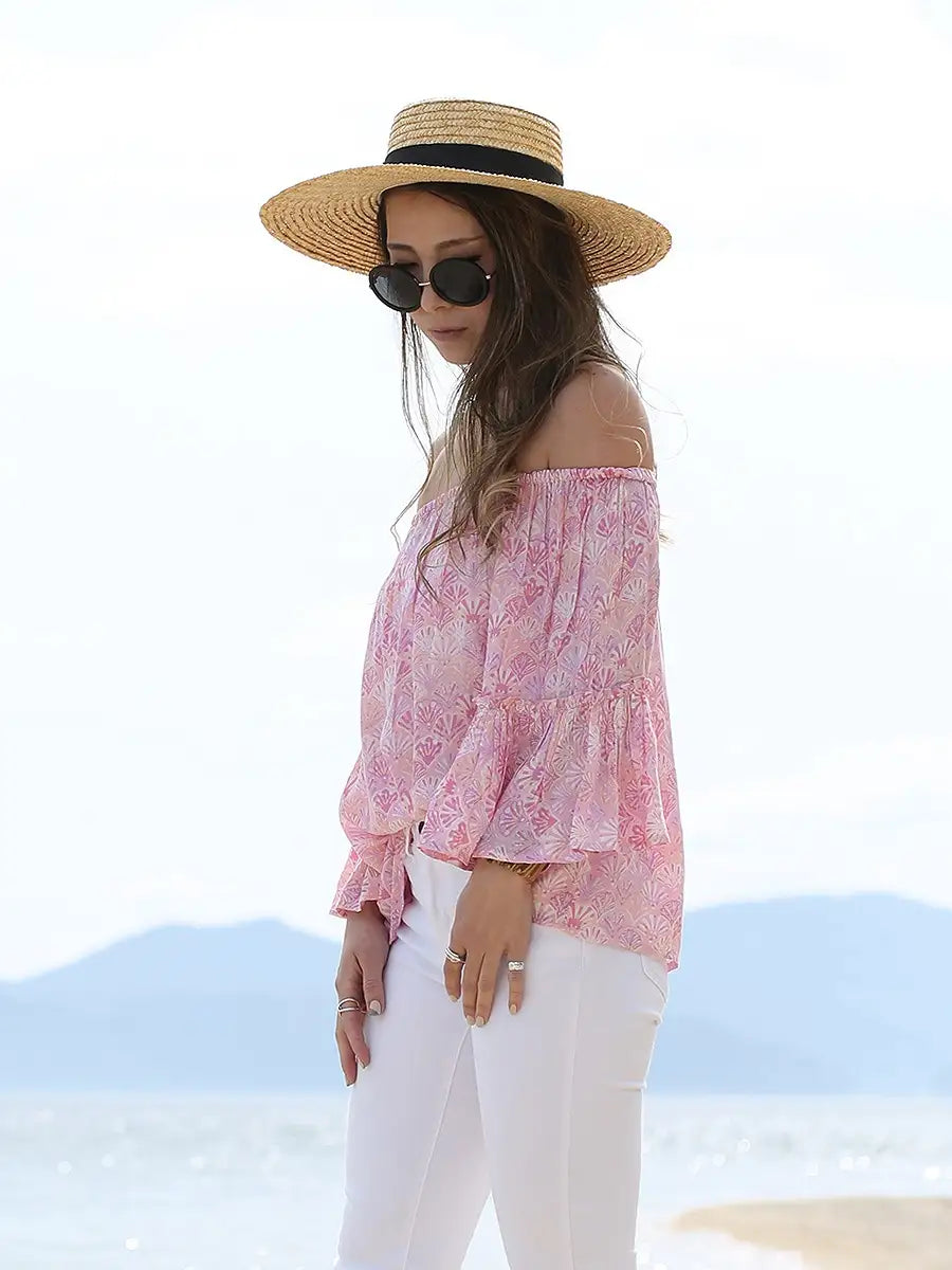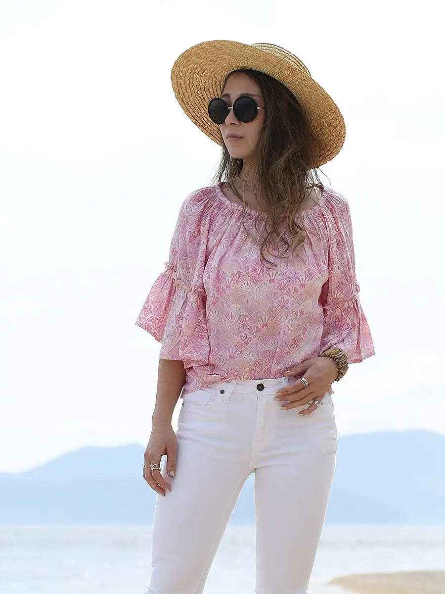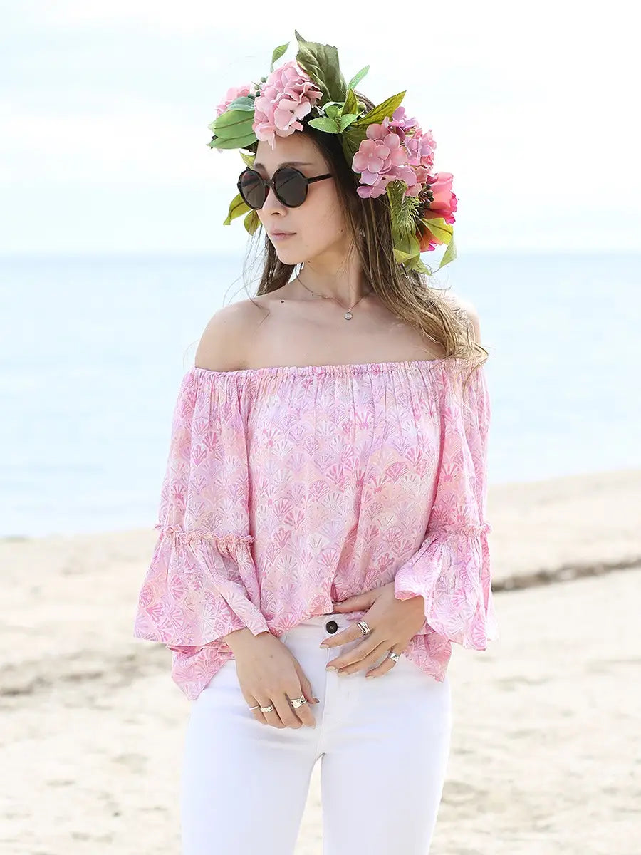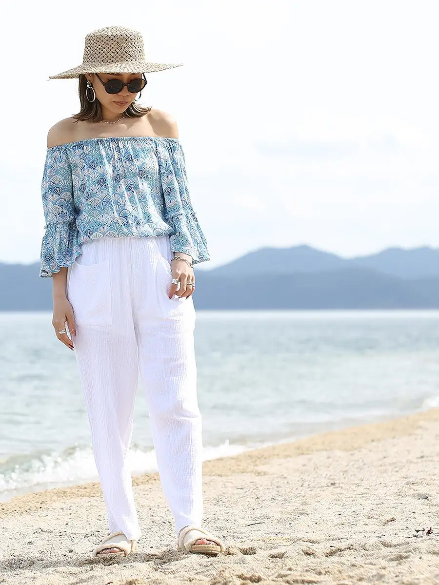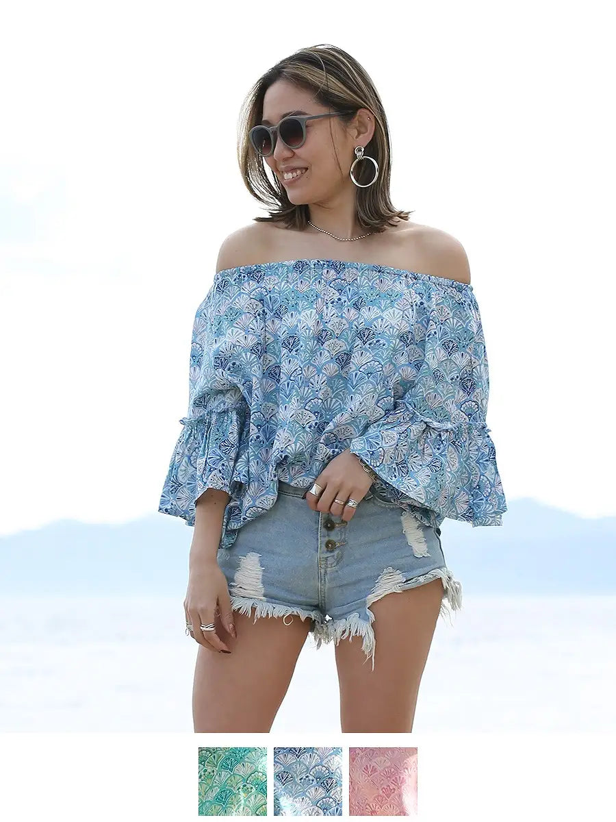 ビーチ・リゾートシーンで映える可愛いシェル柄のトップスです。