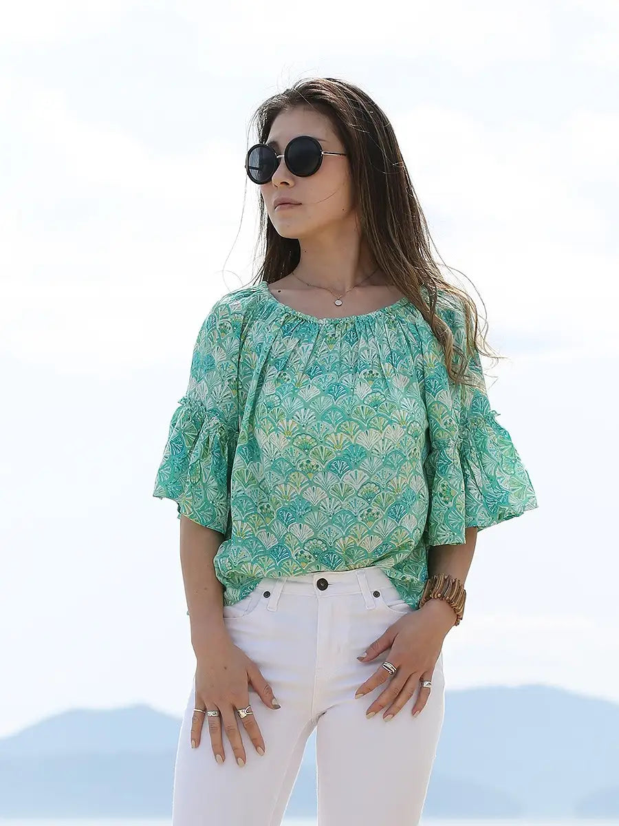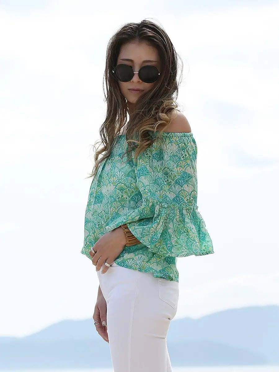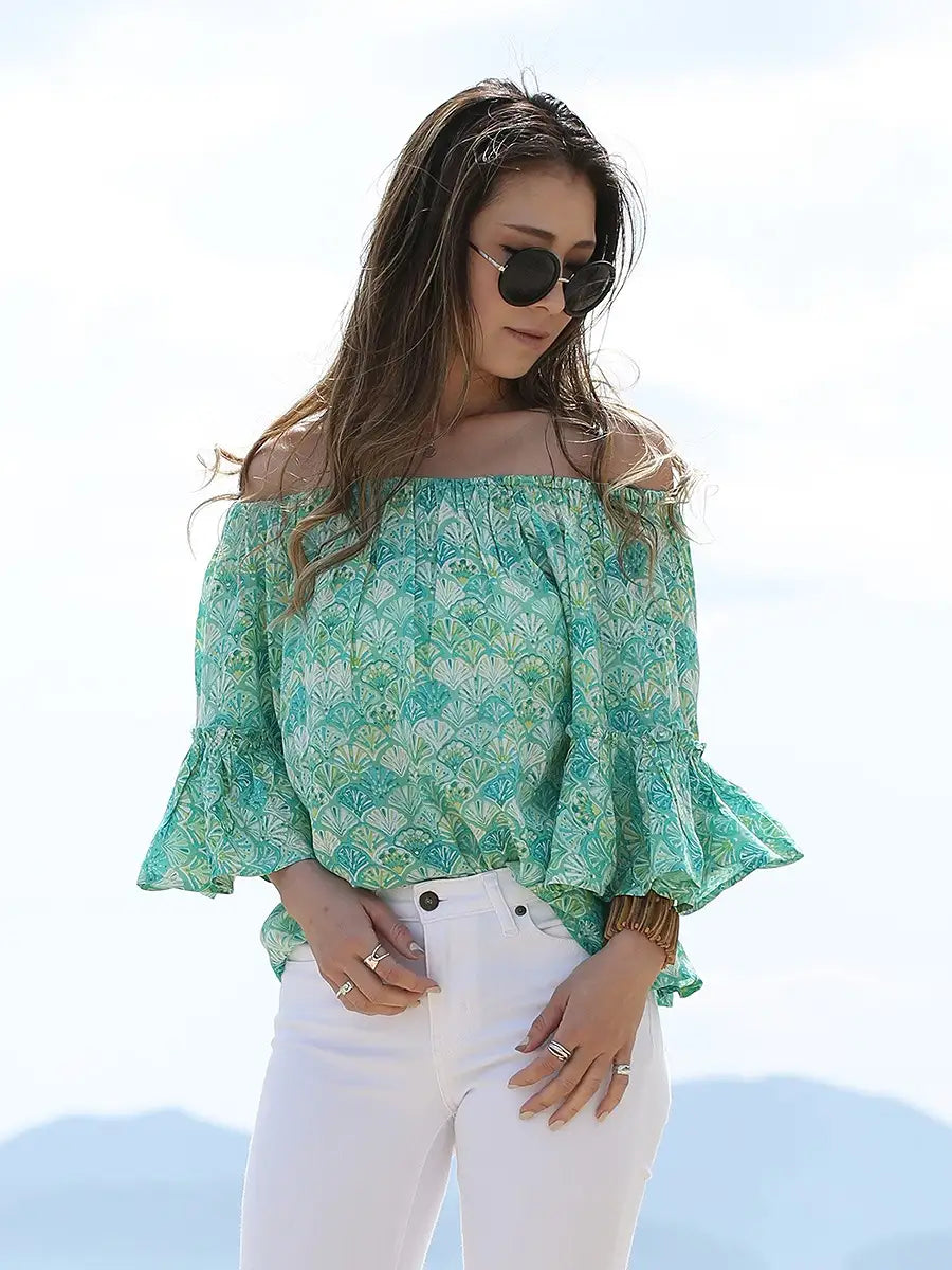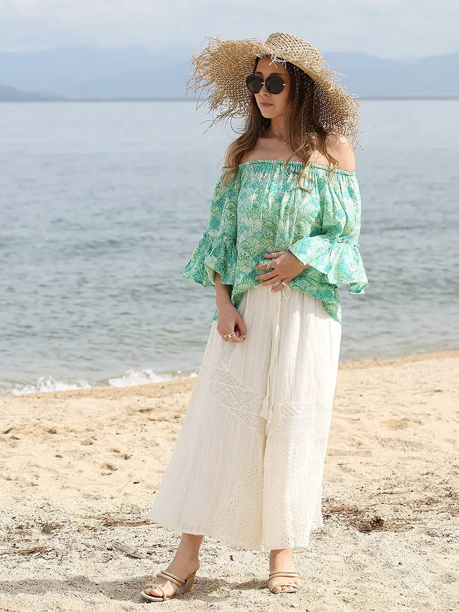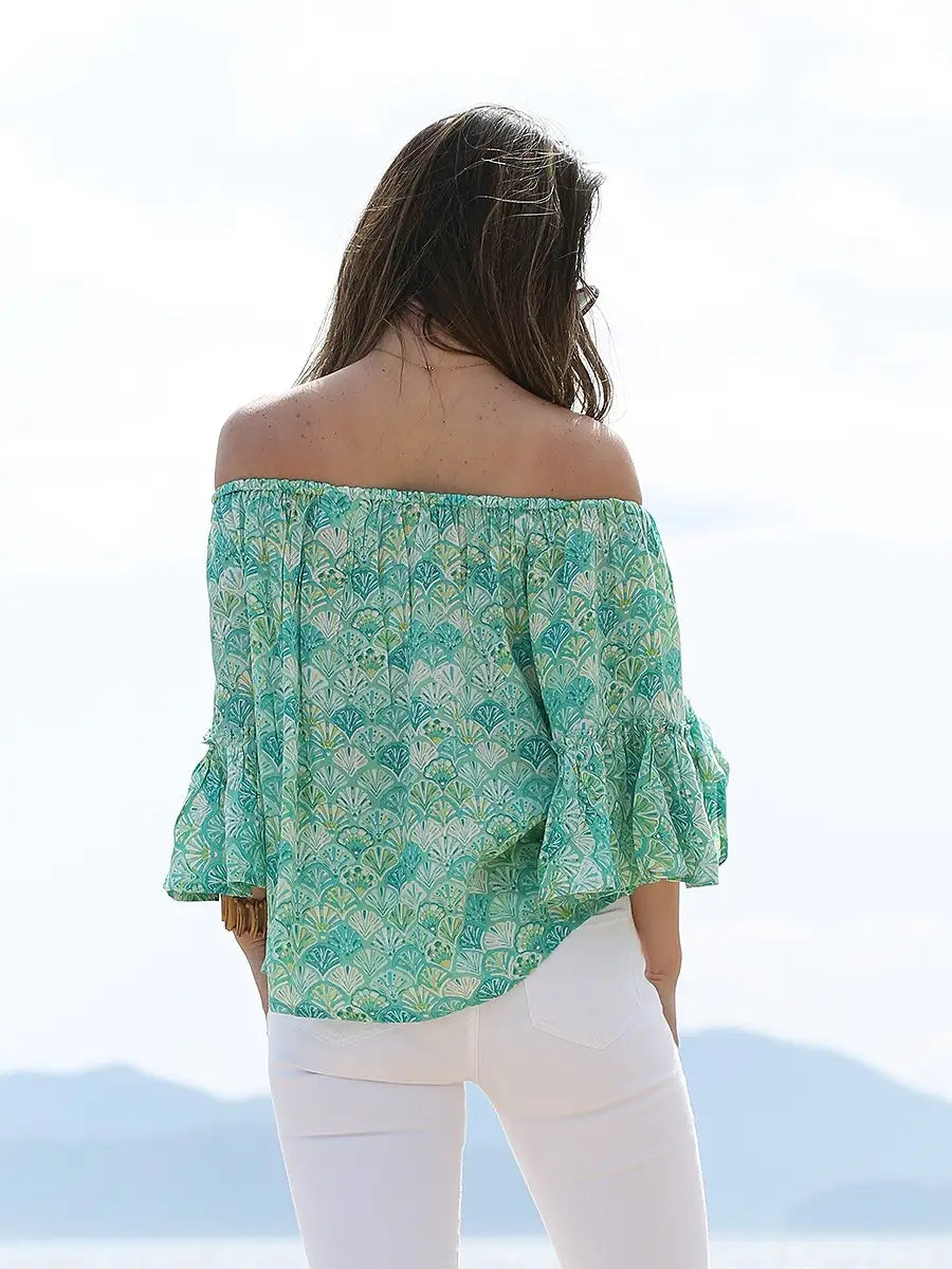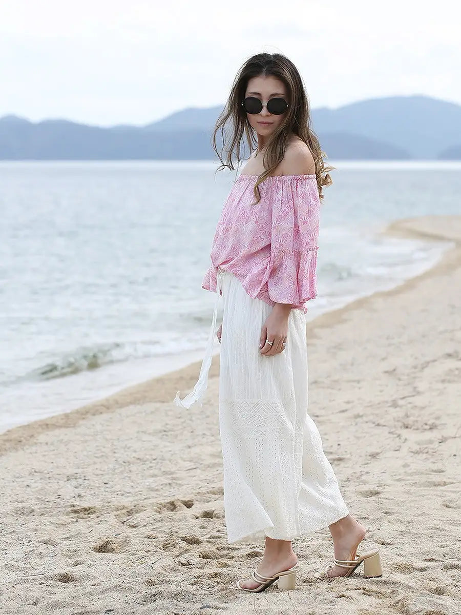 ビーチ・リゾートシーンで映える可愛いシェル柄のトップスです。