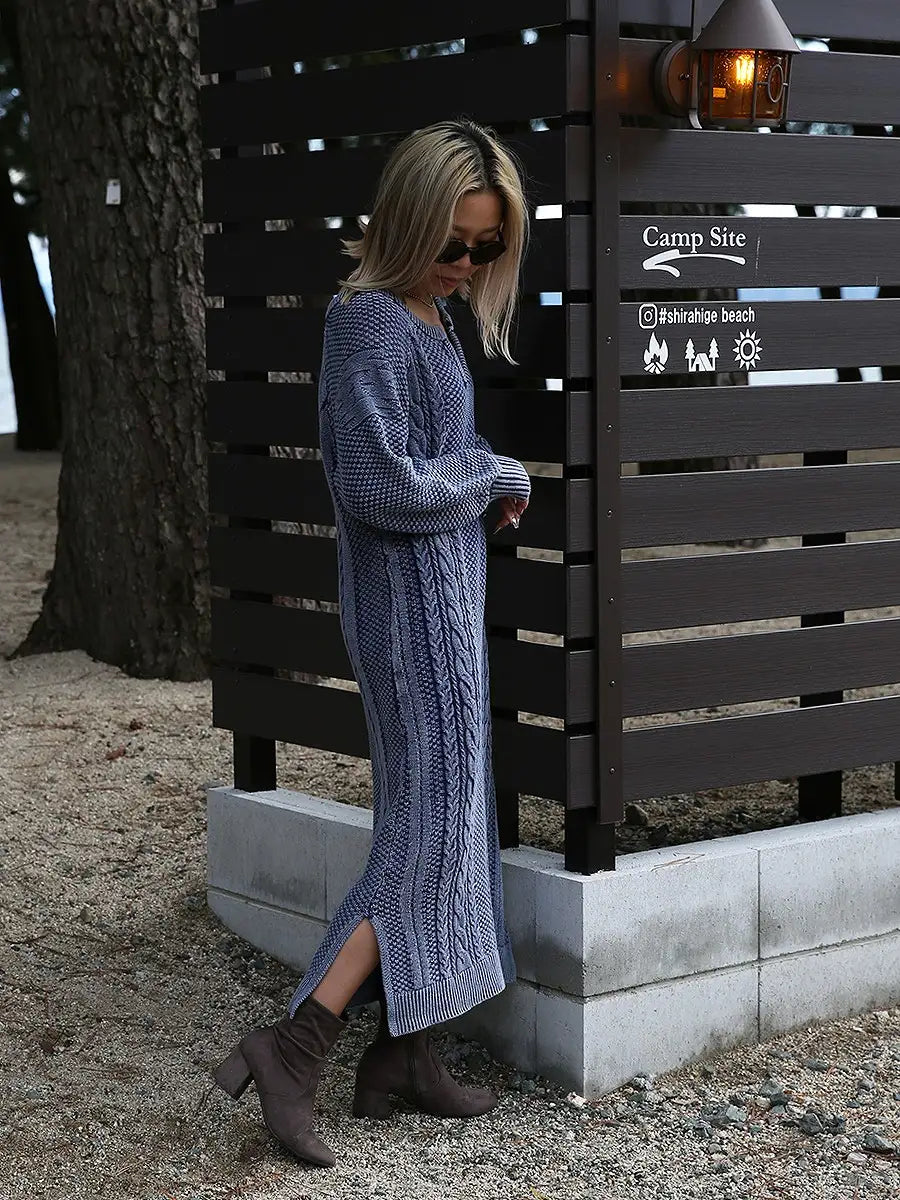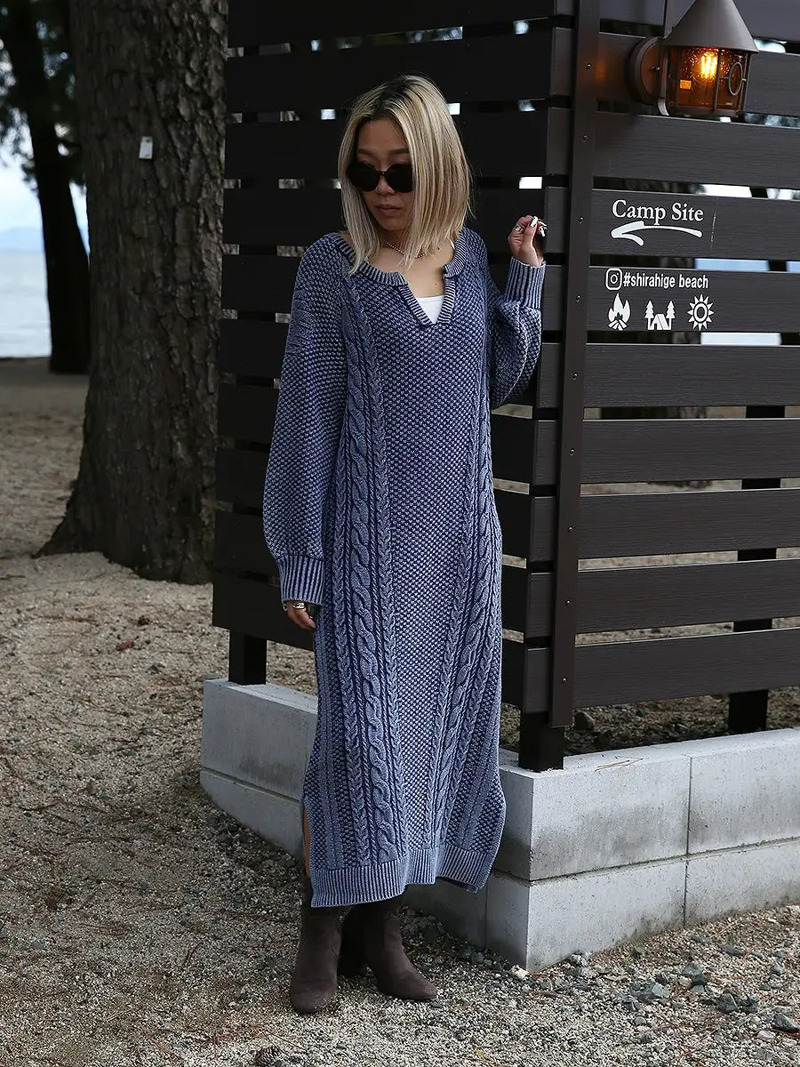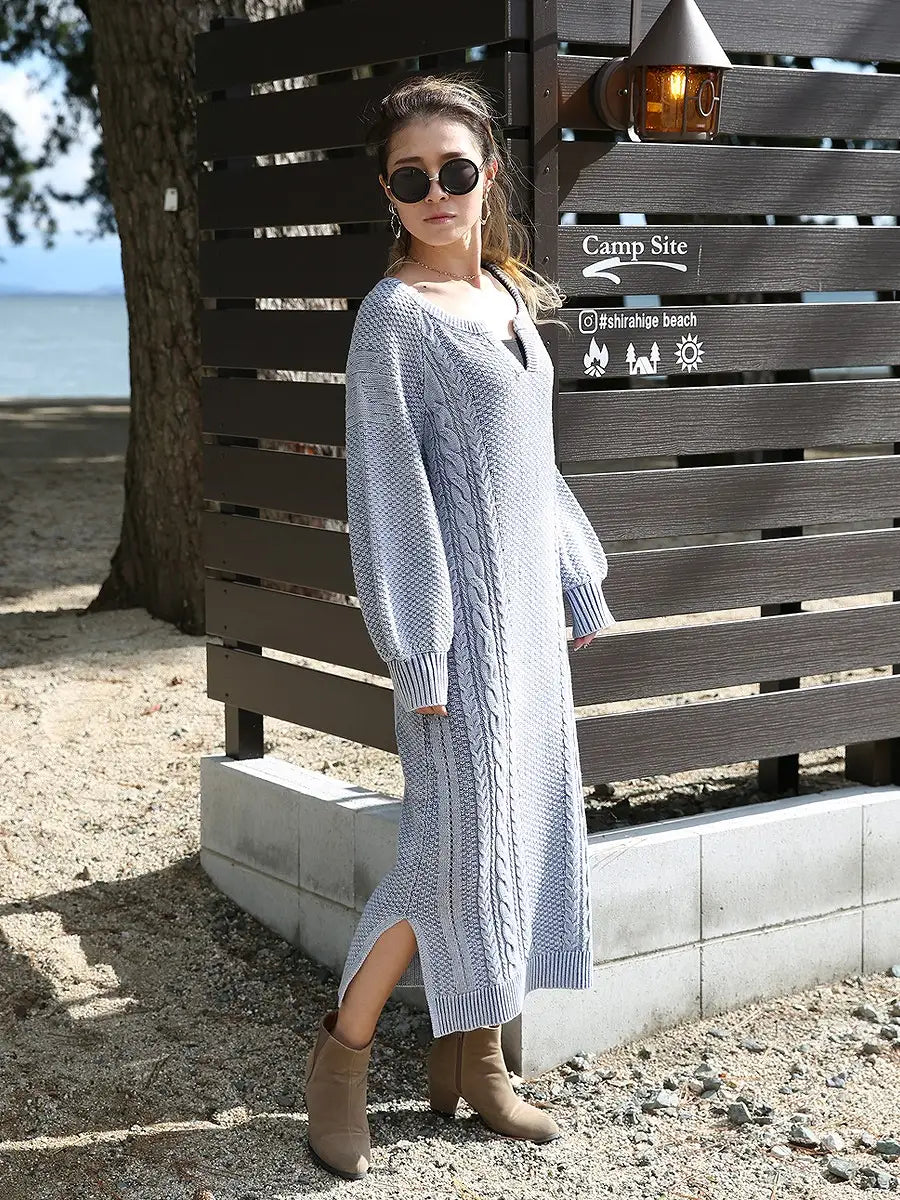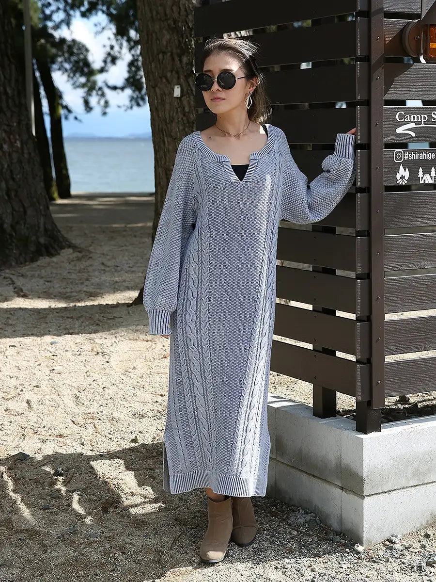 ゆるシルエットの落ち感のあるニットロングワンピース。