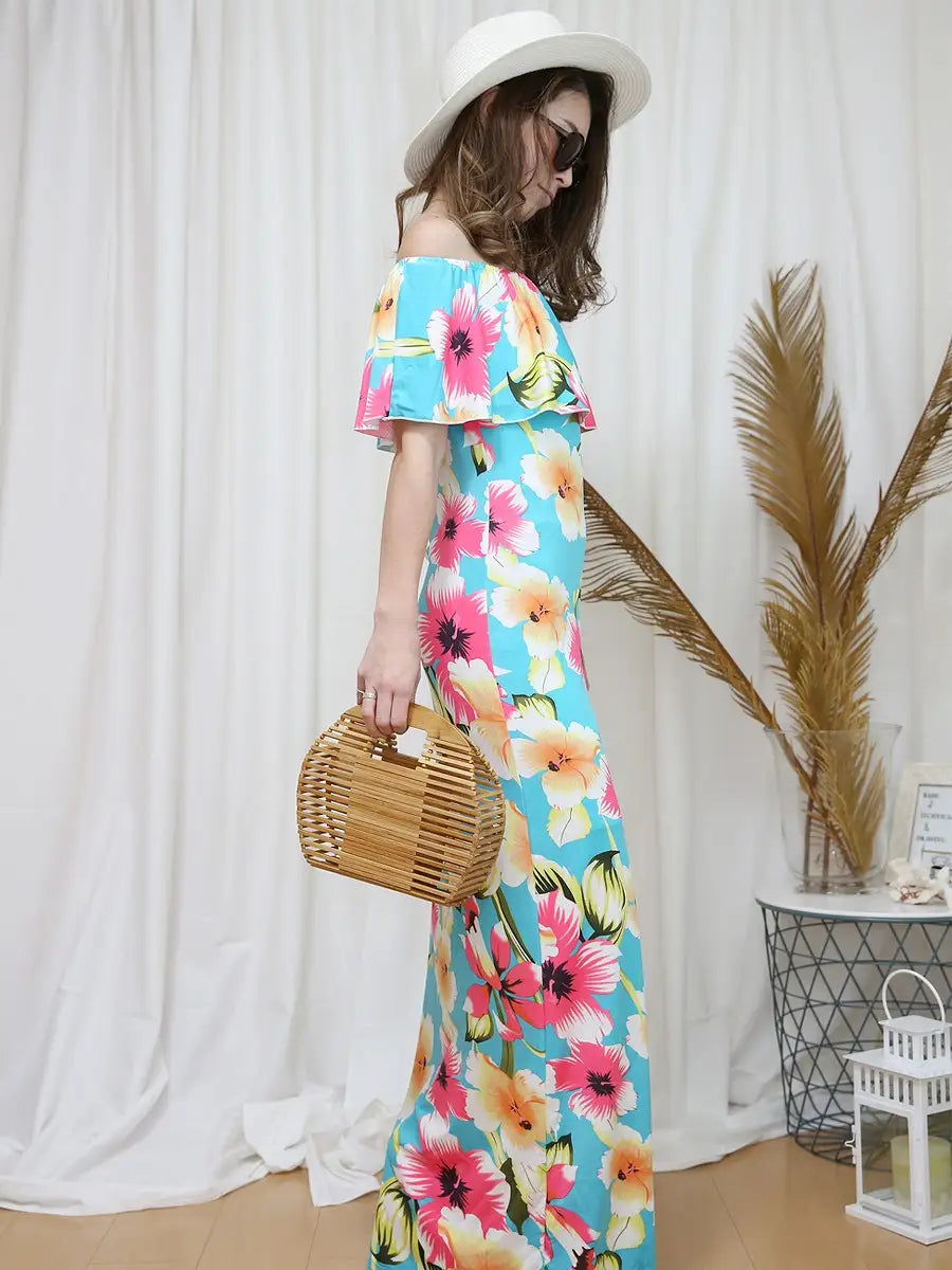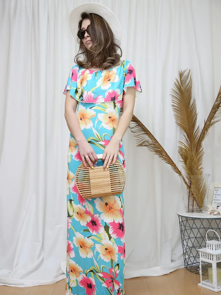 オフショル4WAYフリル花柄ロングワンピース/スカイブルー