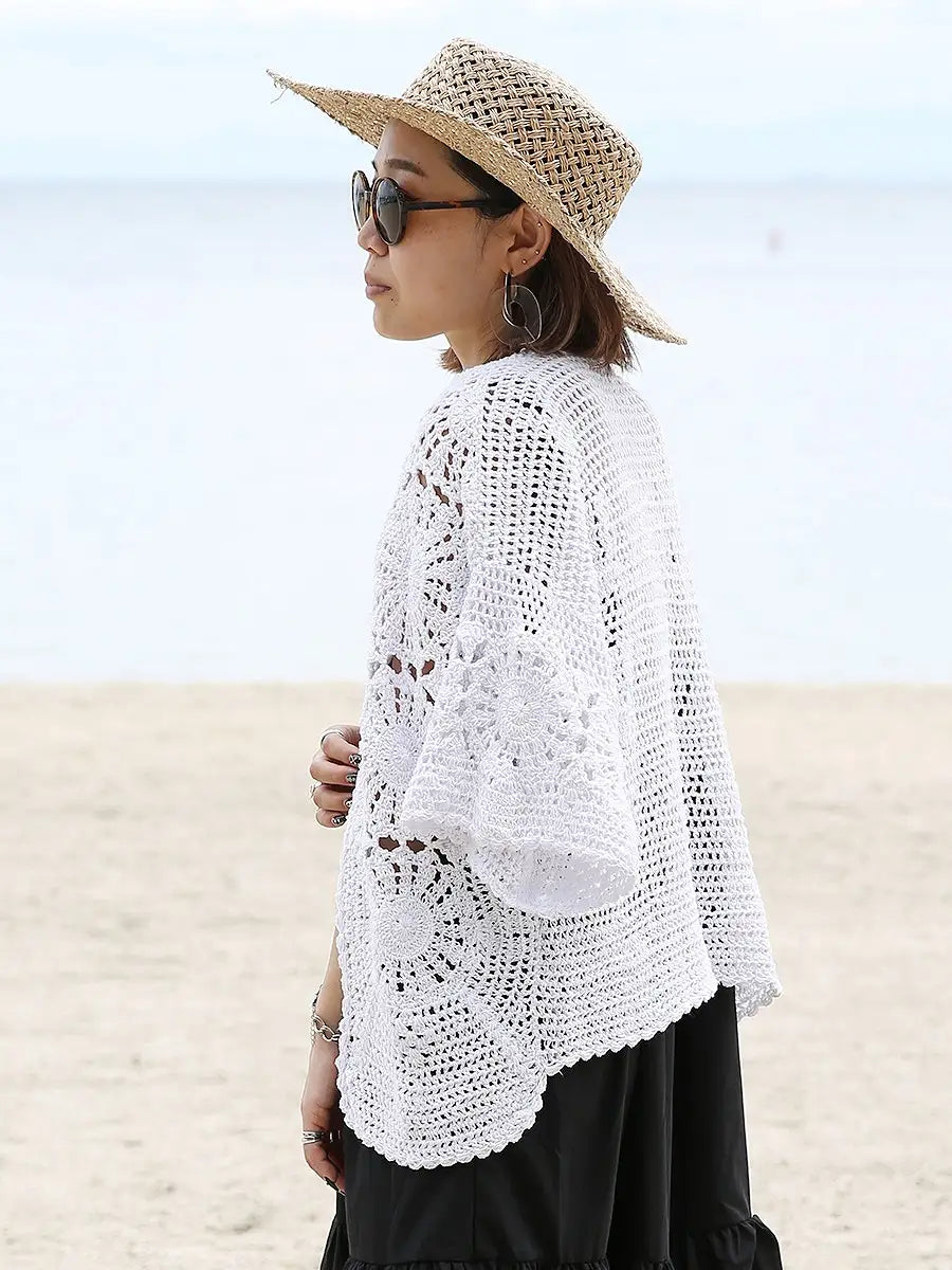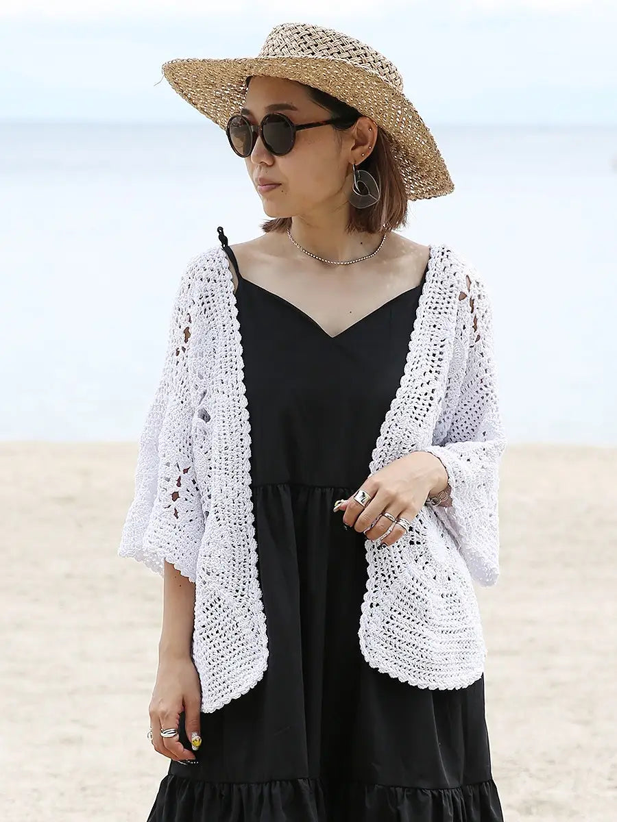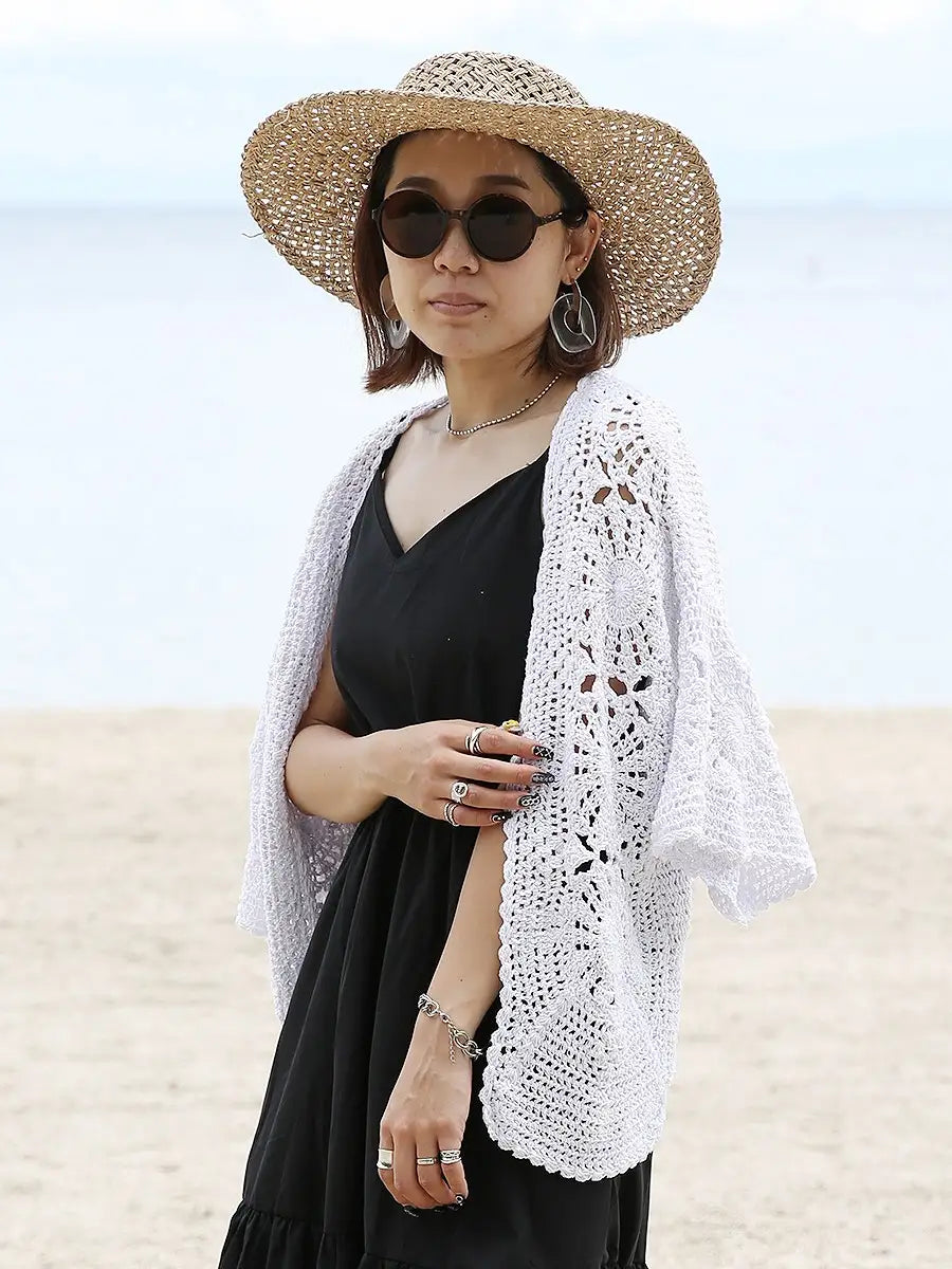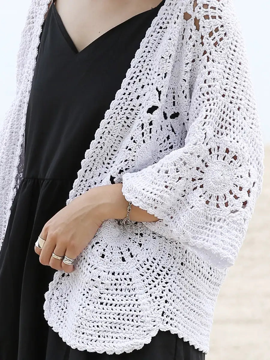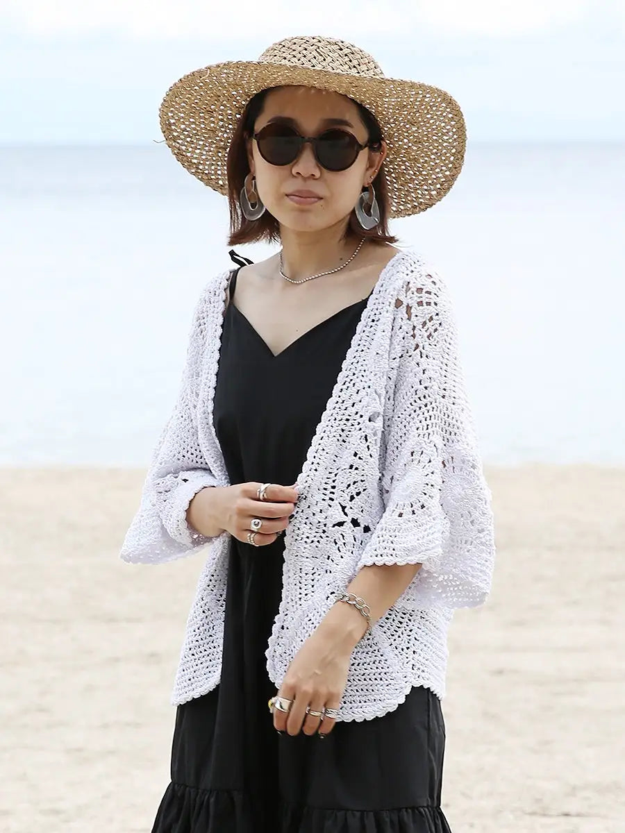 お洒落なクロシェ編みの五分袖カーディガン。