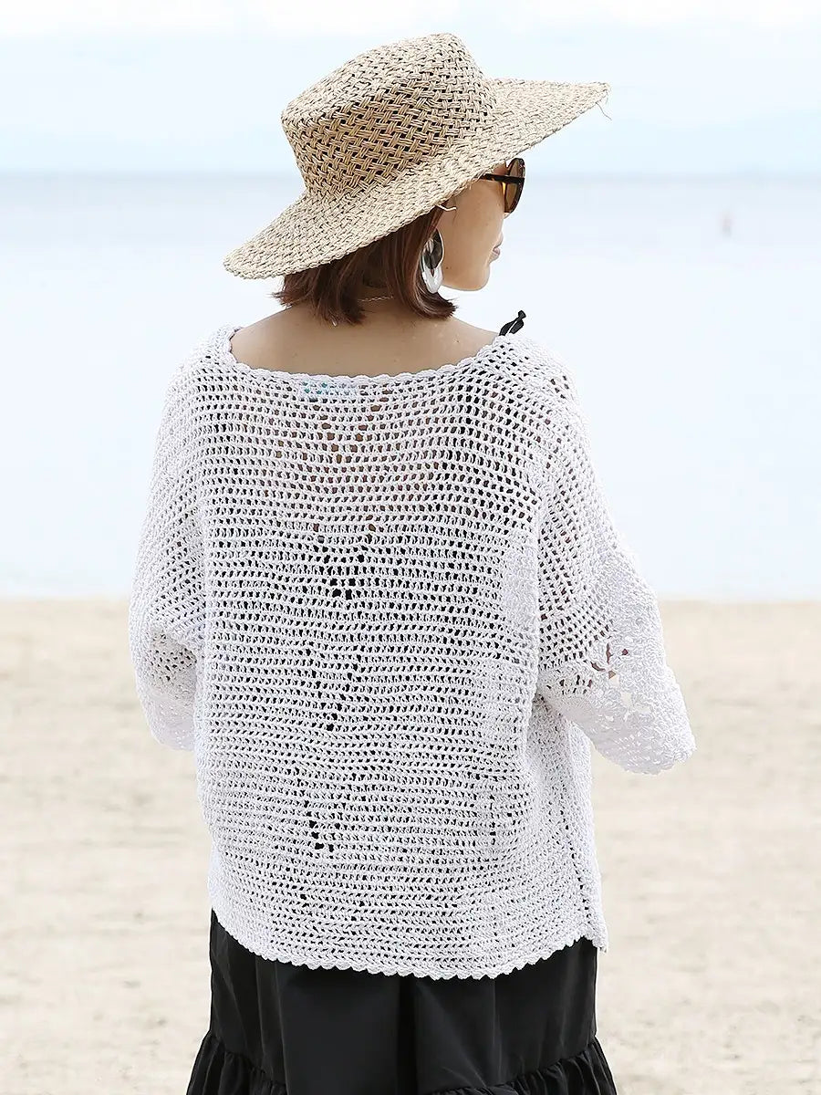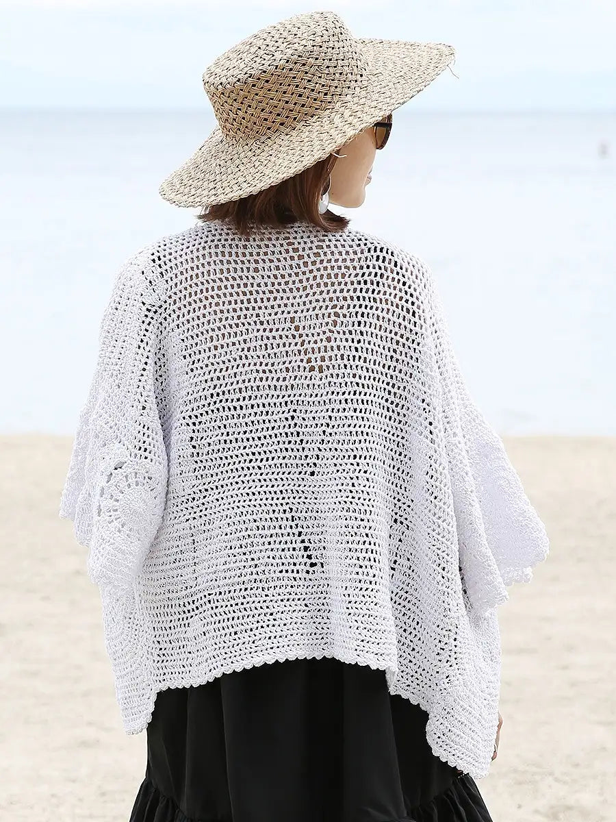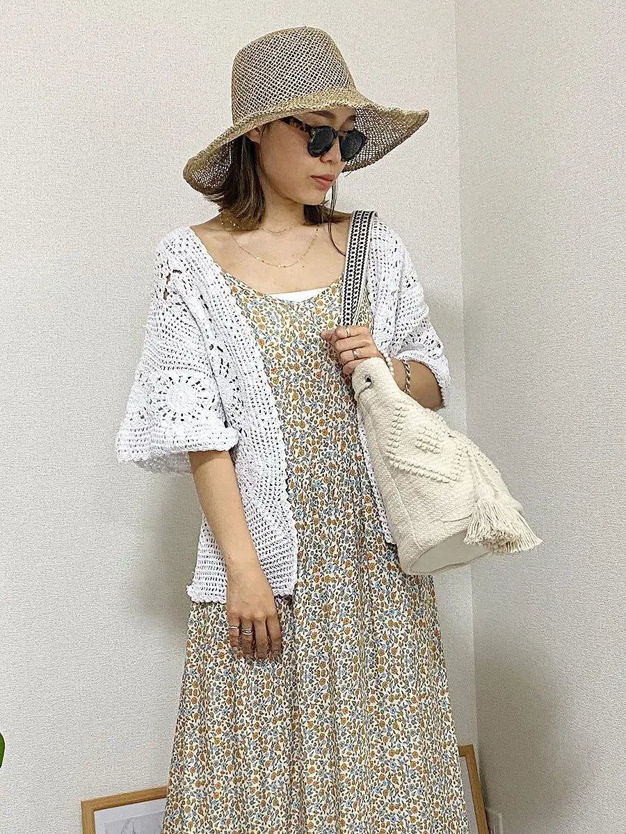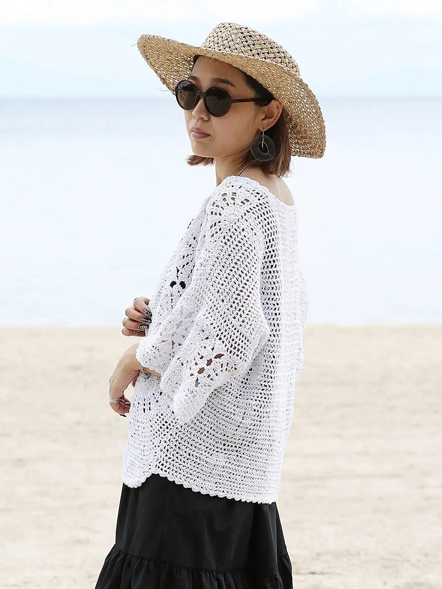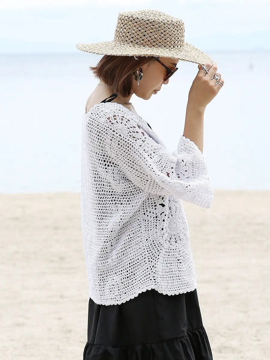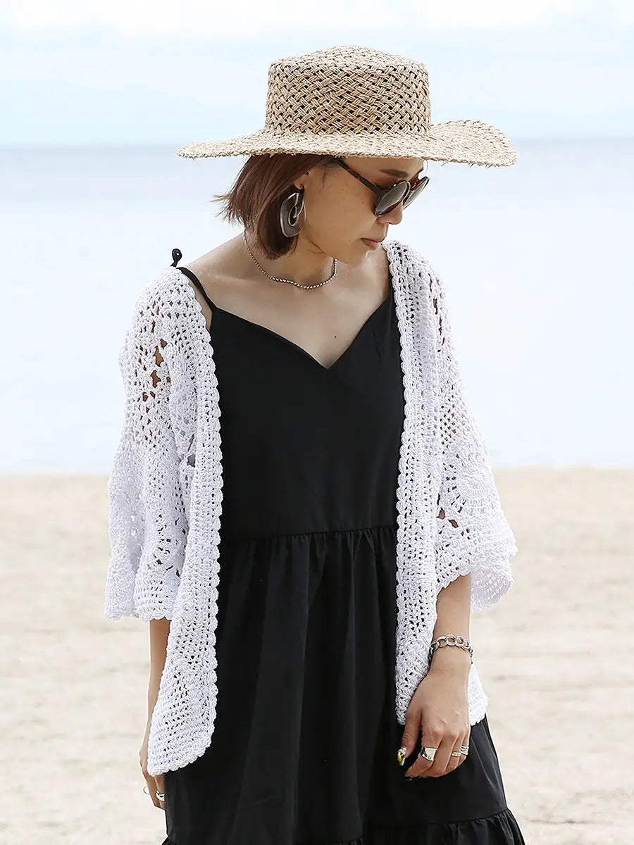 お洒落なクロシェ編みの五分袖カーディガン。