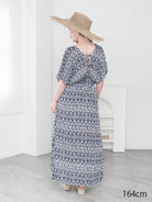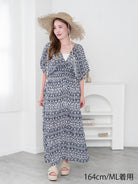 総柄デザインは着痩せ効果も期待できます。半袖スタイルで二の腕が隠れるマキシ丈ワンピースは大人気!