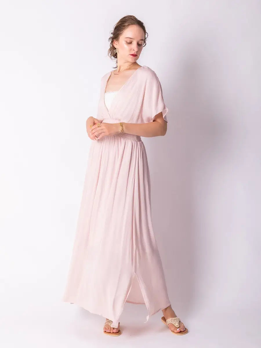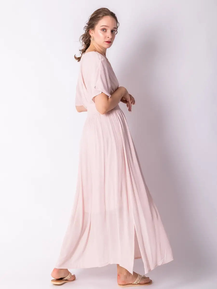 胸元が深いVネックになっていて、デコルテをきれいに演出してくれるマキシワンピです。