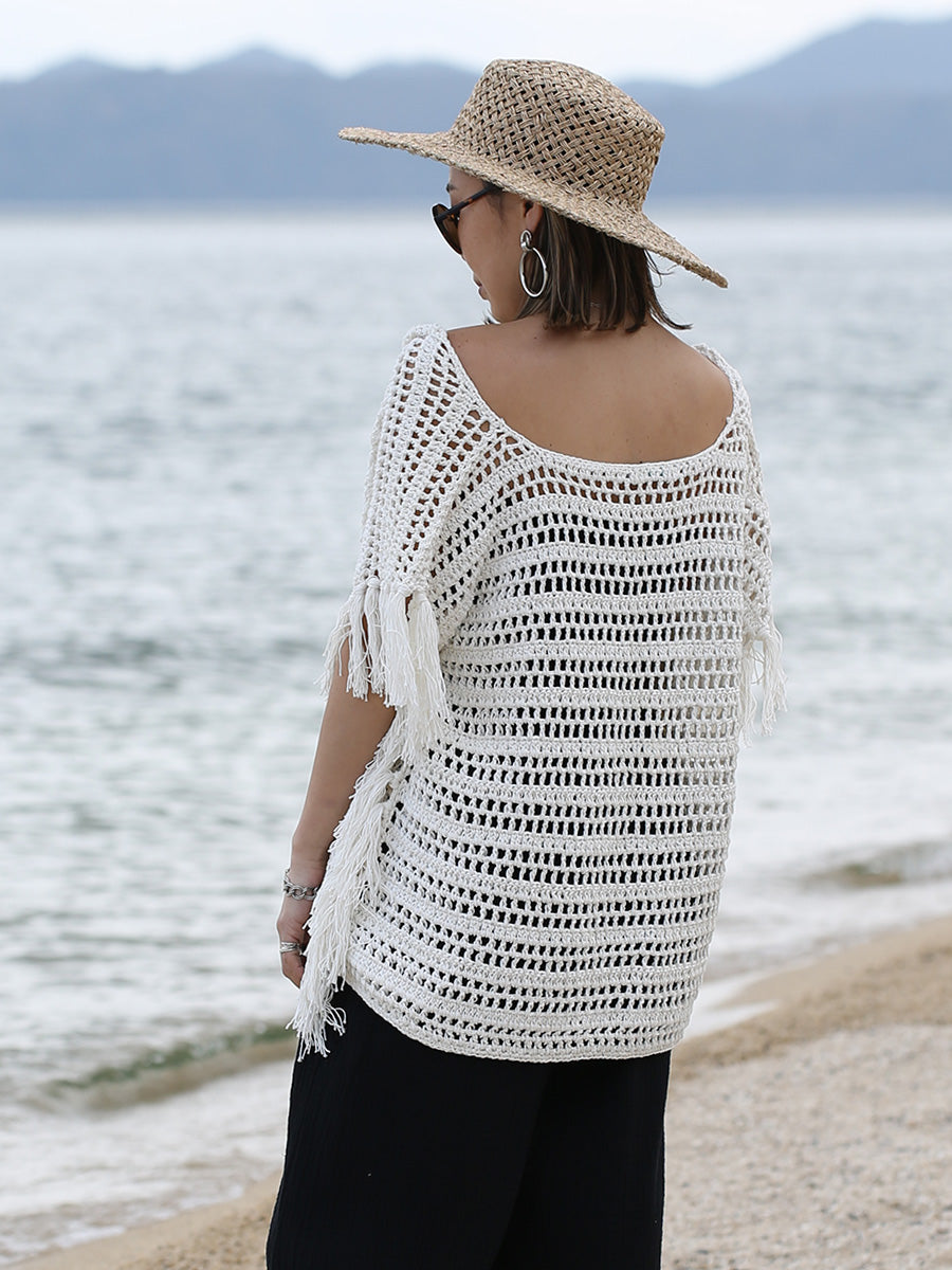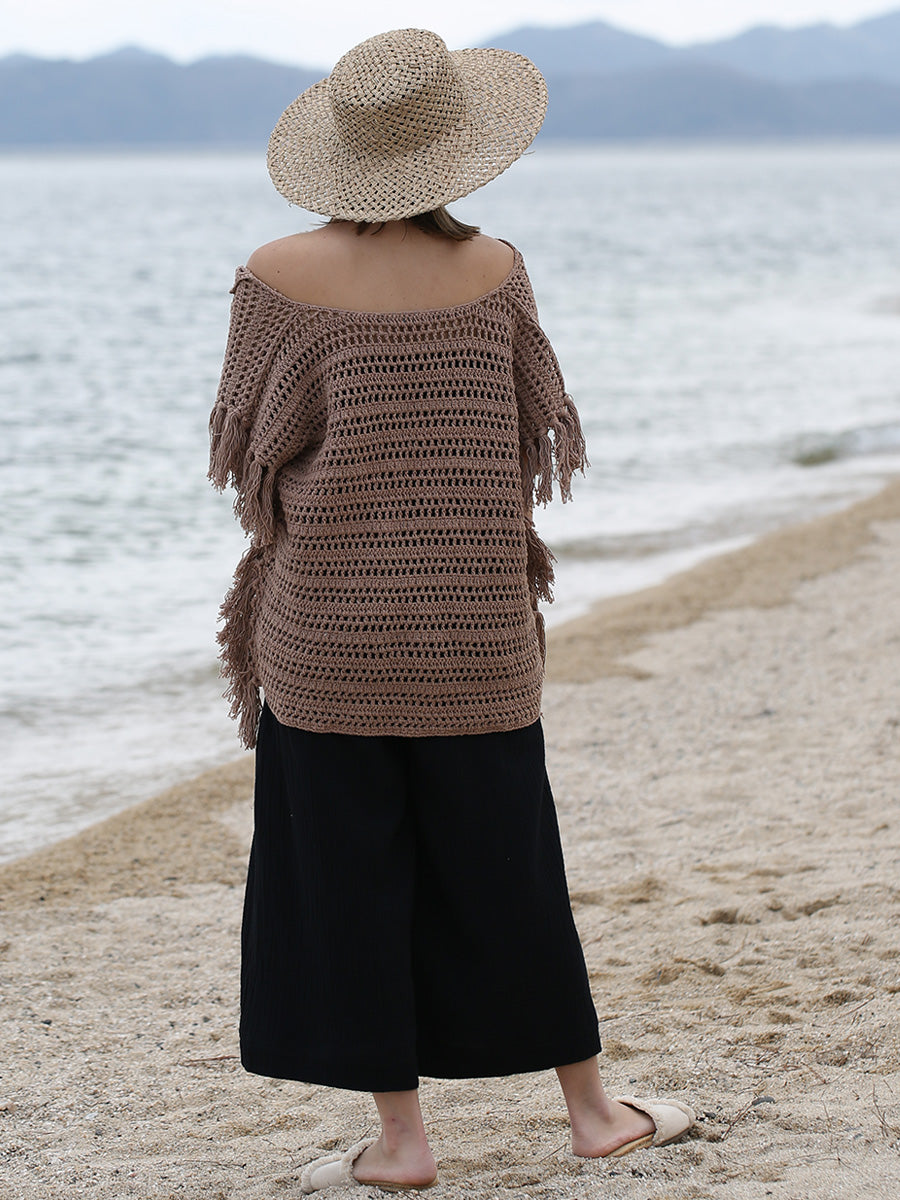 フリンジがアクセントになったお洒落なクロシェ編みカーディガン。