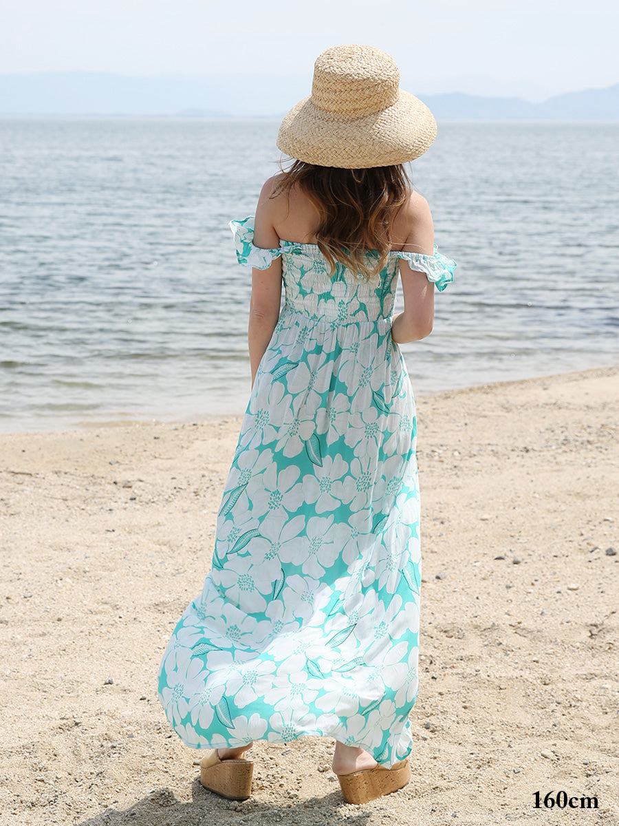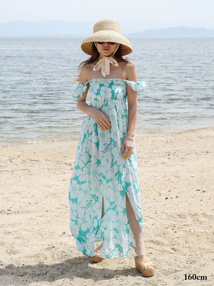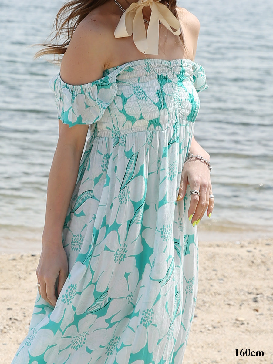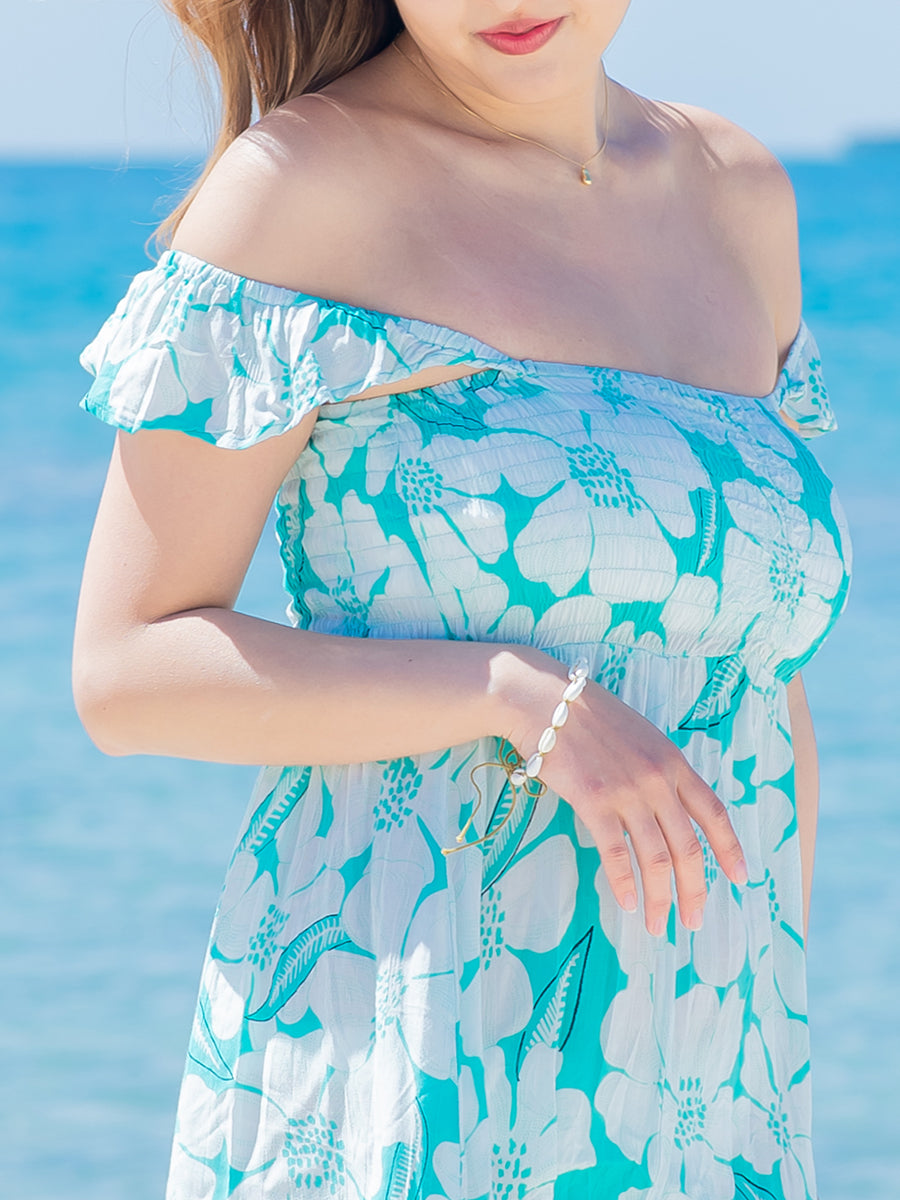 ターコイズの花柄マキシワンピースはビーチ・リゾートシーンで大活躍してくれます。
