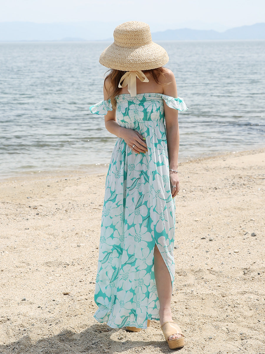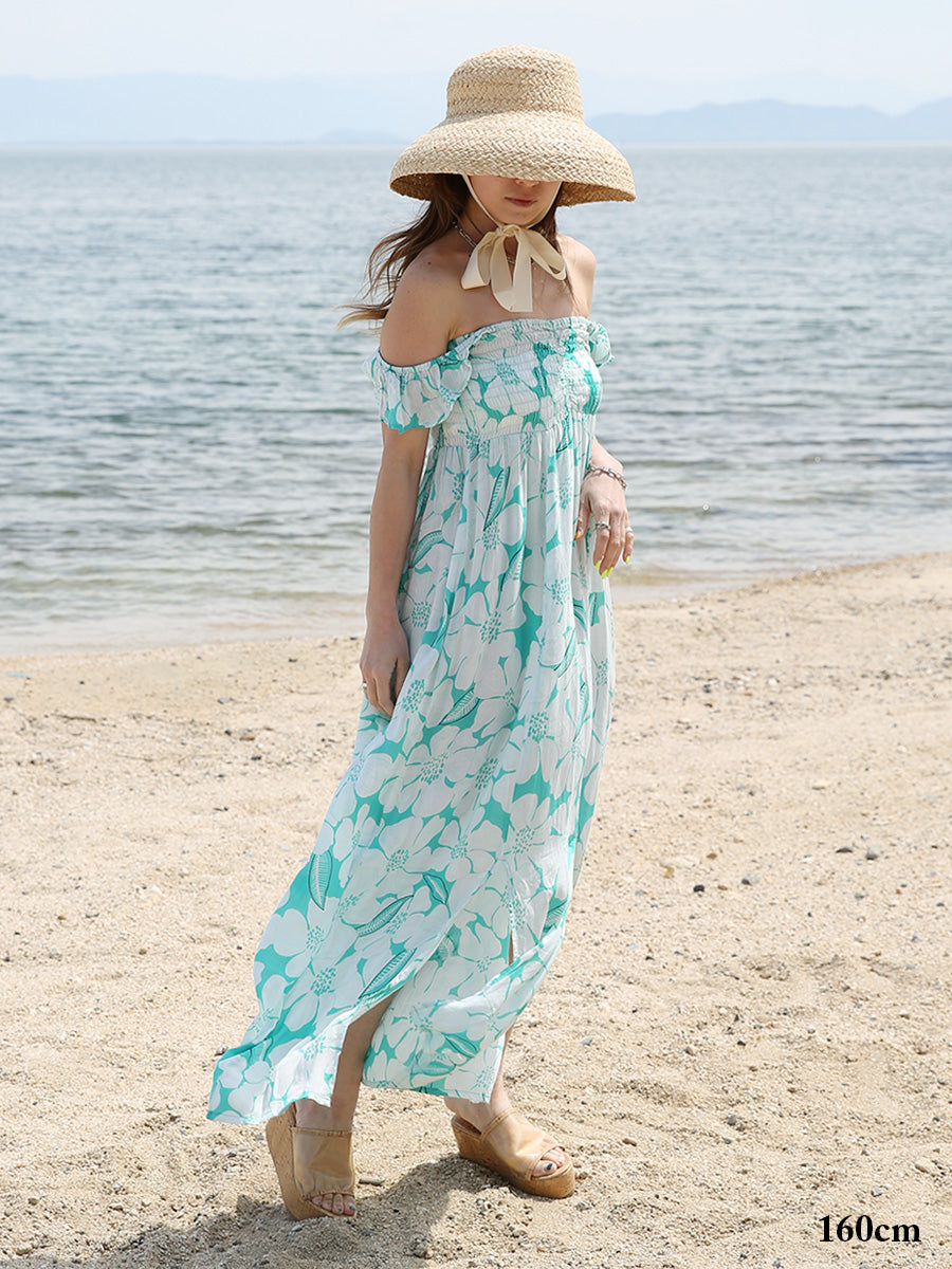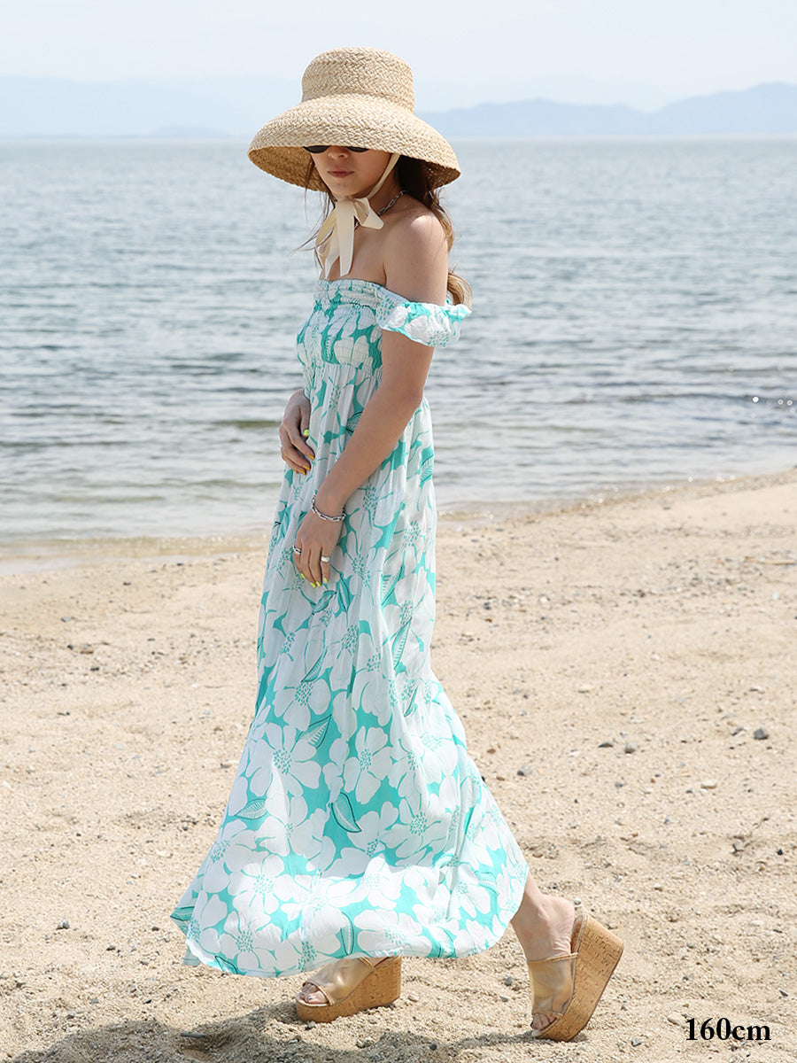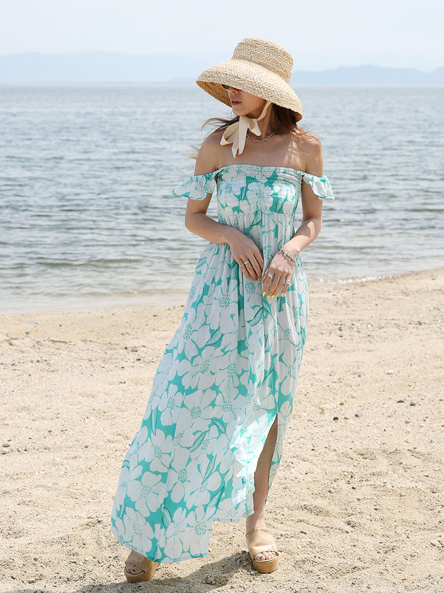 ターコイズの花柄マキシワンピースはビーチ・リゾートシーンで大活躍してくれます。