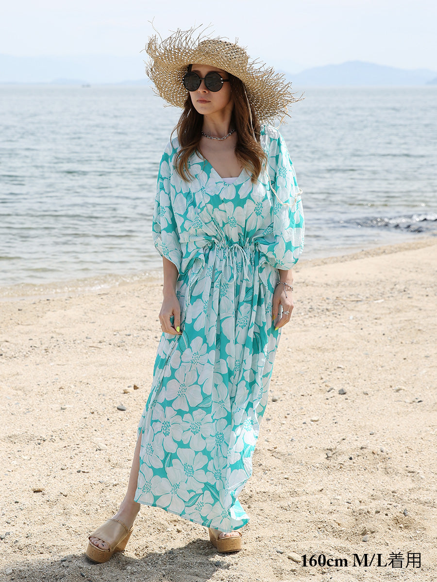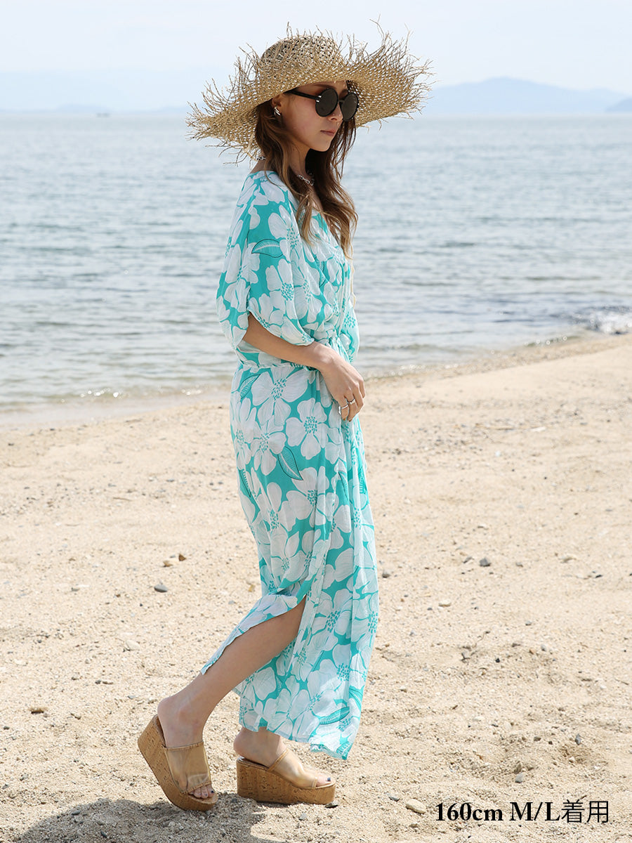 ビーチ・リゾートシーンで映えるターコイズ花柄ワンピースです。