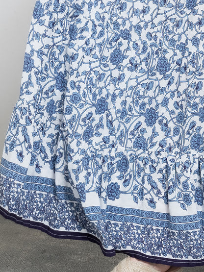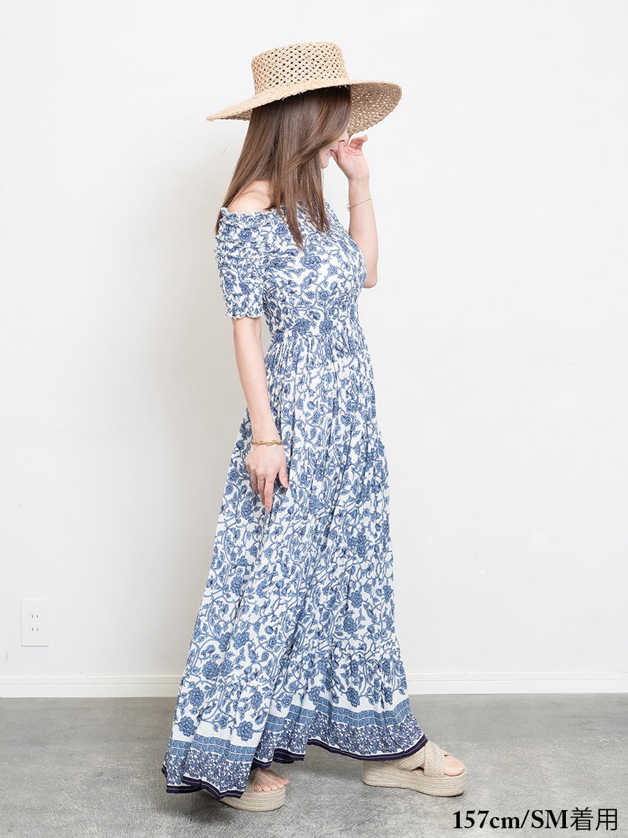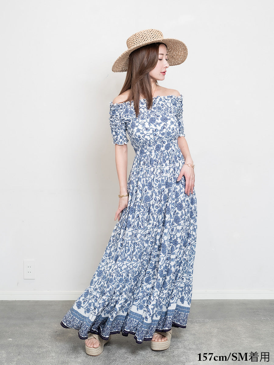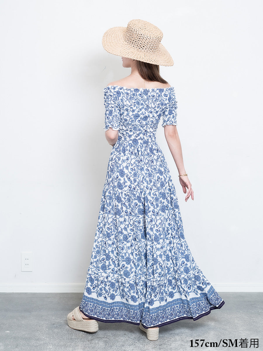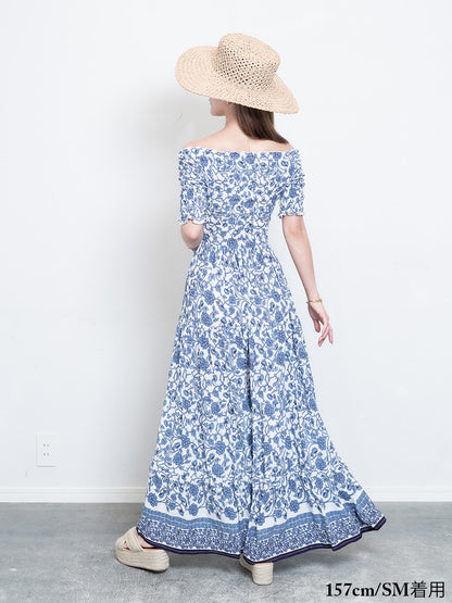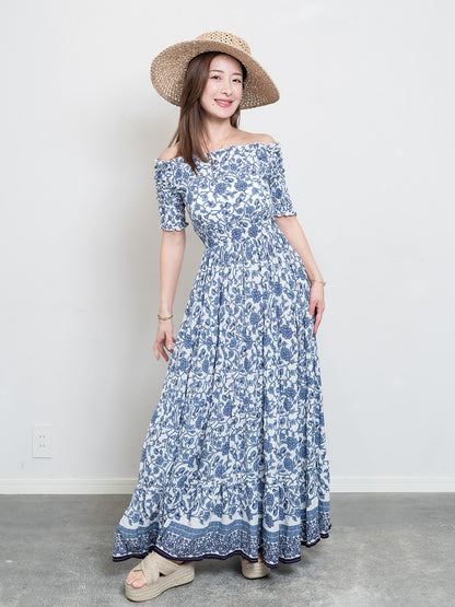 LAUT BLUE(ラウトブルー)ティアードオフショルロングワンピース/ブルー花柄