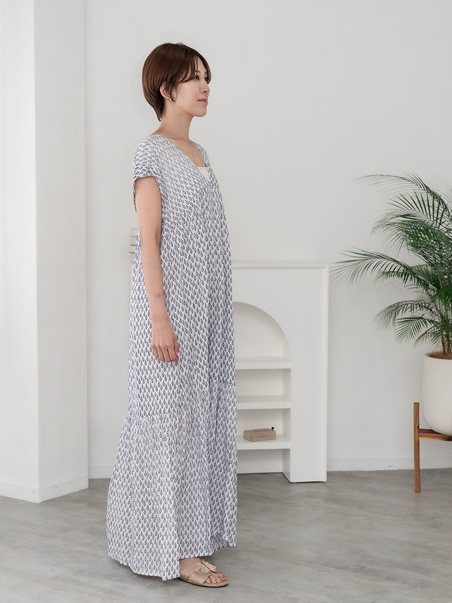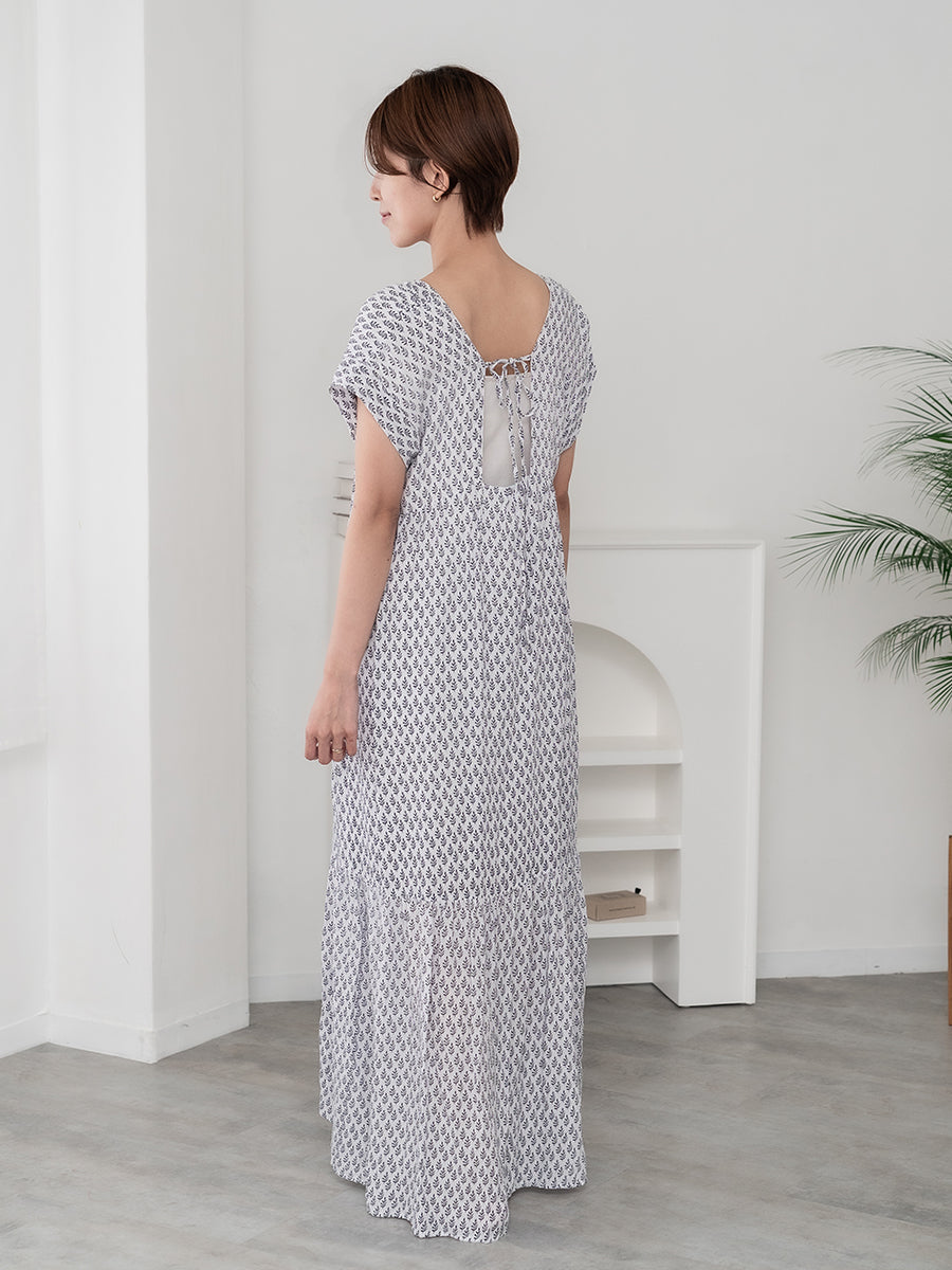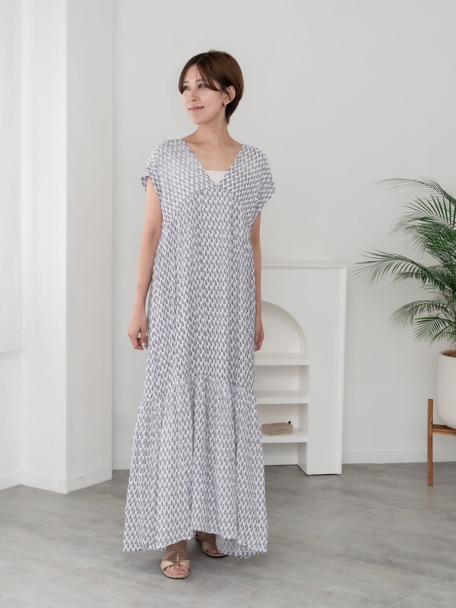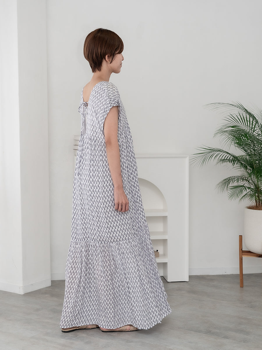 LAUT BLUE(ラウトブルー)フレンチスリーブティアードワンピース/リトルリーフ柄
