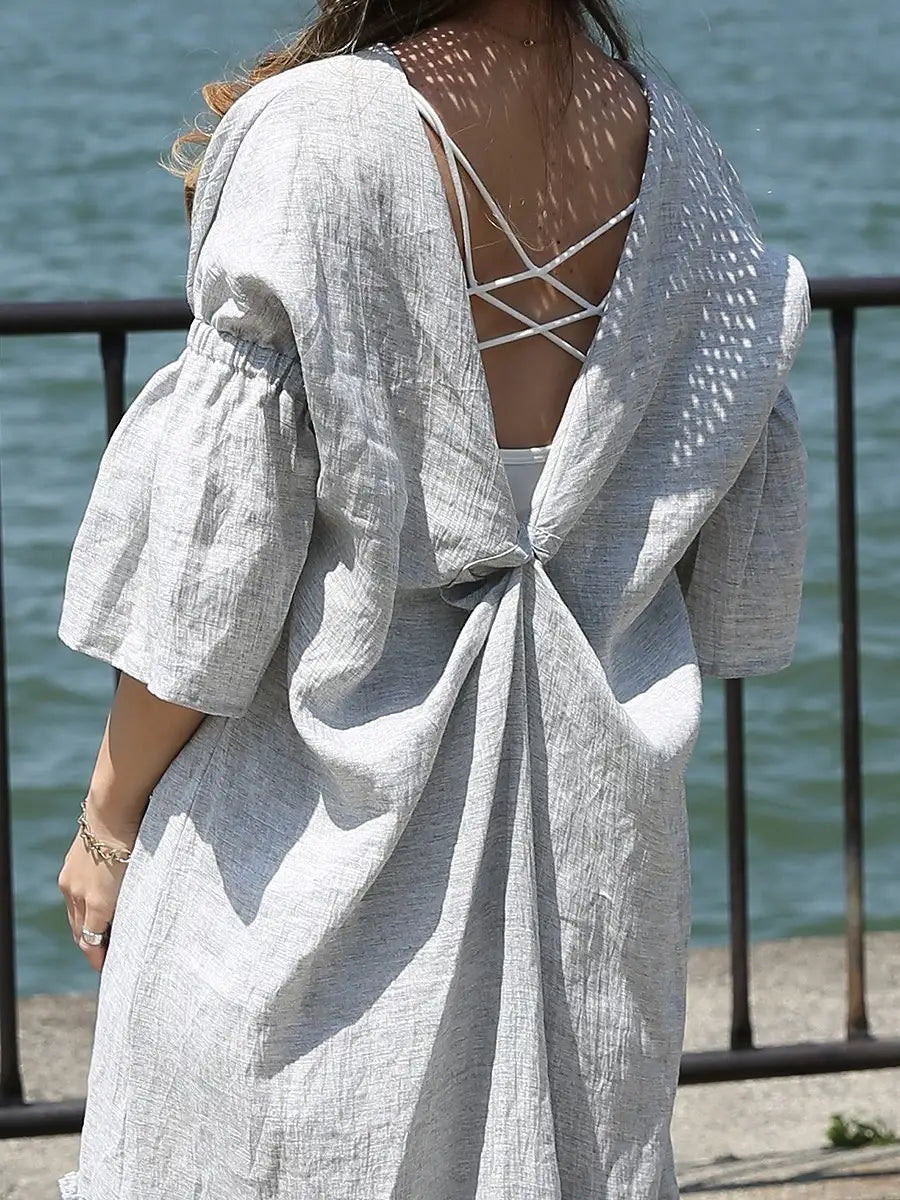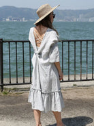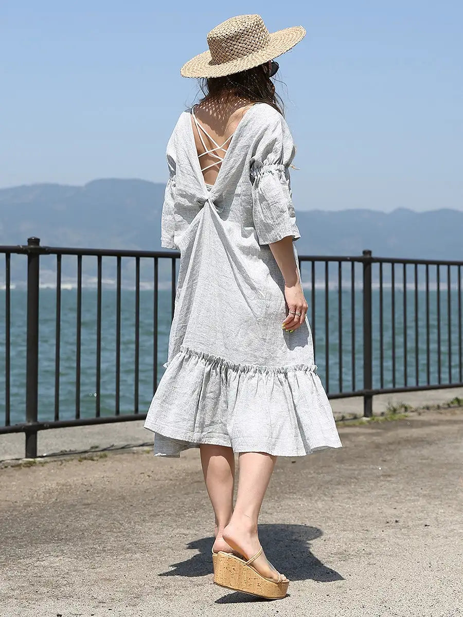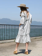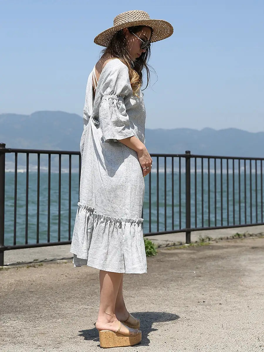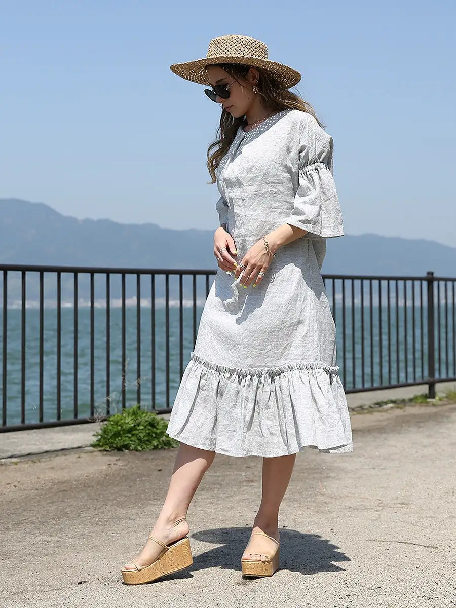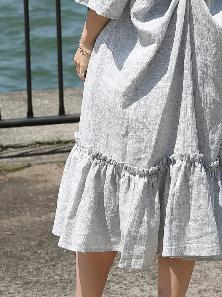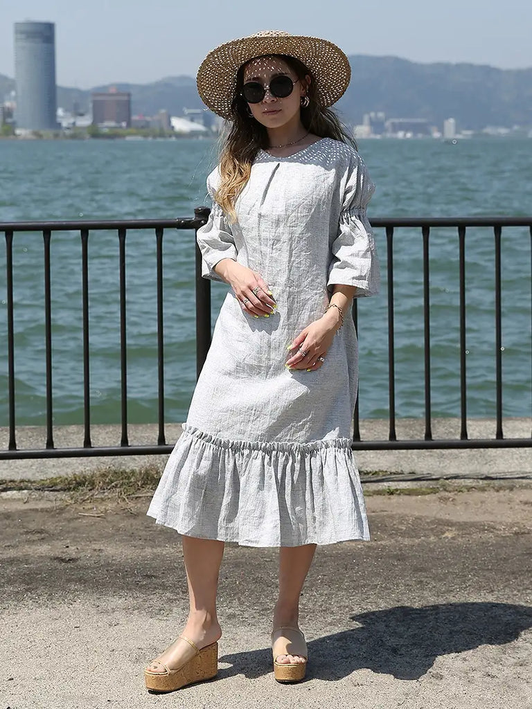 MOLABI(モラビ)近江ちぢみリネンフリル袖マキシワンピース/ライトグレー