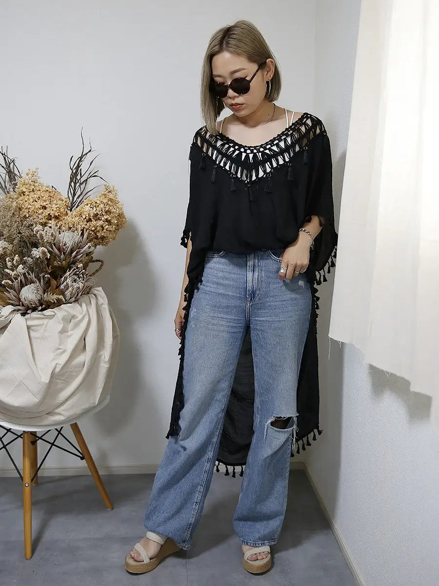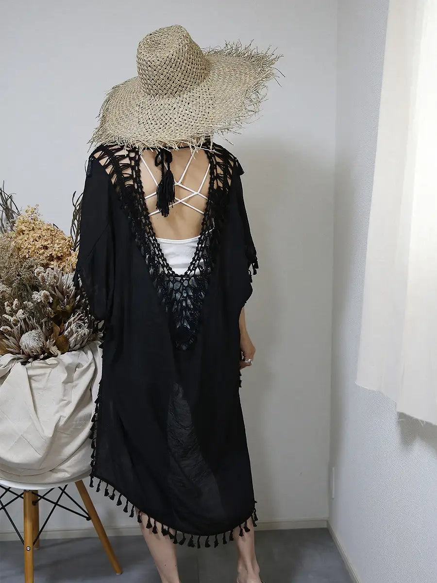 クロシェ編みがお洒落です。背中が大きく開いたデザインです。