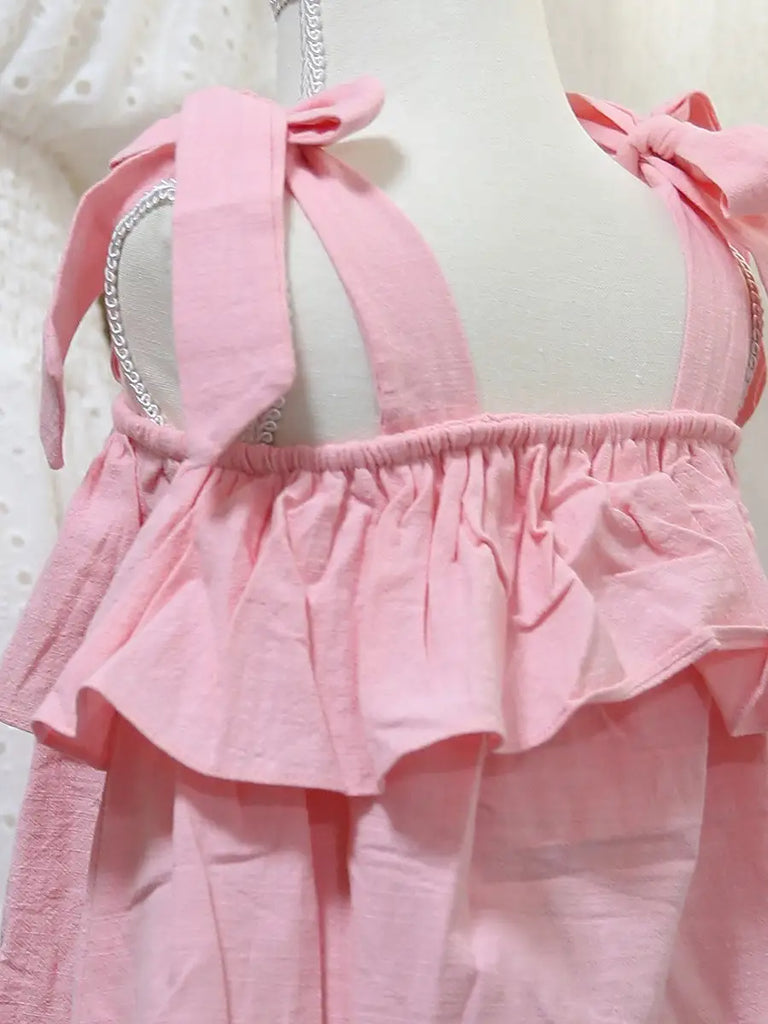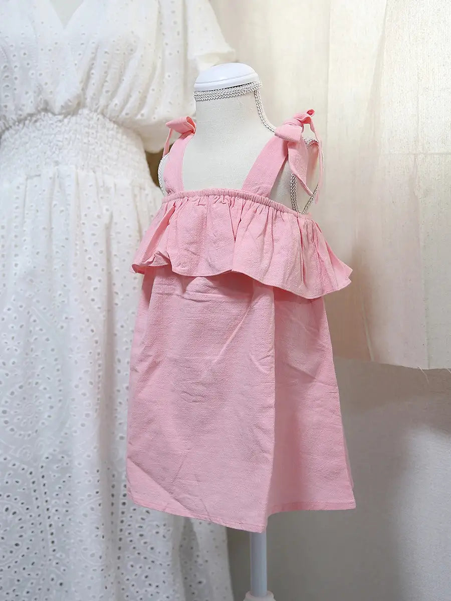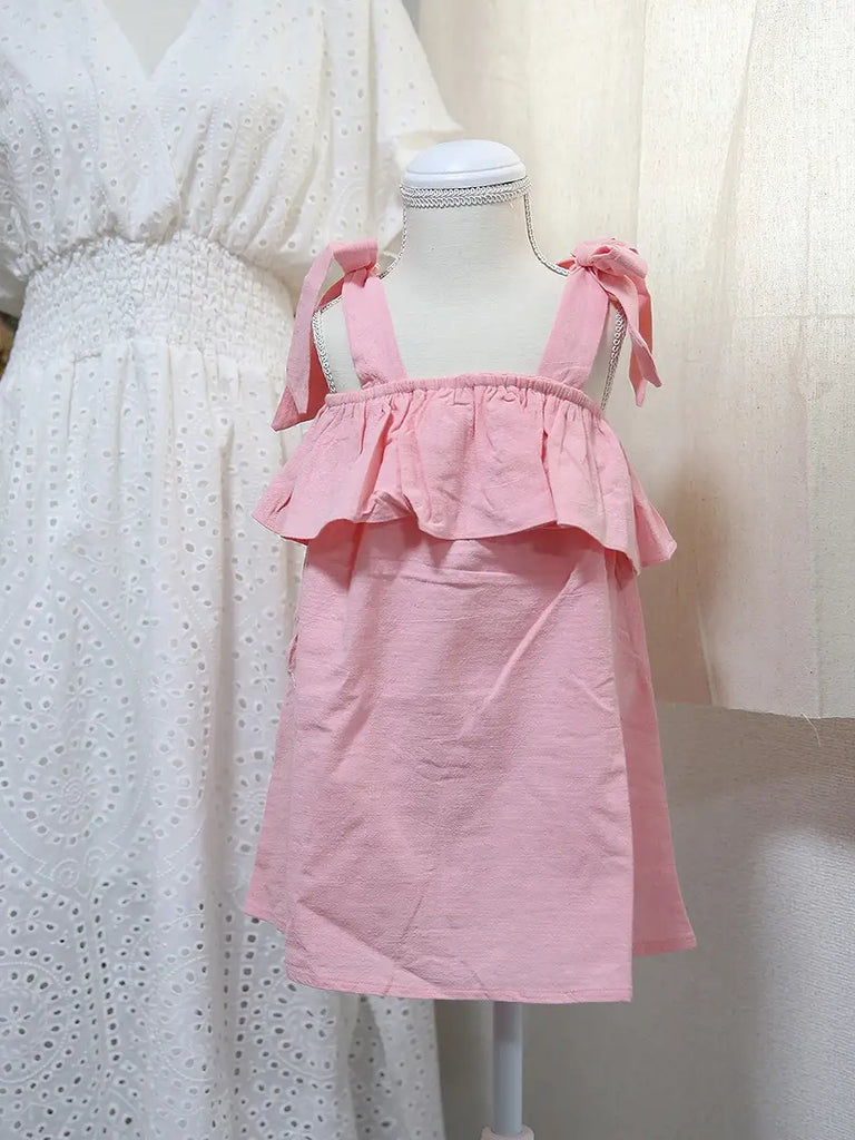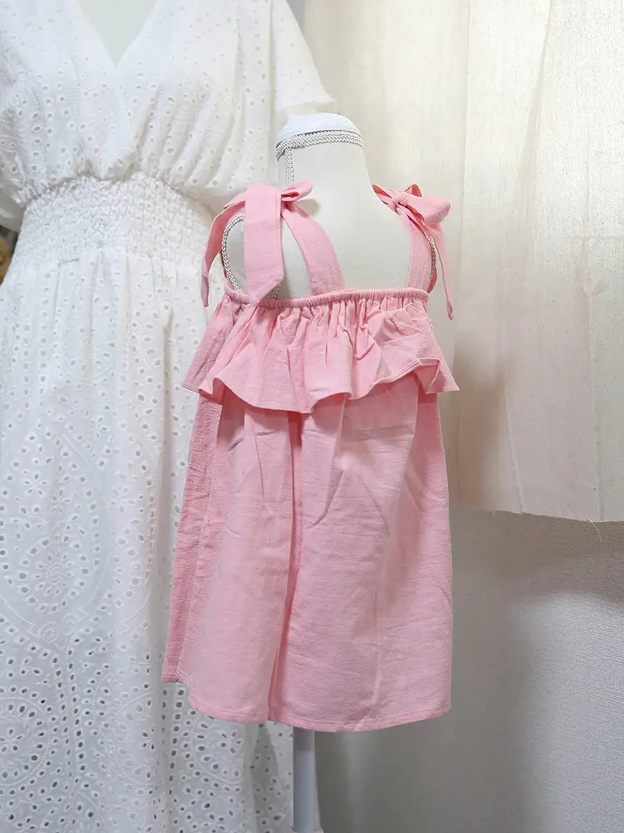 肩紐部分を結ぶリボンデザインの綿麻ワンピース。